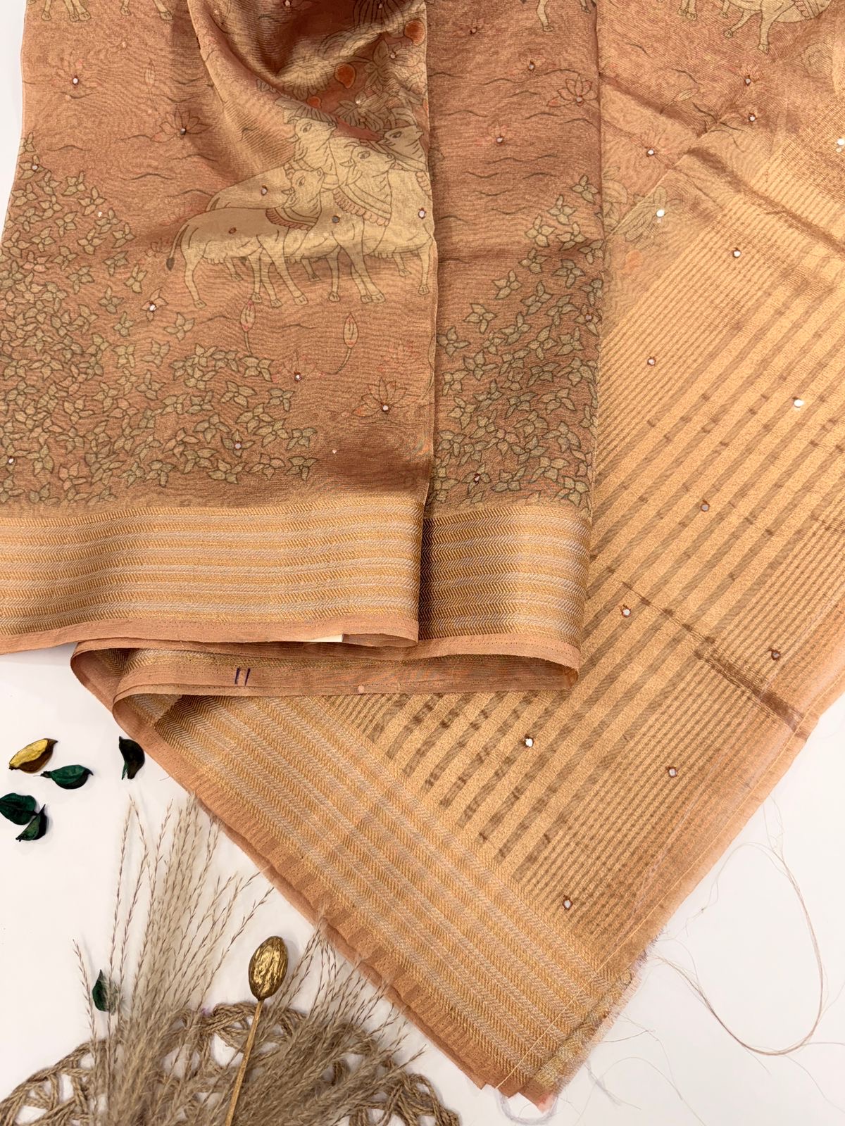 This exquisitely woven Banarasi saree in Cantaloupe features intricate printed motifs of cows, florals, and foliage, symbolizing prosperity and tradition. Crafted in fine silk with delicate zari stripes on the border and subtle sequin embellishments, it beautifully balances heritage artistry with contemporary elegance. Ideal for festive occasions, weddings, and cultural celebrations.