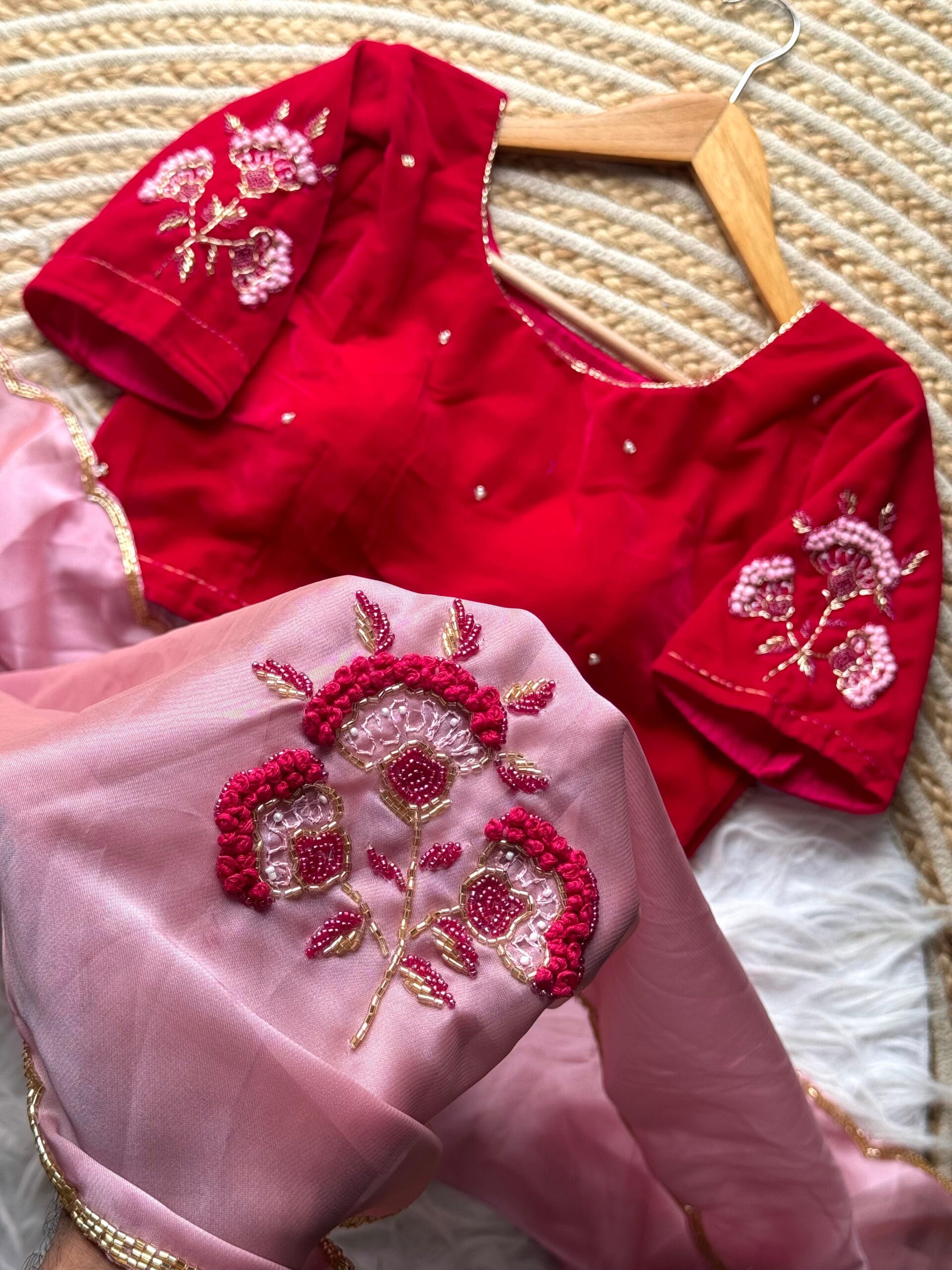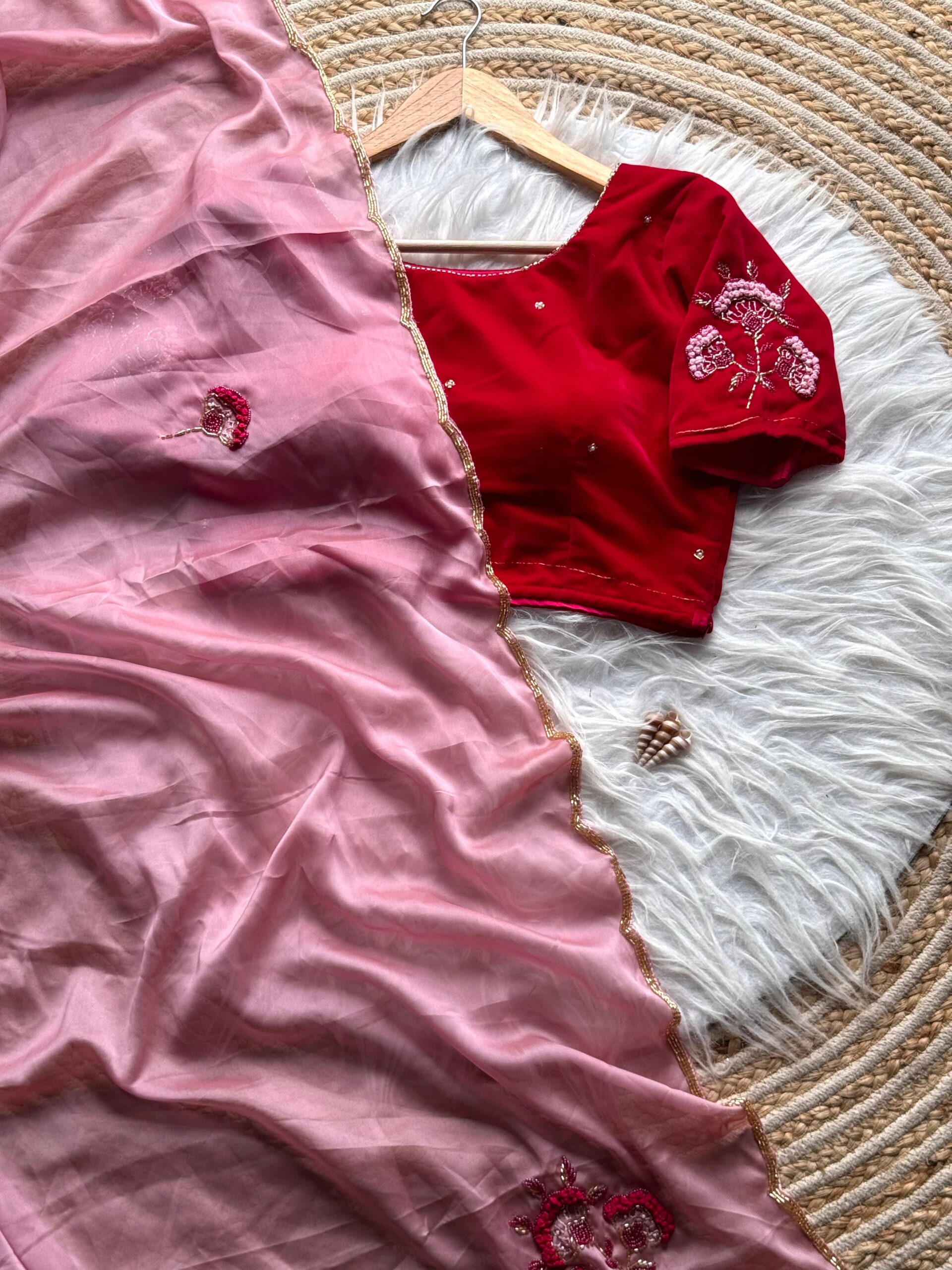 Exude grace with this beautifully hand crafted embroidered Pure Georgette organza saree paired with a luxurious velvet blouse. The soft dusty pink saree is adorned with delicate floral embroidery in shades of red, complementing its subtle elegance. The scalloped edges with golden detailing add a refined touch, making it perfect for festive events or special occasions. Paired with a rich red velvet blouse featuring intricate sleeve embroidery, this ensemble strikes the perfect balance between traditional and contemporary style. Ideal for making a statement with minimal yet sophisticated details!