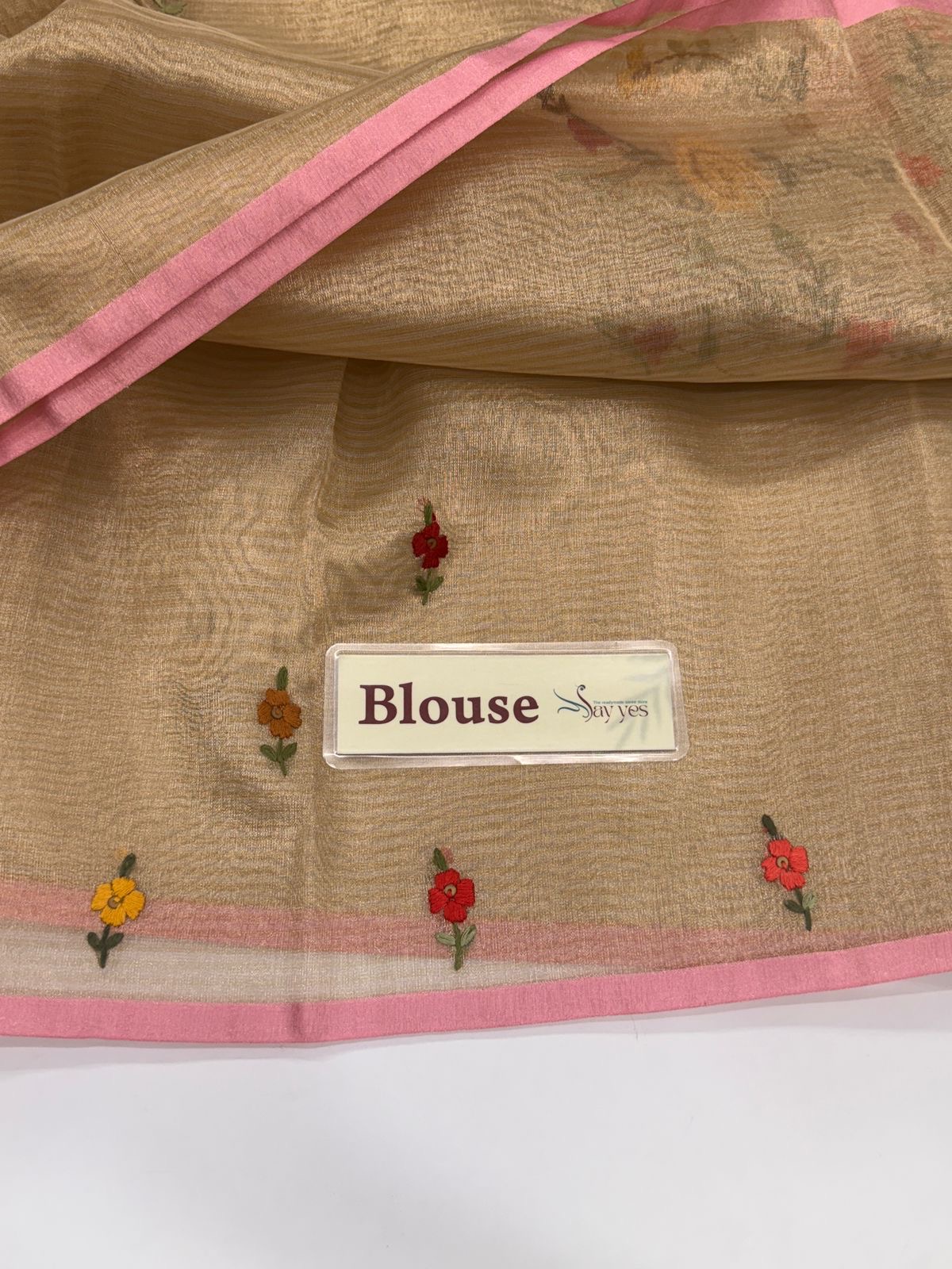 Leah is a delicate blend of timeless charm and effortless sophistication. Crafted in airy organza, its muted beige body creates a canvas of understated elegance, while the pallu blooms with vibrant floral embroidery in shades of scarlet, mustard, and green — like a garden in full song. The subtle golden-yellow border with playful tassels adds a touch of warmth and festivity, making Leah perfect for both daytime celebrations and evening soirees.