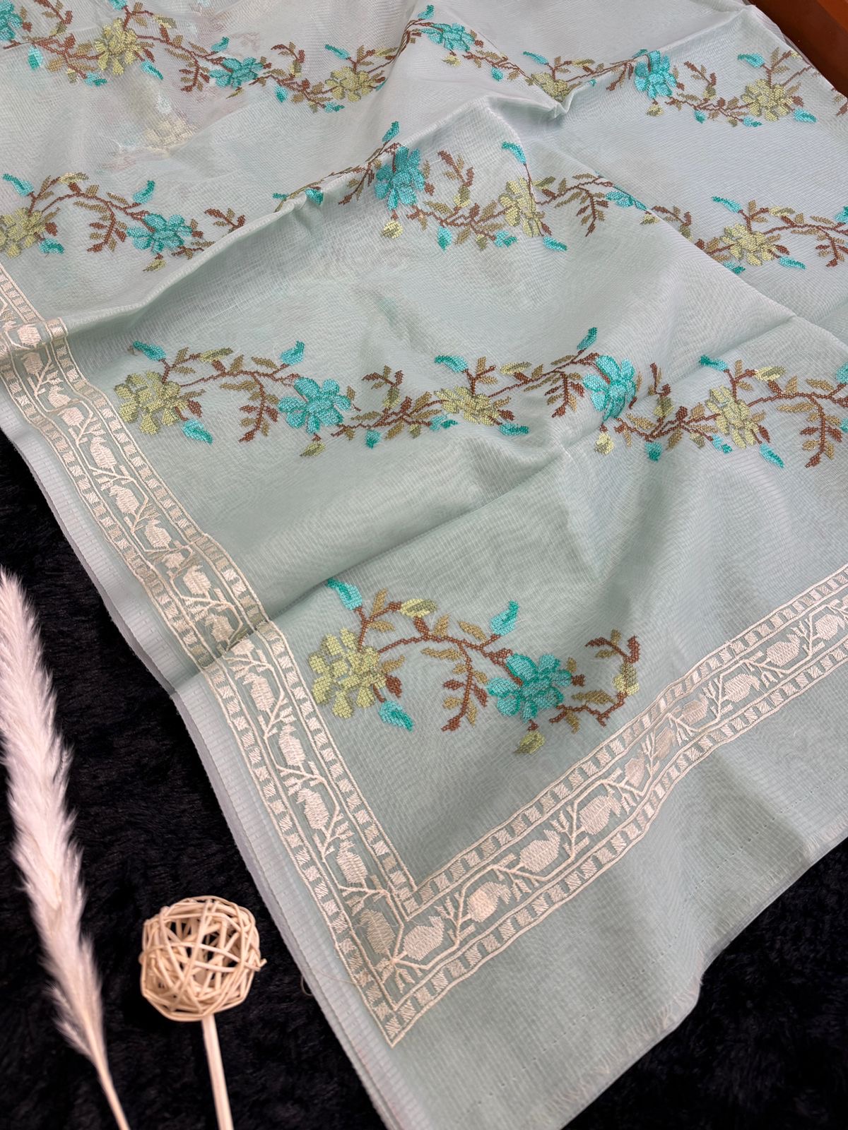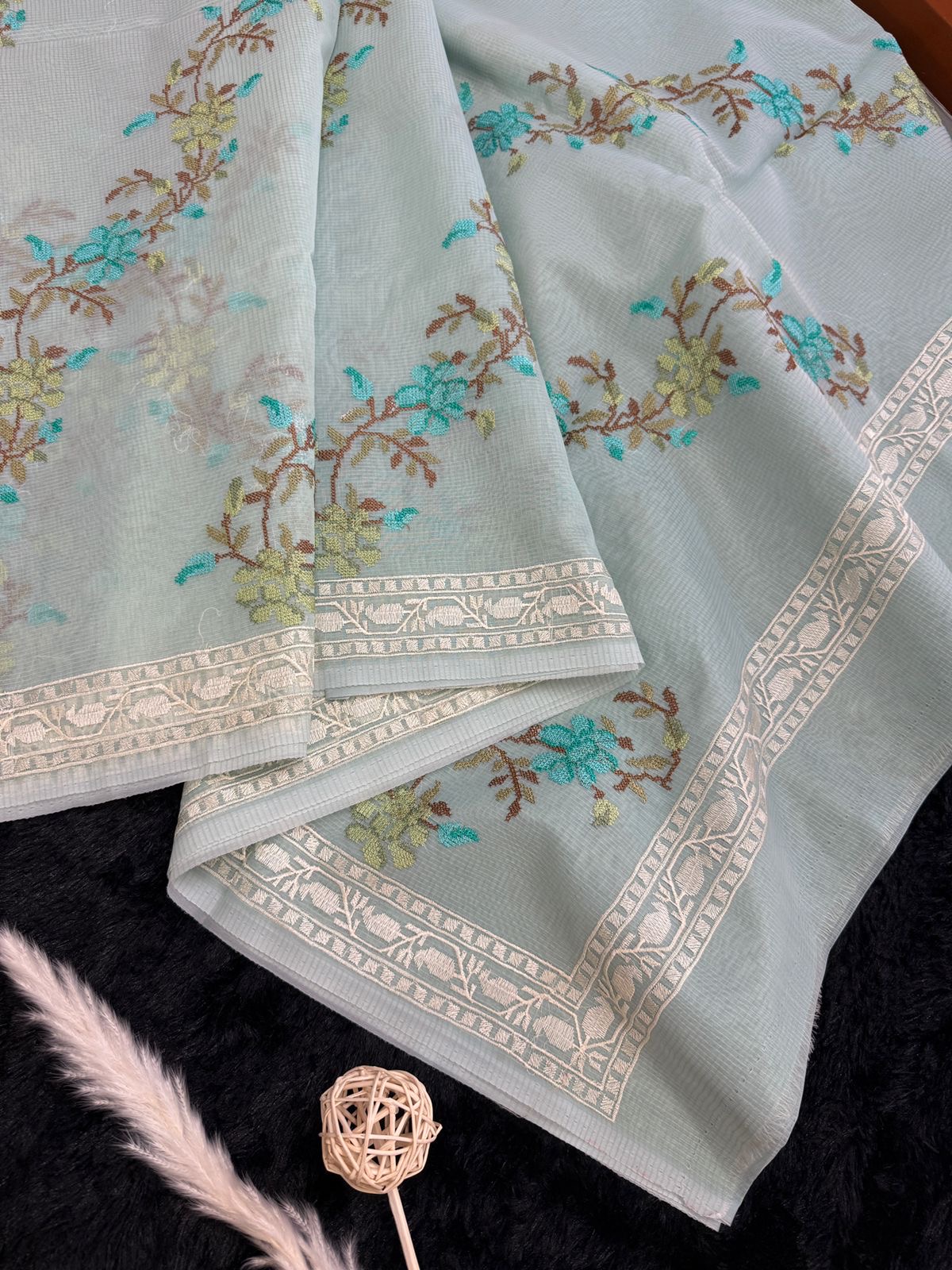 Light blue Kota silk saree with florals embroidered