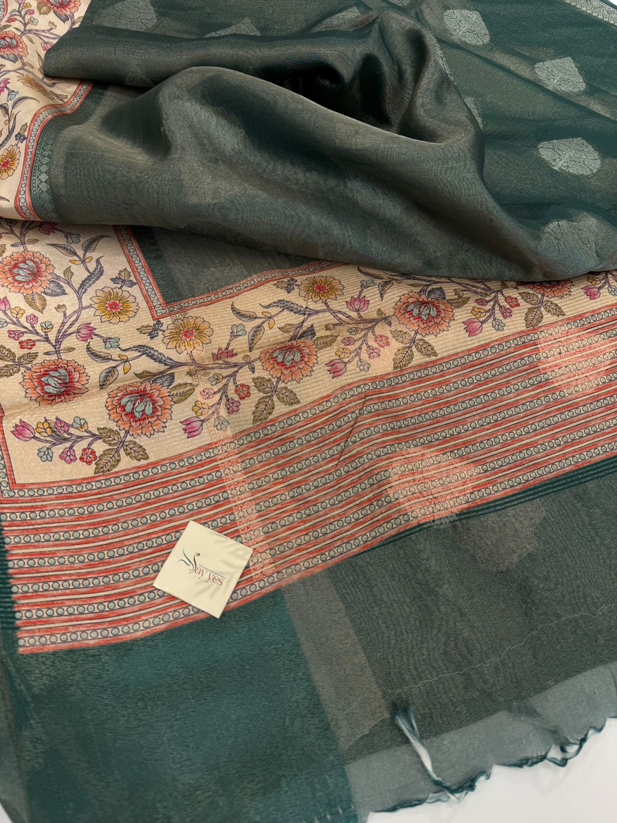 Pallu/Endpiece: Continuation of the woven jacquard with coordinated tassels in dual-tone green for a handcrafted finish