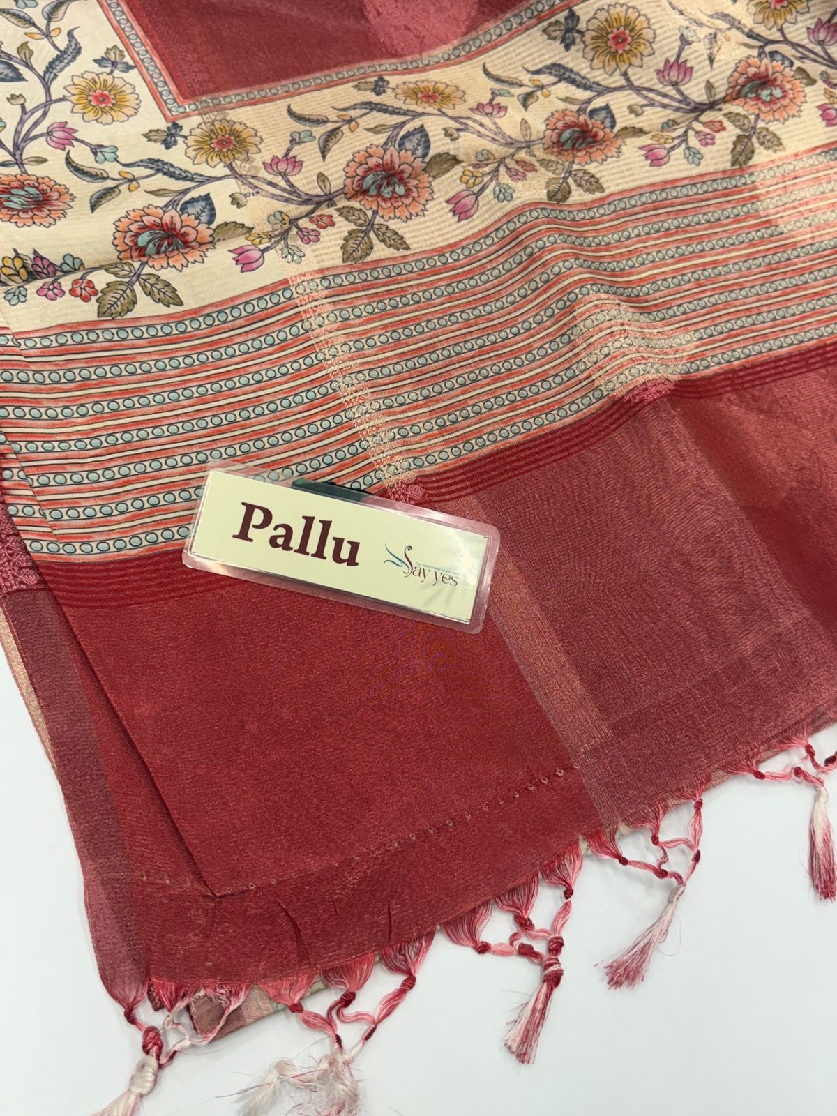 Pallu/Endpiece: Continuation of the woven jacquard with coordinated tassels in dual-tone green for a handcrafted finish