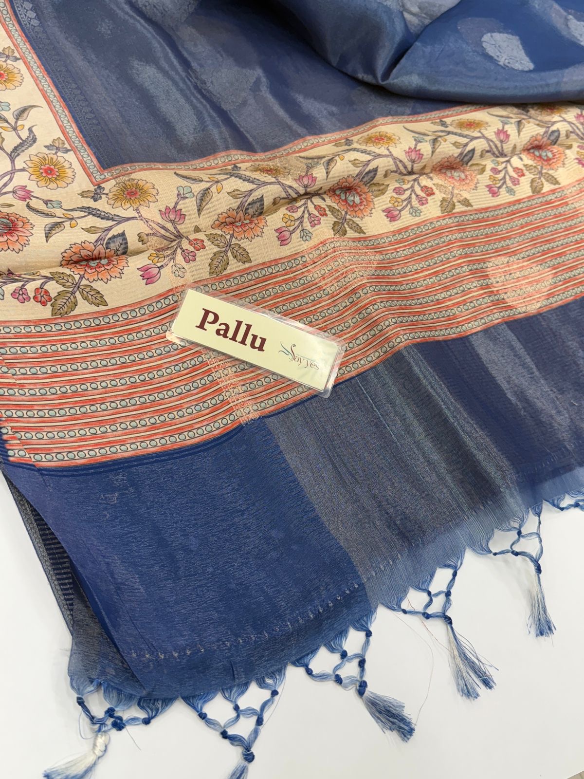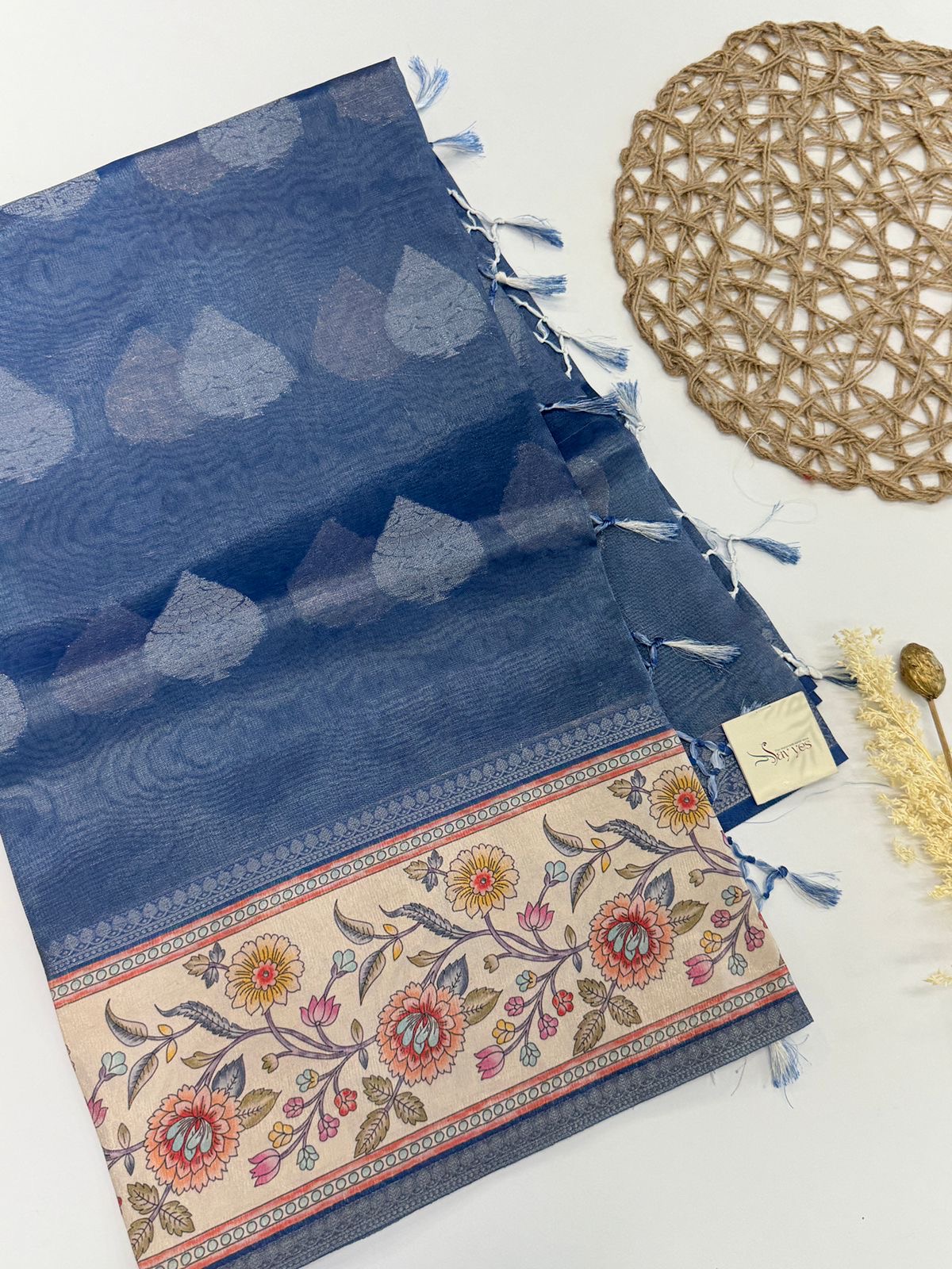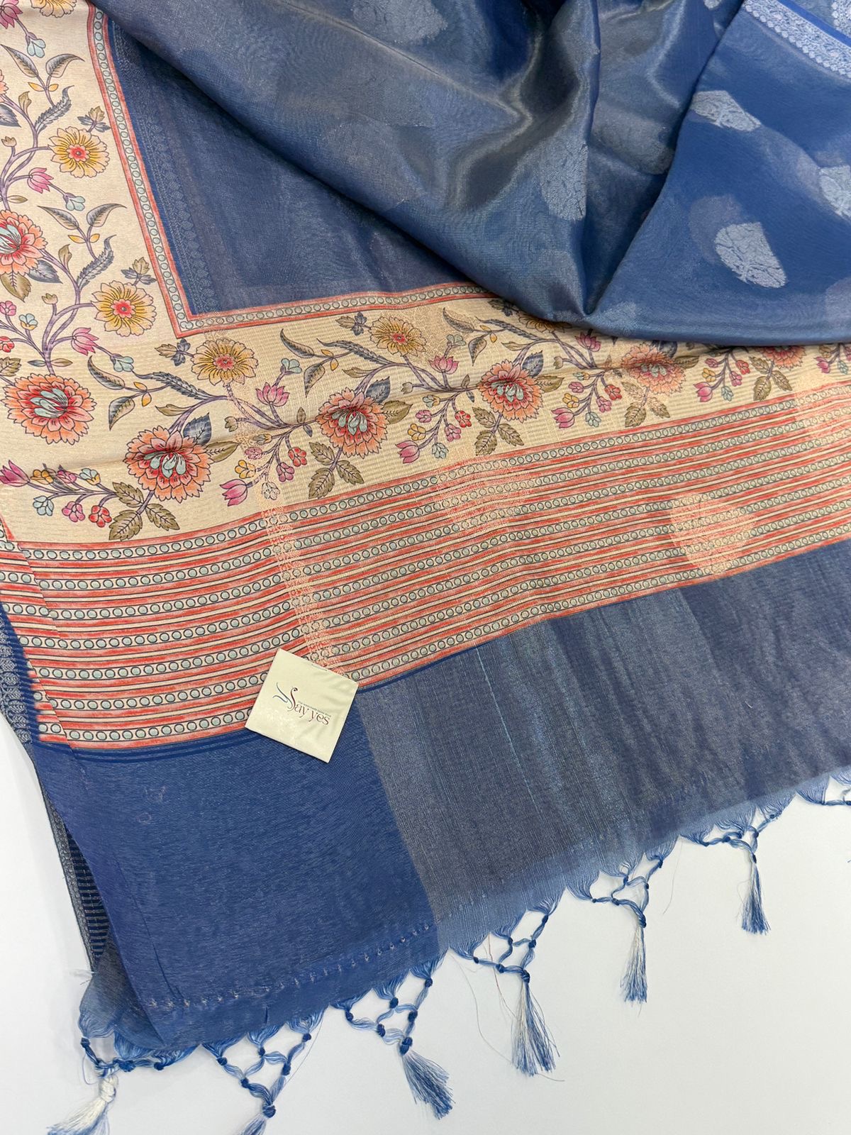 Base Color: Dusty royal blue with self-woven motifs in lighter blue tones