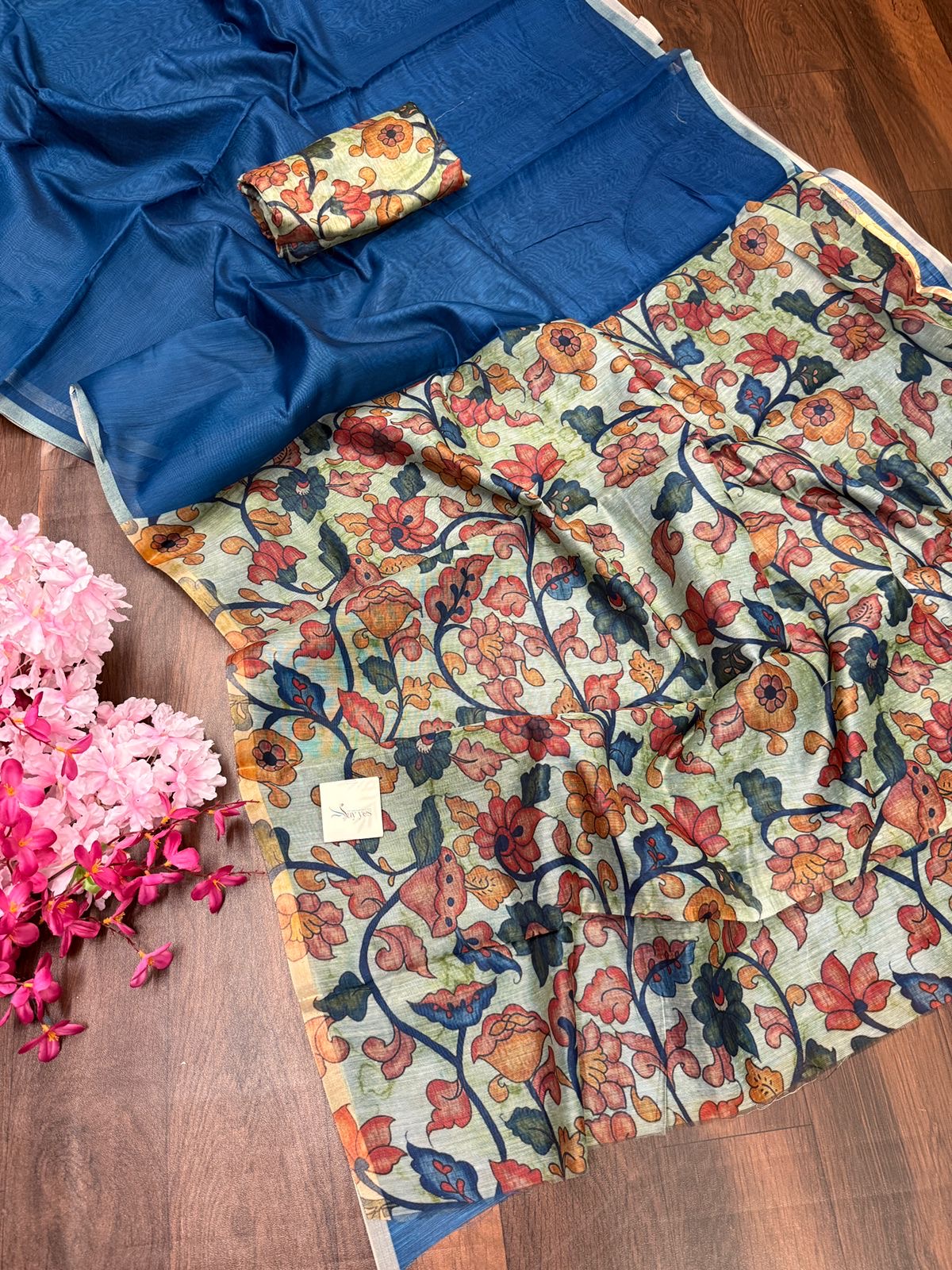 Immerse yourself in timeless elegance with this Kalamkari printed linen cotton saree, a fusion of traditional craft and modern comfort. Crafted from soft, breathable crepe cotton, this saree features a rich deep maroon base adorned with classic Ajrakh motifs in intricate beige and black patterns.