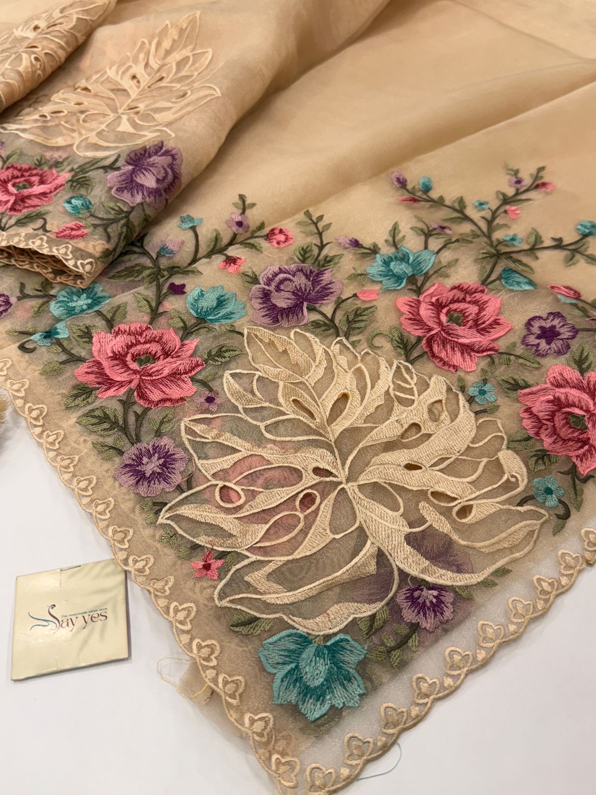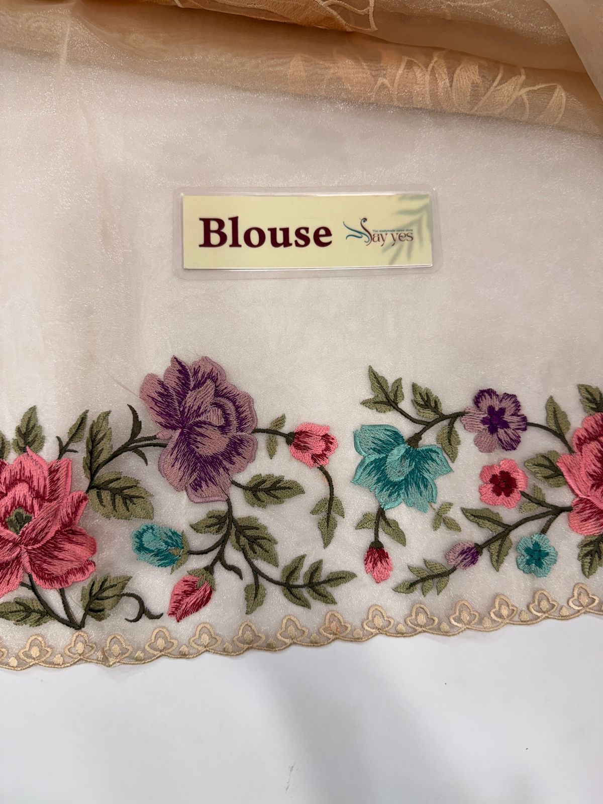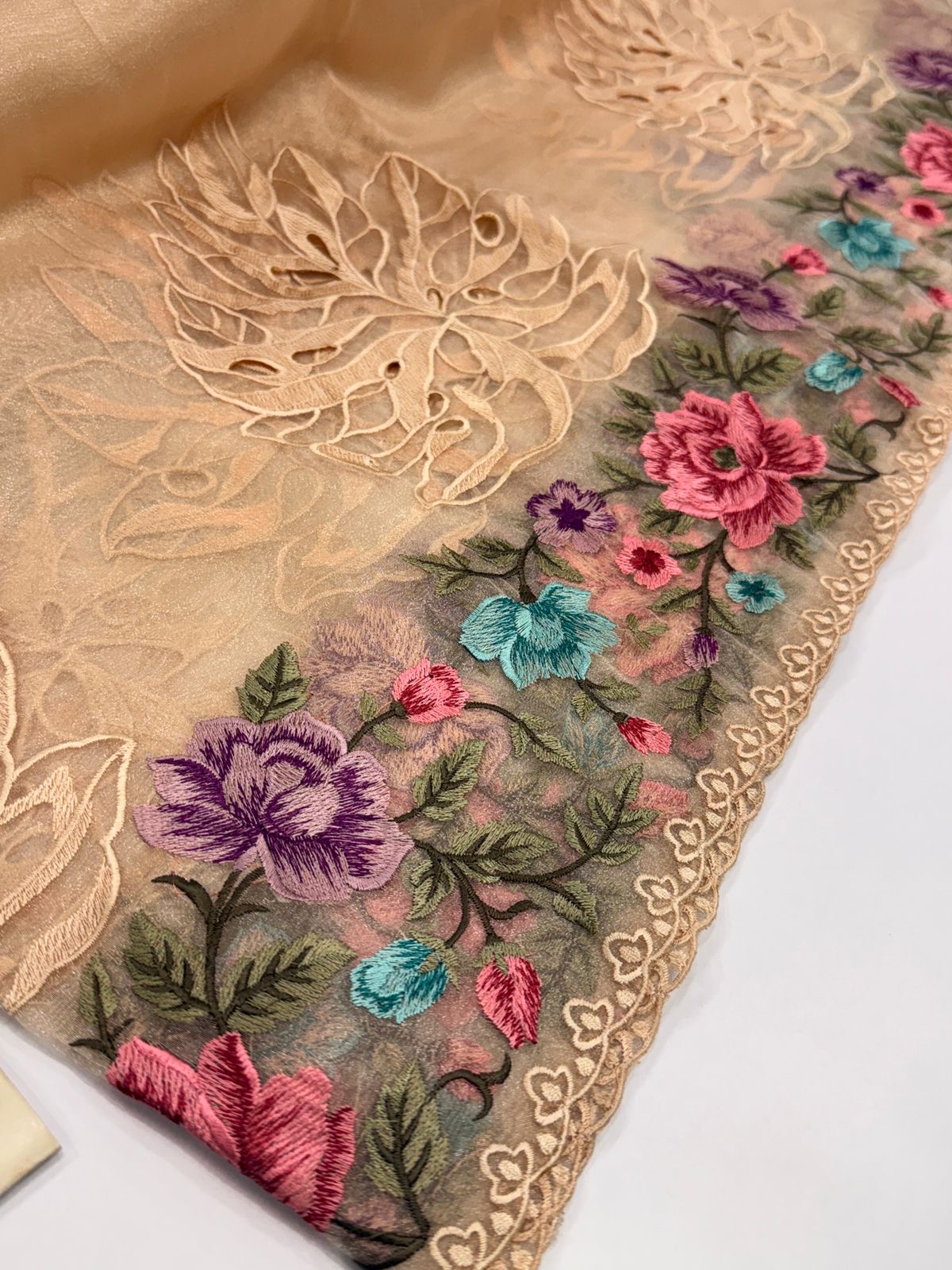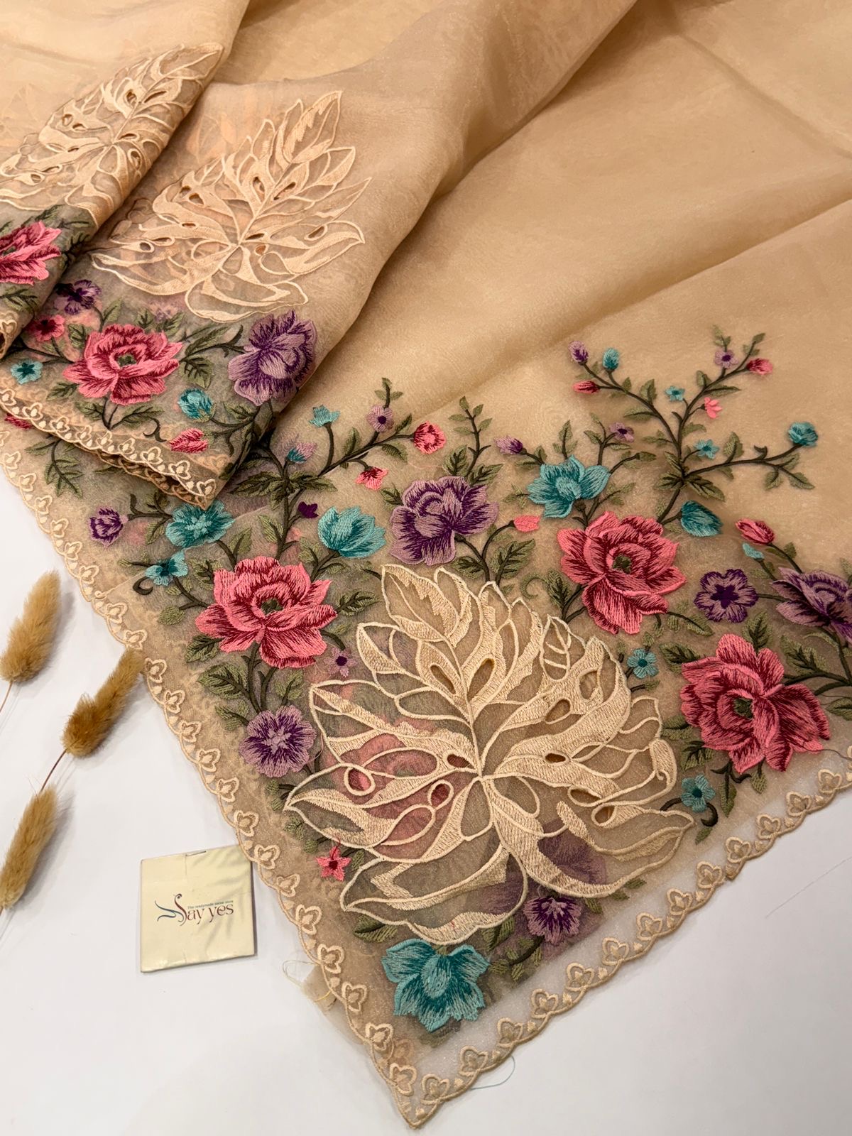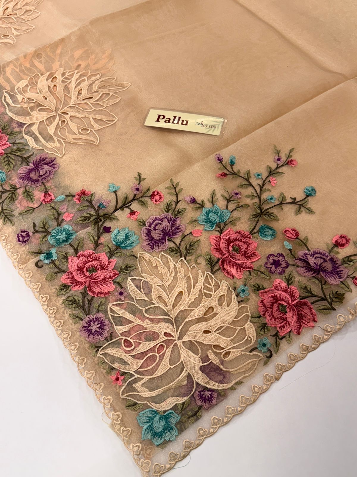 Crafted in pure organza, this saree comes alive with delicate multicolored floral embroidery that trails gracefully along the border. The pallu features exquisite cutwork maple leaf motifs, lending it an intricate yet airy finish. Set in a soft burnished rose tone, the base acts as the perfect canvas for pastel blossoms in teal, lavender, and pink, making the drape both elegant and vibrant. Lightweight, sheer, and graceful, this piece is ideal for evening soirees and festive gatherings where sophistication meets charm.