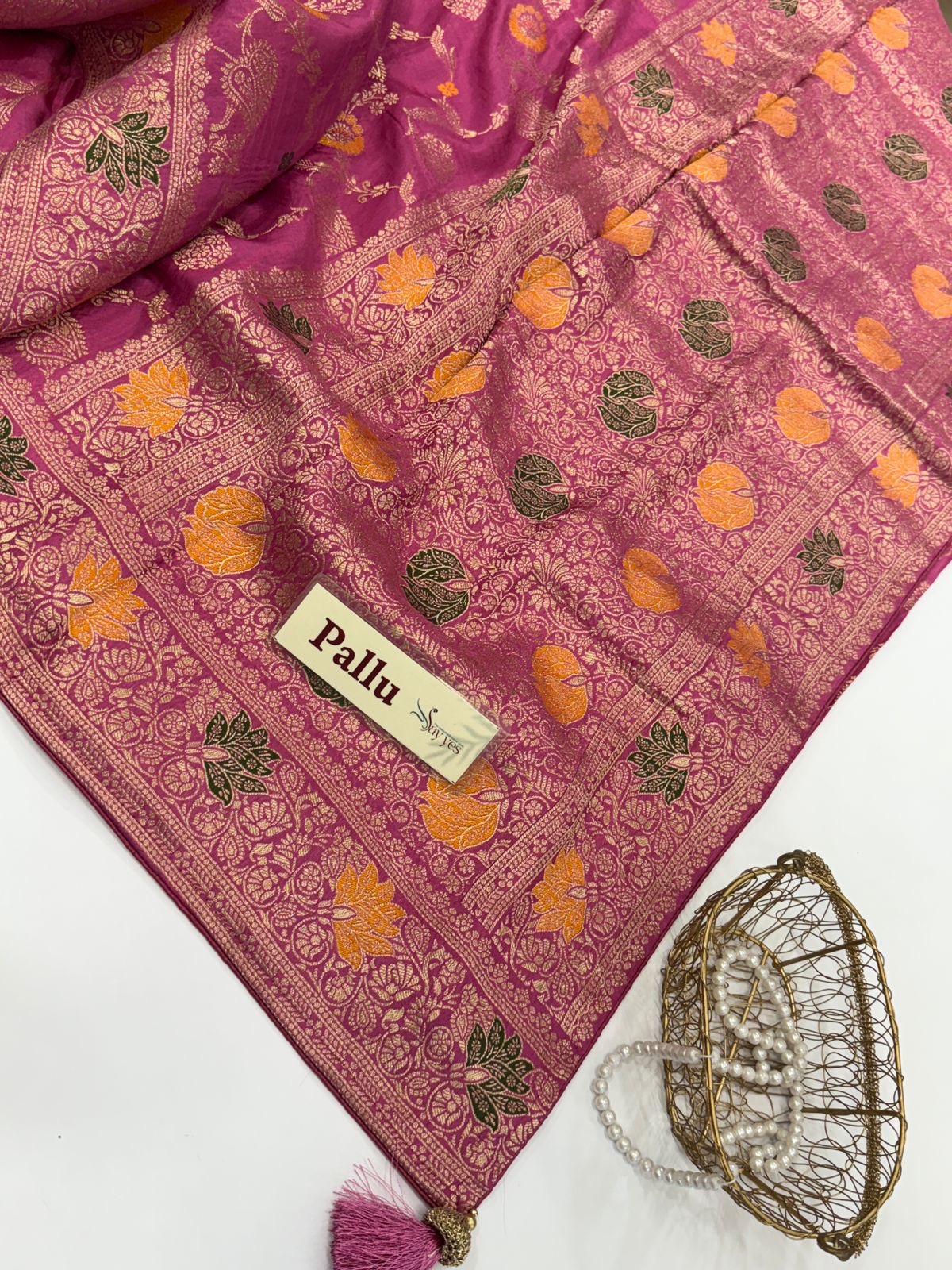 Woven with precision, its delicate floral and paisley patterns shimmer gently, adding just the right touch of grandeur. Lightweight yet regal, this saree is perfect for weddings, festive gatherings, or when you want to make tradition look effortlessly modern.