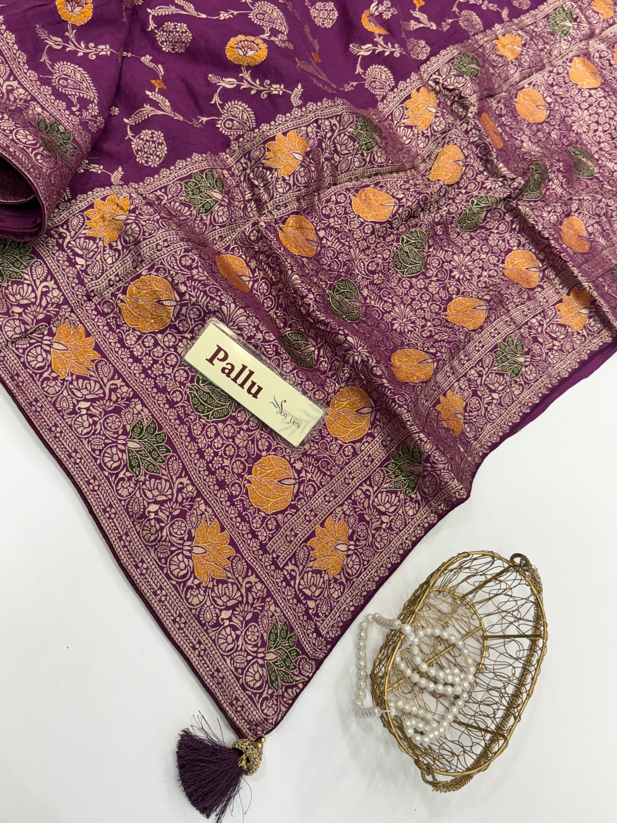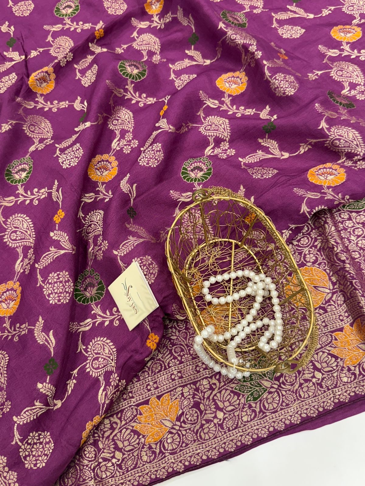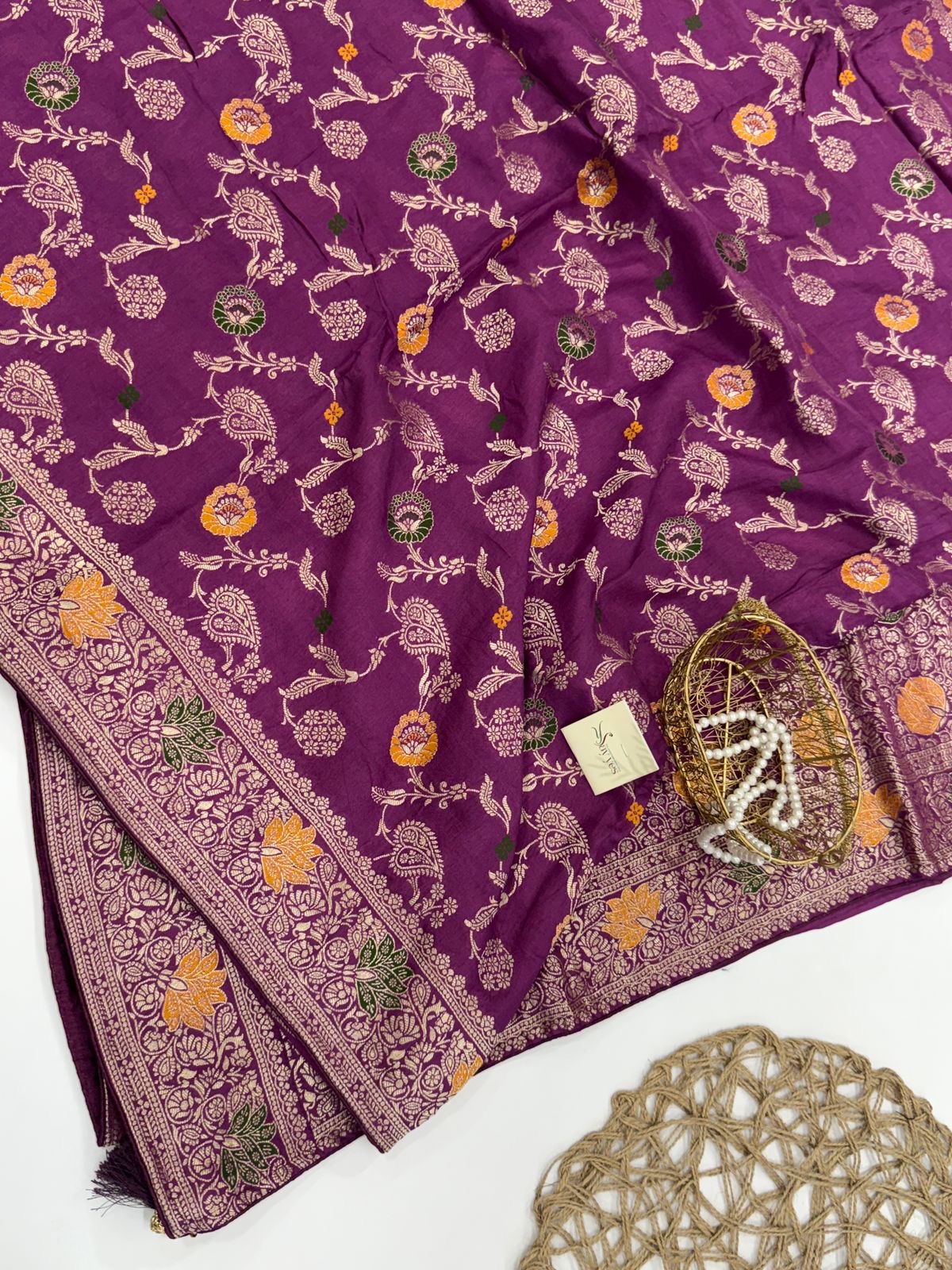 Woven with precision, its delicate floral and paisley patterns shimmer gently, adding just the right touch of grandeur. Lightweight yet regal, this saree is perfect for weddings, festive gatherings, or when you want to make tradition look effortlessly modern.