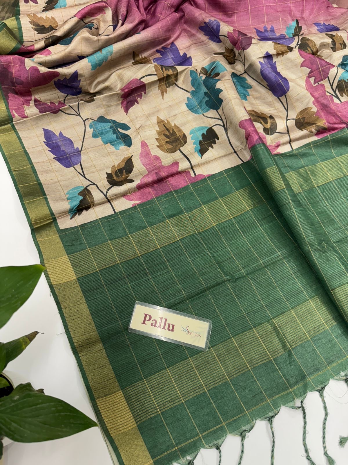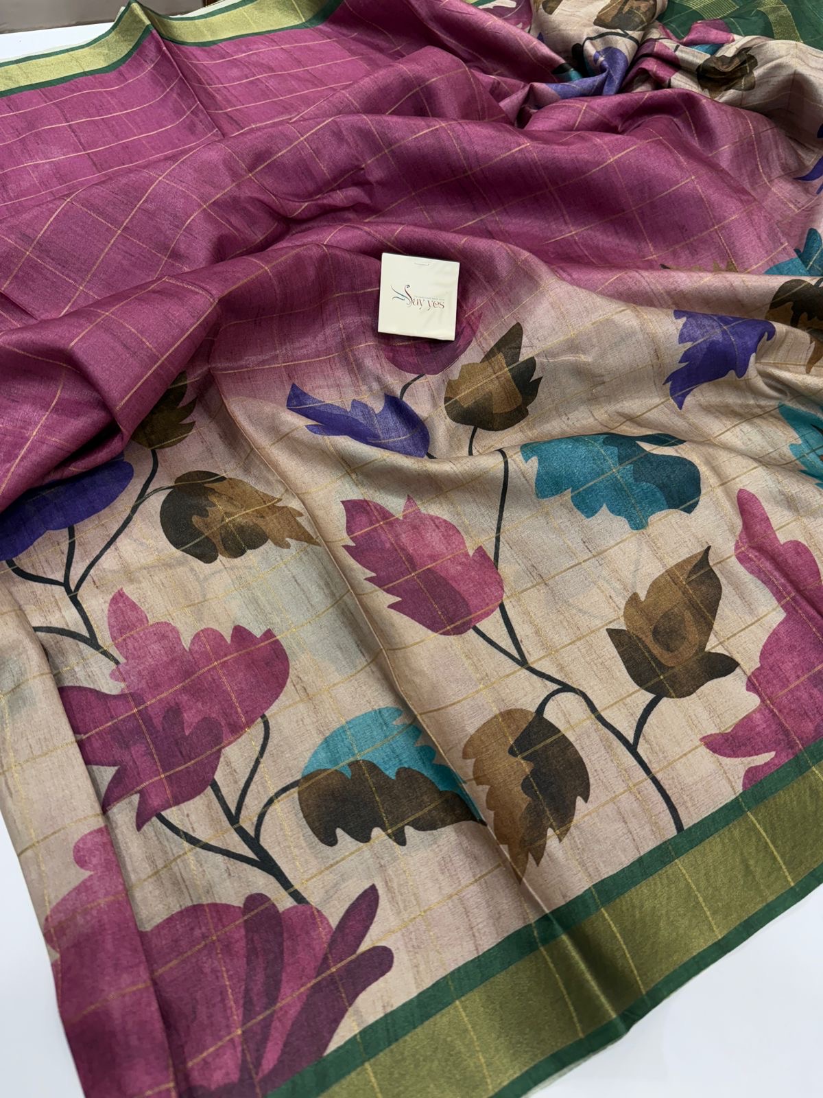 Step into timeless elegance with our handcrafted Chanderi silk saree, where tradition meets effortless grace. The body comes adorned with contemporary maple leaves prints, balanced beautifully with a rich zari woven border. Finished with Zari woven stripes on a contrast bast for pallu detailing, this saree carries both sophistication and festive charm.