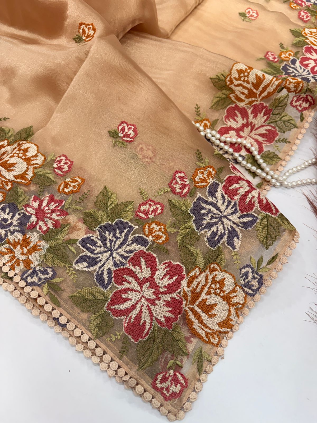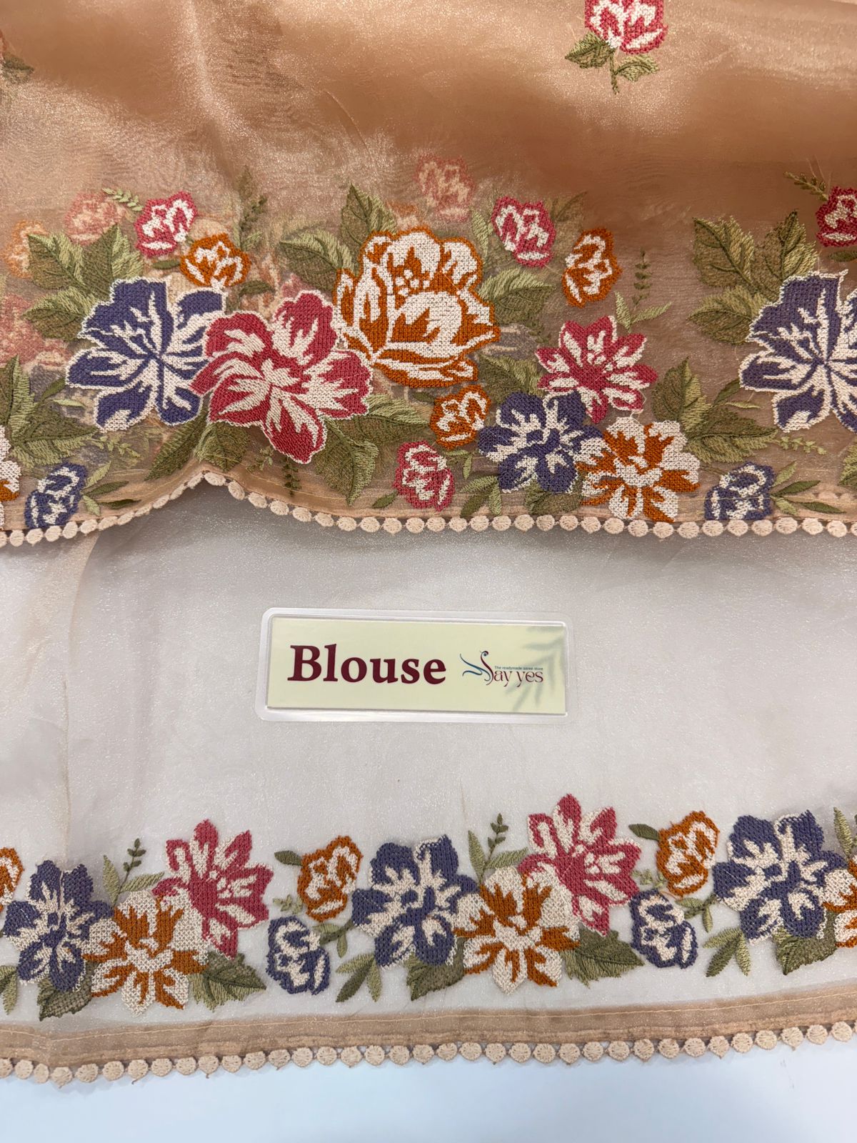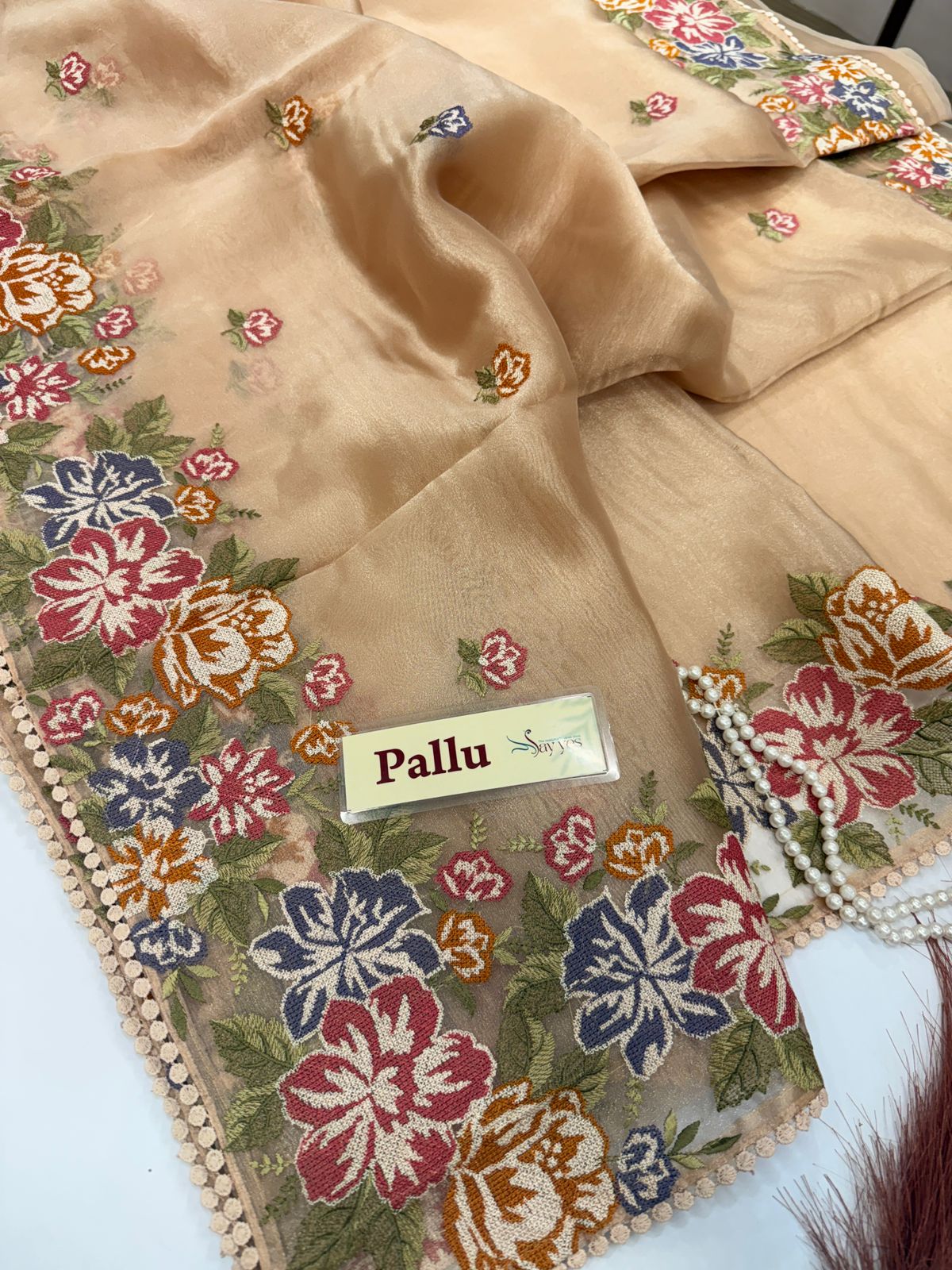 - Border & Pallu: Multicolour embroidery of flowers on sheer organza base
