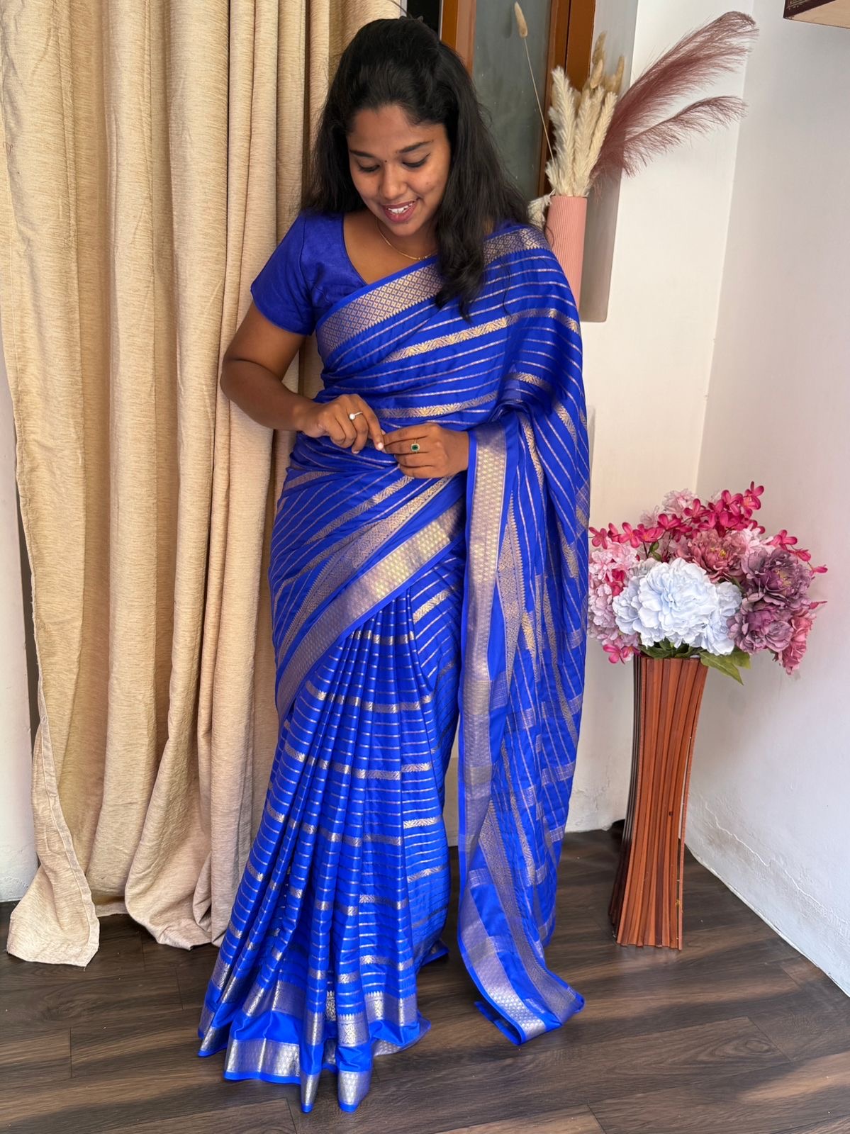 This is a stunning Mysore silk saree in a regal royal blue hue, featuring: