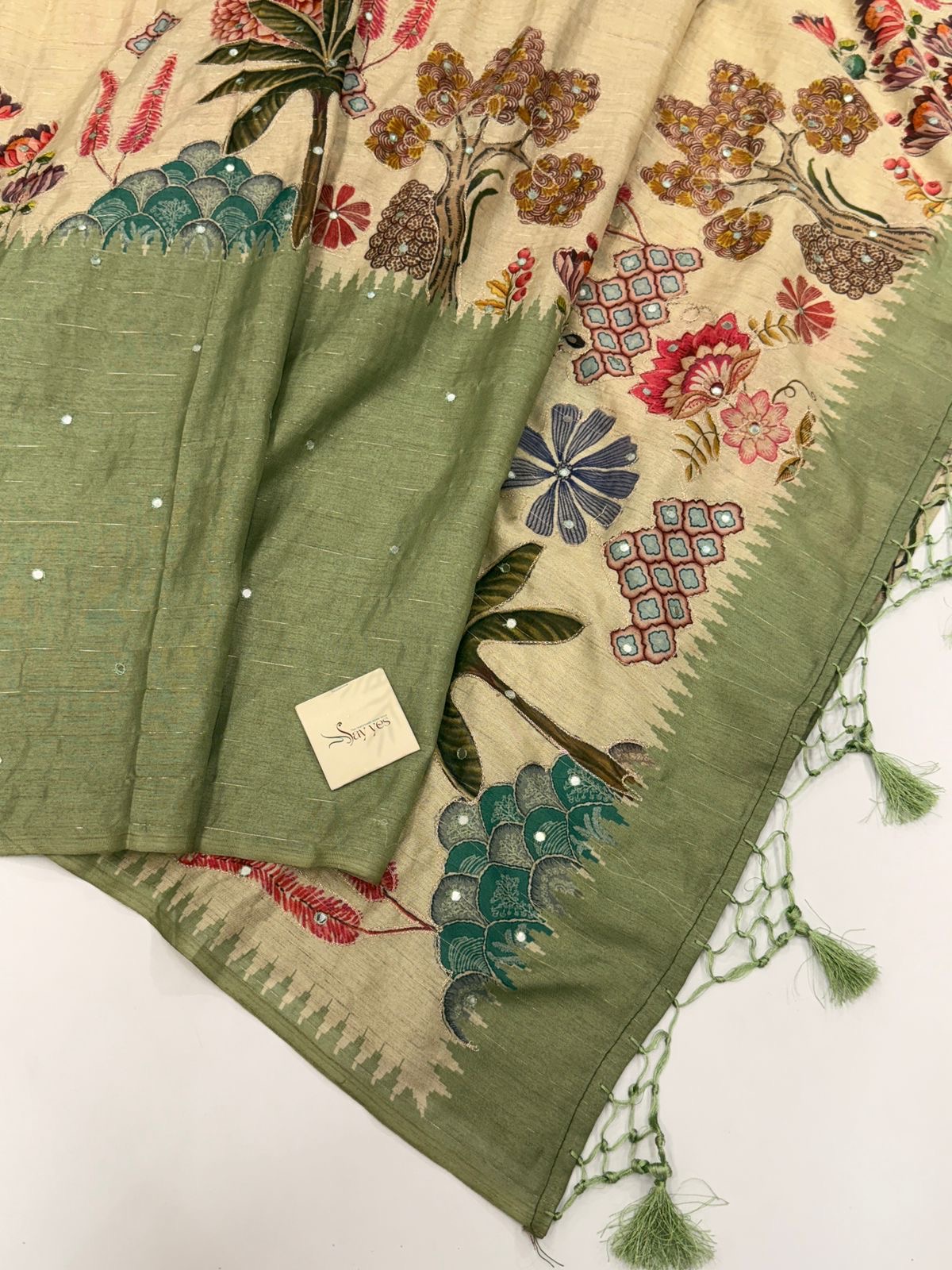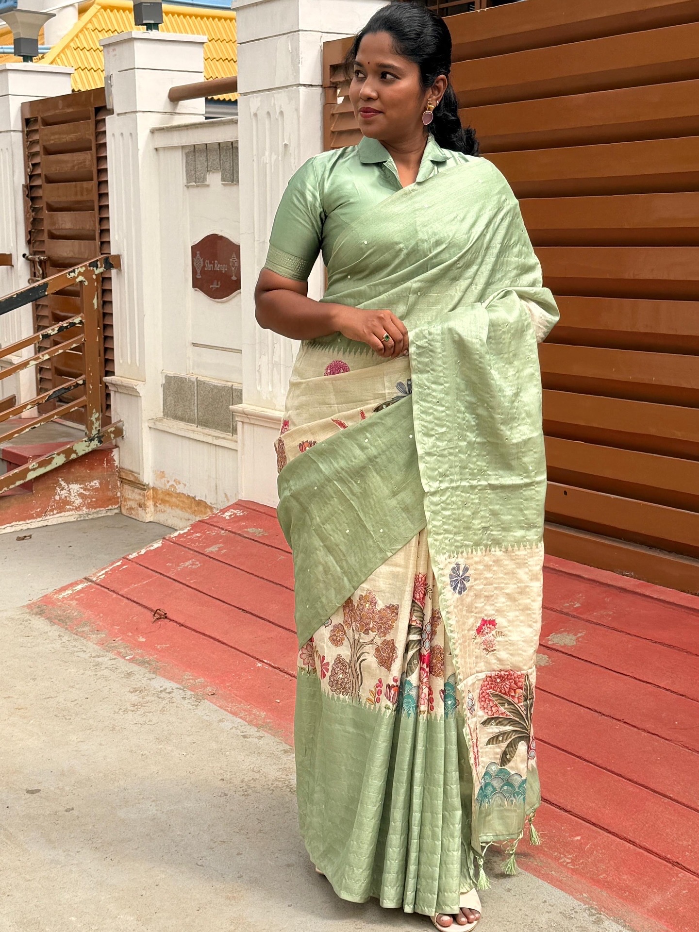 This serene sage-green Mursh silk saree is a celebration of understated luxury. Its soft, lustrous body drapes with effortless grace, while the contrasting cream panel blooms with intricate floral motifs in vibrant hues — a canvas of timeless artistry. Finished with delicate tassels on the pallu, this saree strikes the perfect balance between subtle sophistication and festive charm. Ideal for those who love tradition wrapped in modern elegance. ✨