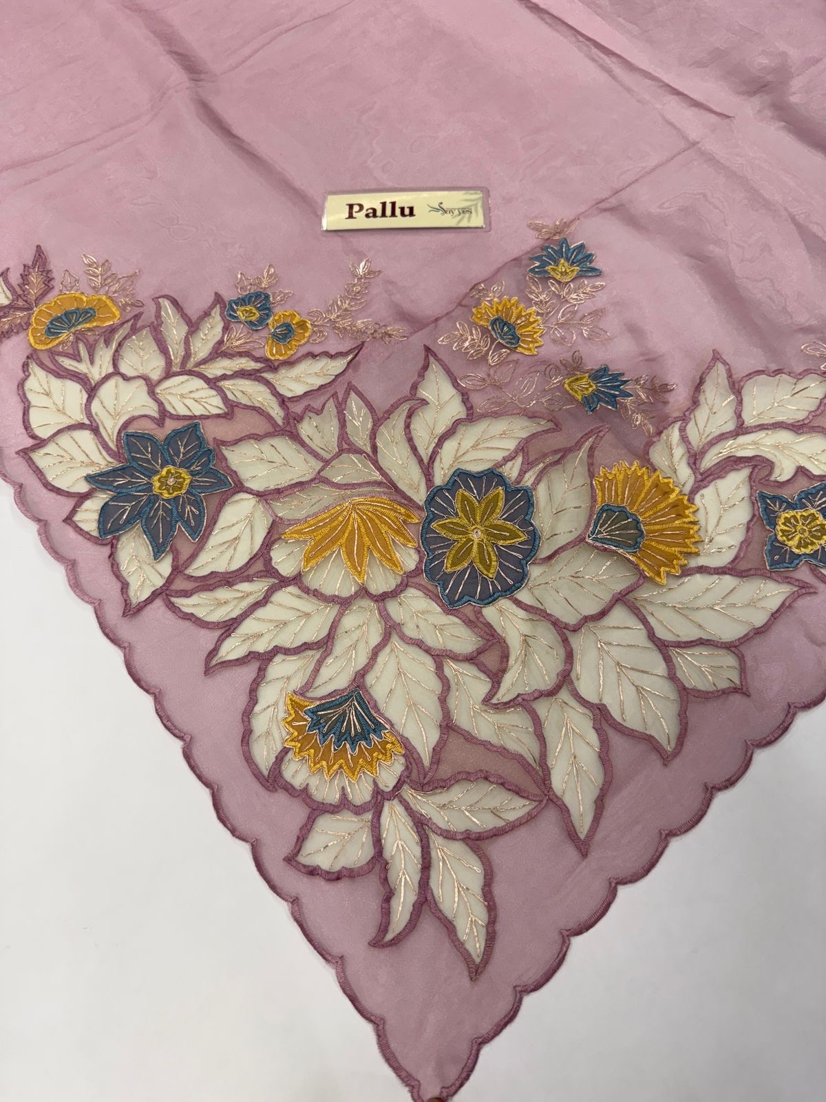A beautifully understated organza saree in dusty Rose base, elevated with exquisite embroidered florals. The border blooms with intricate threadwork in deep plum, soft green, and champagne gold, creating a sophisticated contrast that feels both earthy and luxurious. The scalloped edging adds a delicate, feminine finish while giving the saree a refined, designer touch.