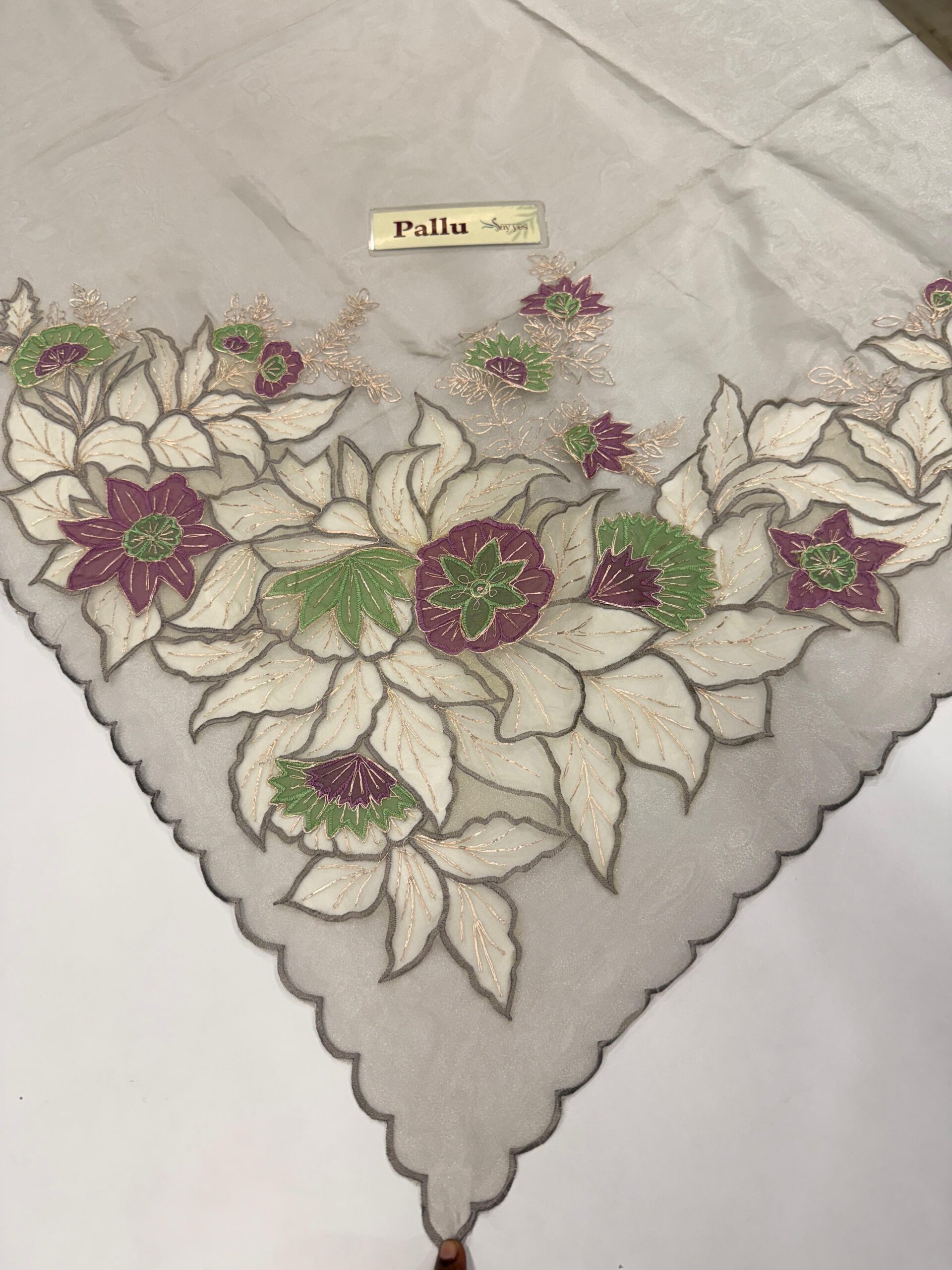 A beautifully understated organza saree in a muted taupe–beige base, elevated with exquisite embroidered florals. The border blooms with intricate threadwork in deep plum, soft green, and champagne gold, creating a sophisticated contrast that feels both earthy and luxurious. The scalloped edging adds a delicate, feminine finish while giving the saree a refined, designer touch.