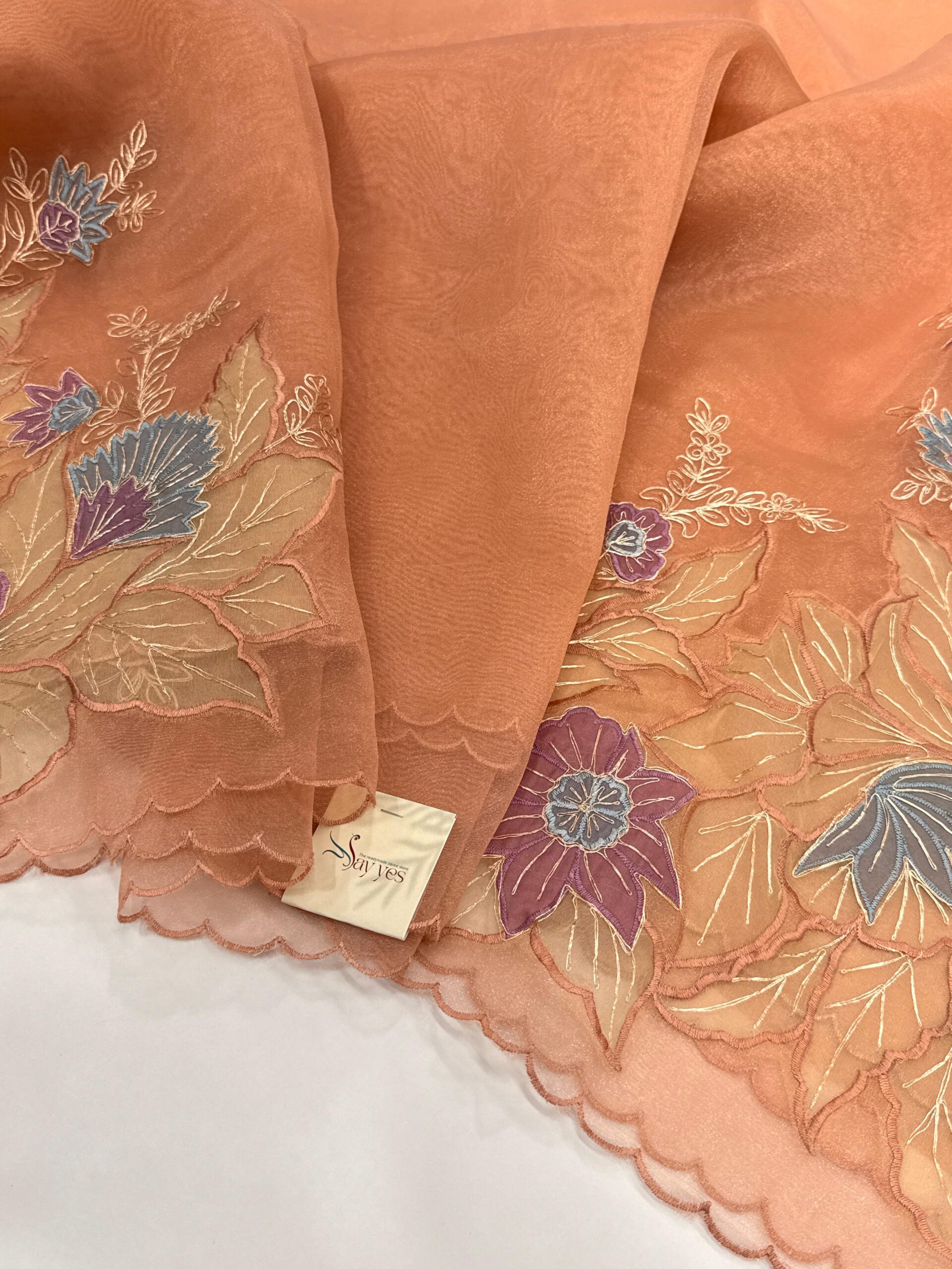 A beautifully understated organza saree in Tangerine base, elevated with exquisite embroidered florals. The border blooms with intricate threadwork in deep plum, soft green, and champagne gold, creating a sophisticated contrast that feels both earthy and luxurious. The scalloped edging adds a delicate, feminine finish while giving the saree a refined, designer touch.