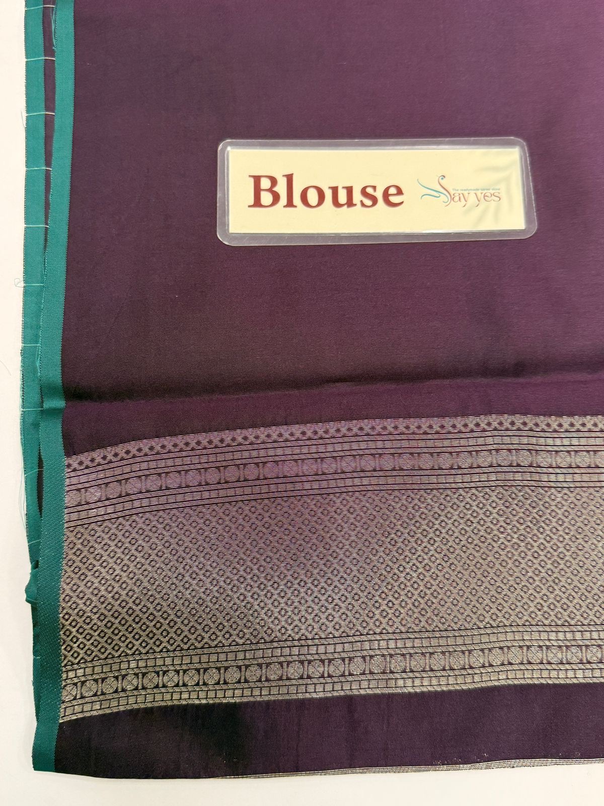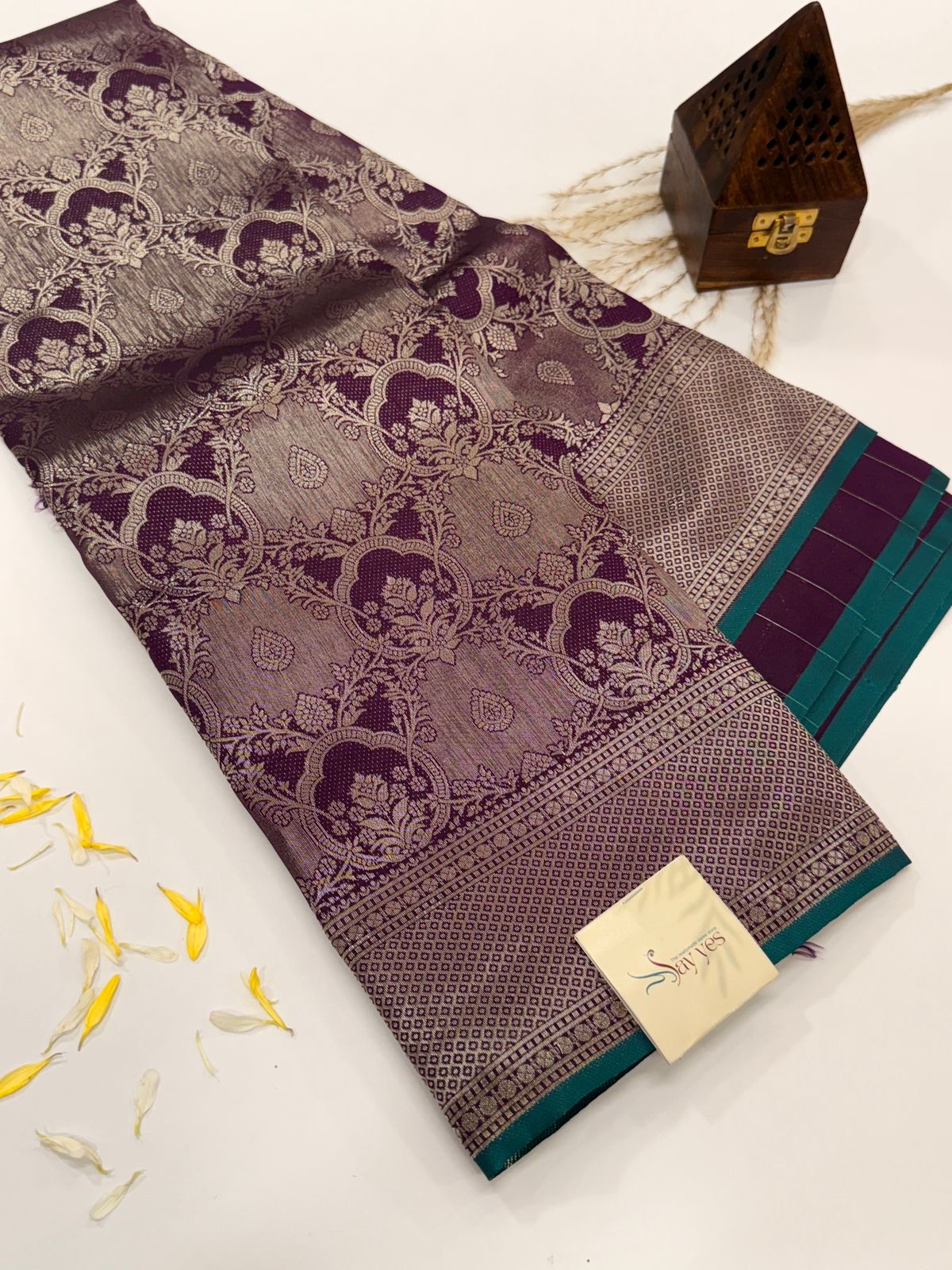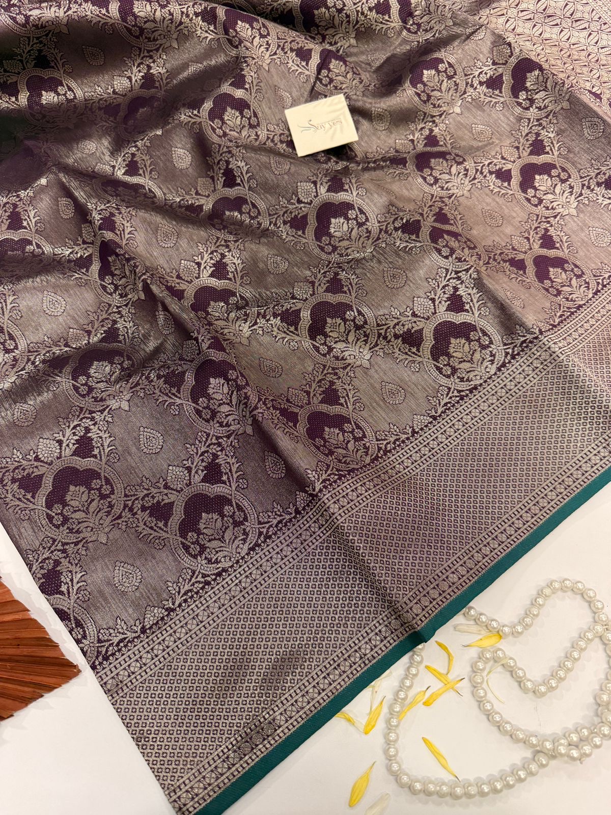 An exquisite purple and silver Banarasi silk saree featuring intricate floral and vine motifs woven in fine zari work. The saree’s body is adorned with delicate buttas in silver, contrasted beautifully against the rich purple base. Its border showcases a refined geometric weave with a subtle green selvedge, adding a refreshing touch of elegance. Perfect for weddings, festive occasions, or grand celebrations, this drape radiates timeless sophistication and charm.
