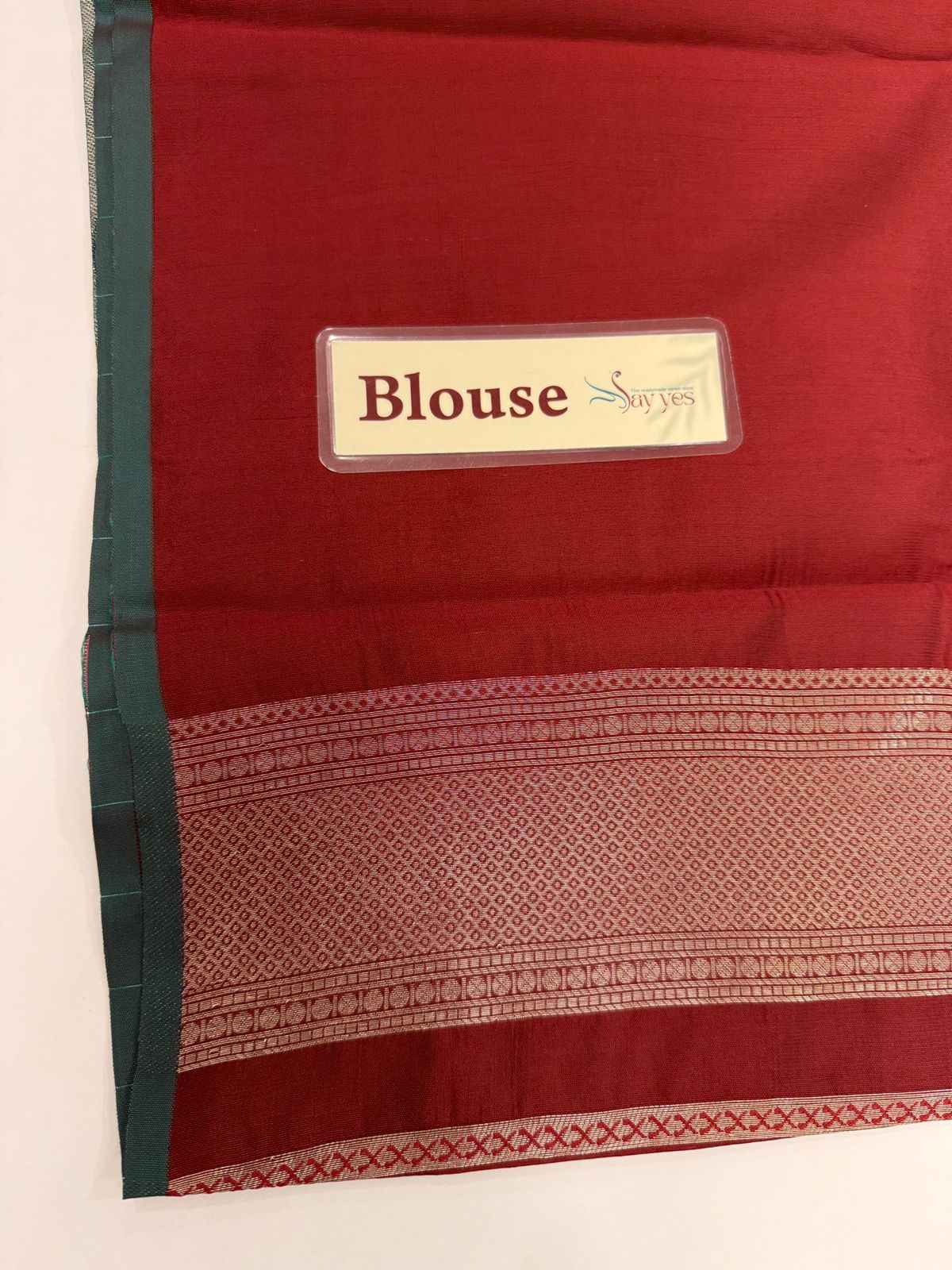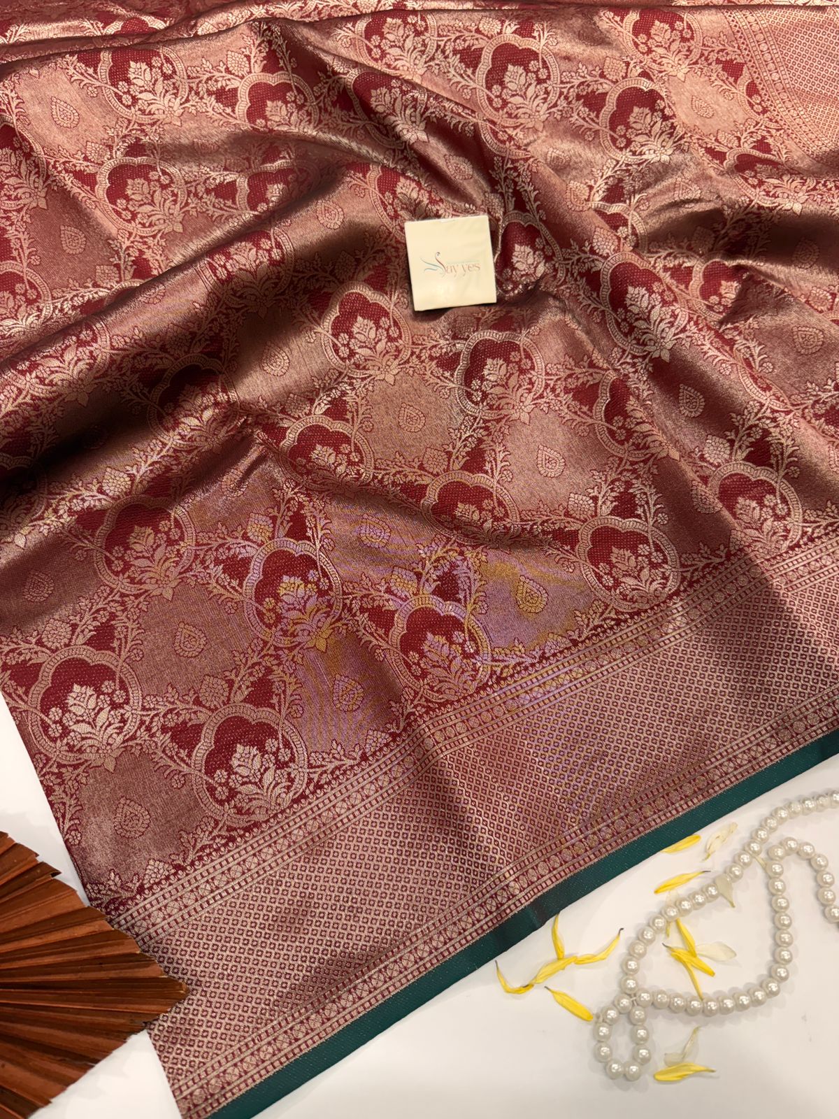 An exquisite Maroon and silver Banarasi silk saree featuring intricate floral and vine motifs woven in fine zari work. The saree’s body is adorned with delicate buttas in silver, contrasted beautifully against the rich purple base. Its border showcases a refined geometric weave with a subtle green selvedge, adding a refreshing touch of elegance. Perfect for weddings, festive occasions, or grand celebrations, this drape radiates timeless sophistication and charm.