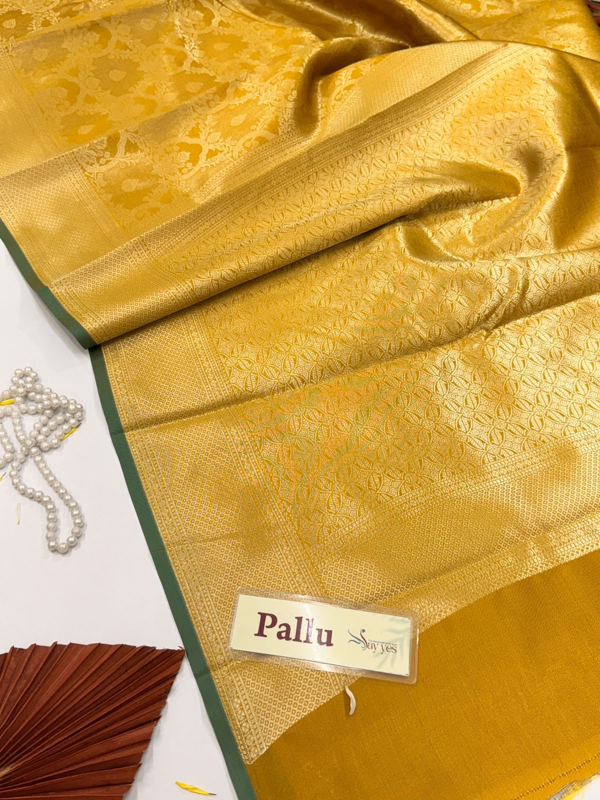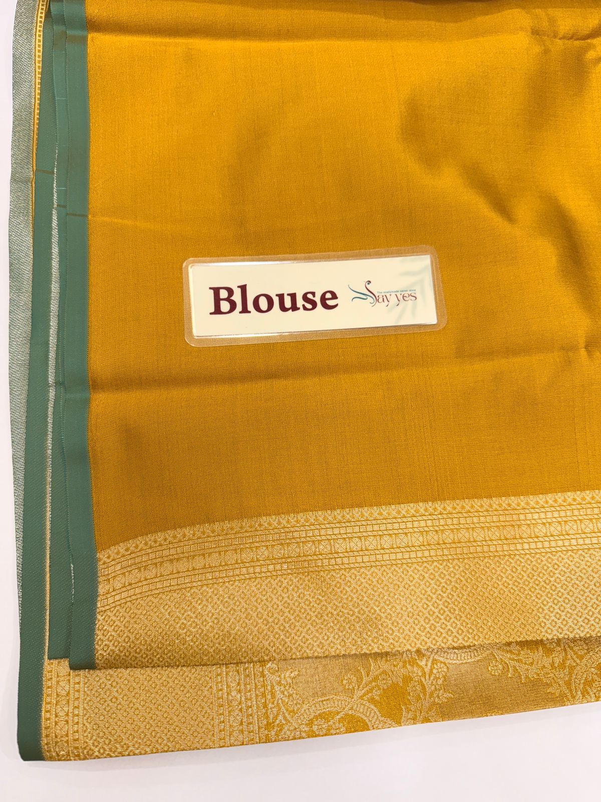 An exquisite Mustard and silver Banarasi silk saree featuring intricate floral and vine motifs woven in fine zari work. The saree’s body is adorned with delicate buttas in silver, contrasted beautifully against the rich purple base. Its border showcases a refined geometric weave with a subtle green selvedge, adding a refreshing touch of elegance. Perfect for weddings, festive occasions, or grand celebrations, this drape radiates timeless sophistication and charm.