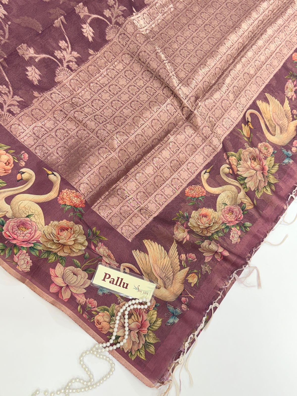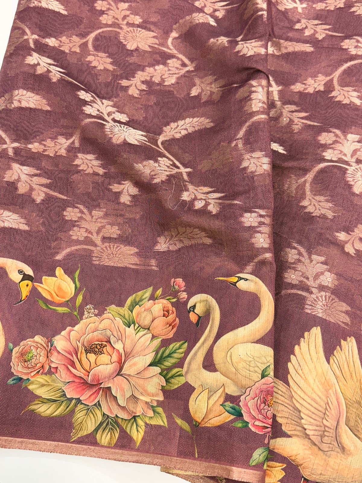 An ode to poise and poetry — this exquisite Tussar silk saree blooms with hand-painted swans and floral artistry that feels straight out of a dream. The gentle sheen of the silk complements the pastel swans gliding amidst lotus blooms, creating a serene canvas of elegance and charm. A saree that speaks of calm beauty, perfect for those who love timeless grace with a hint of artistic flair.