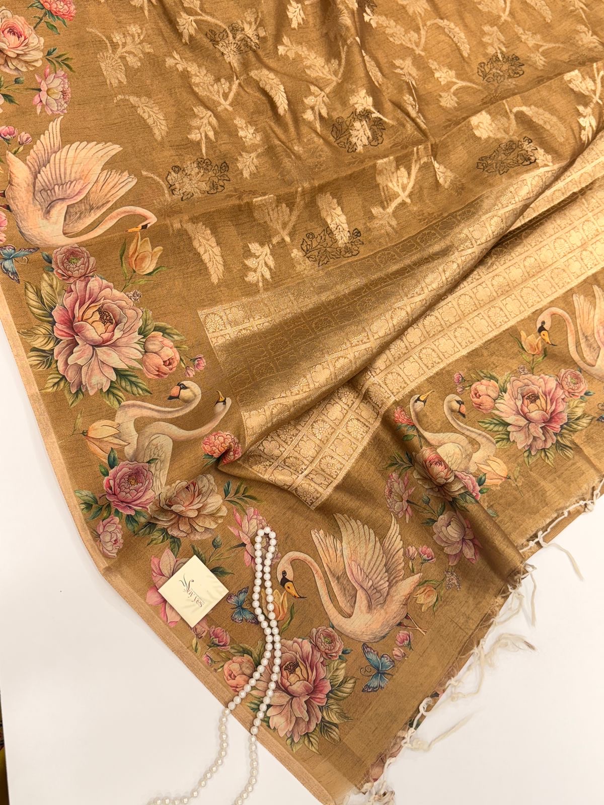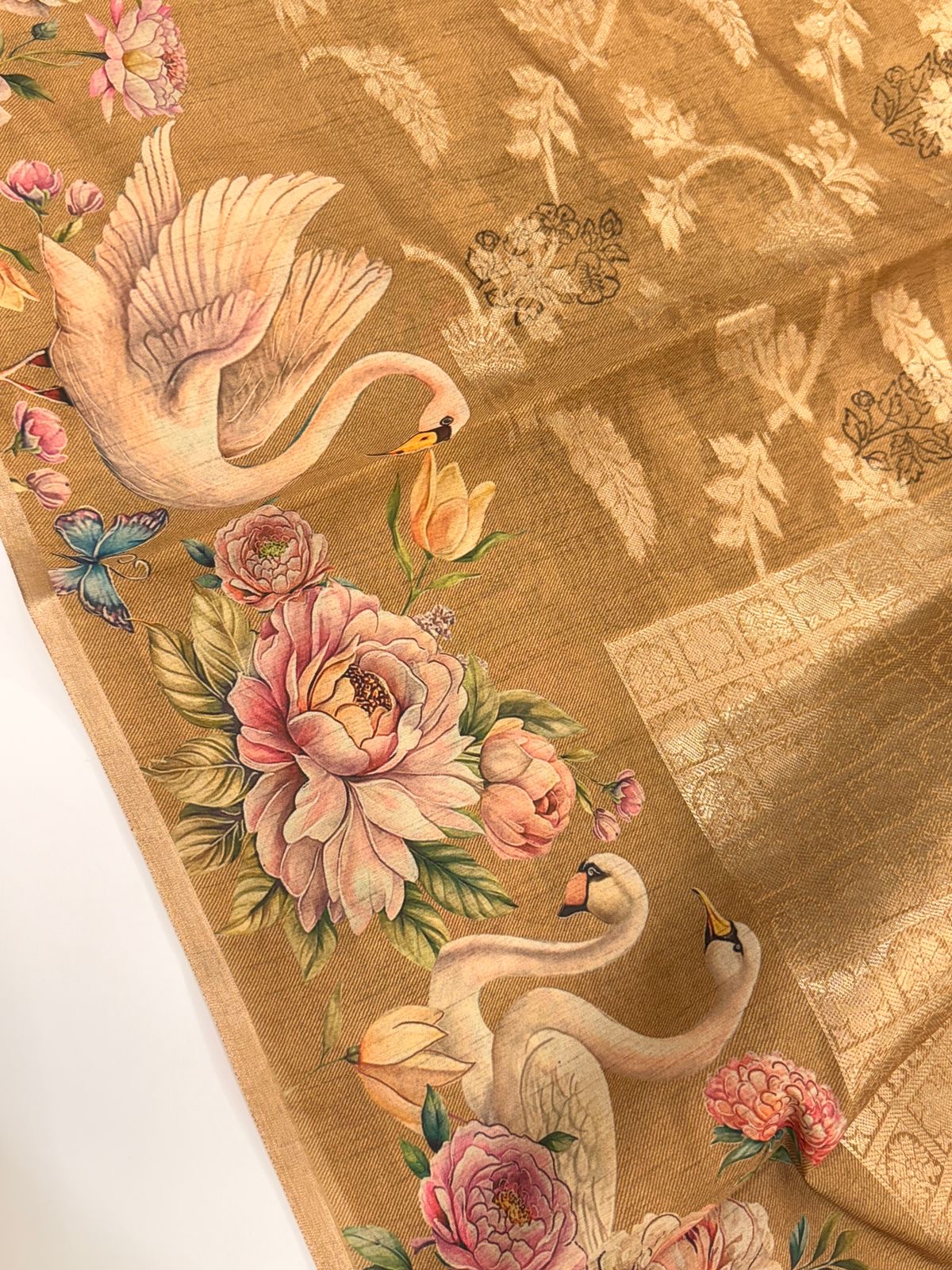 An ode to poise and poetry — this exquisite Tussar silk saree blooms with hand-painted swans and floral artistry that feels straight out of a dream. The gentle sheen of the silk complements the pastel swans gliding amidst lotus blooms, creating a serene canvas of elegance and charm. A saree that speaks of calm beauty, perfect for those who love timeless grace with a hint of artistic flair.