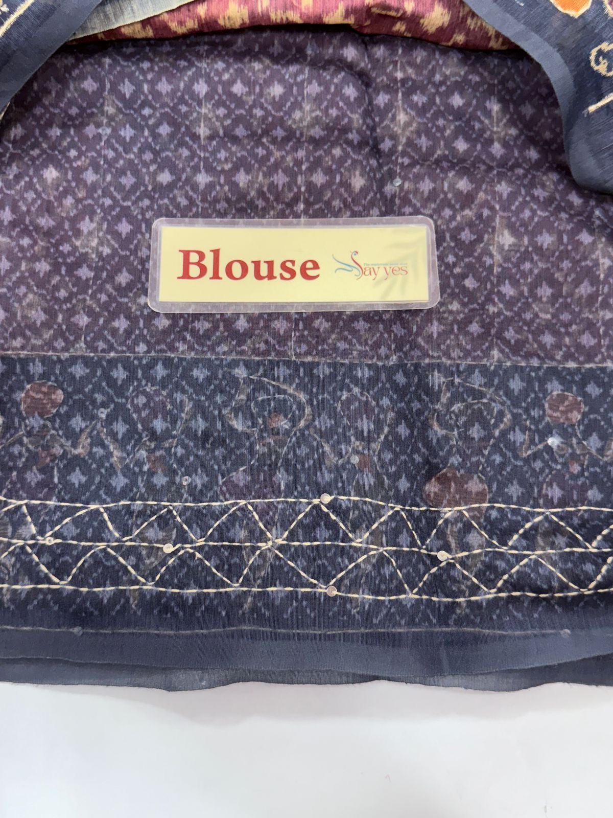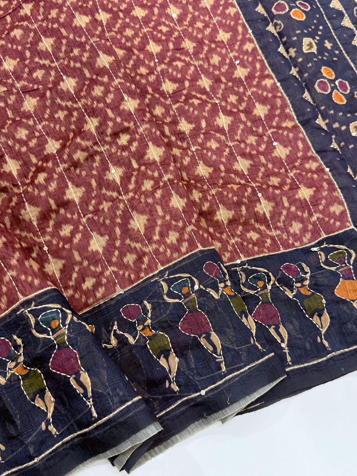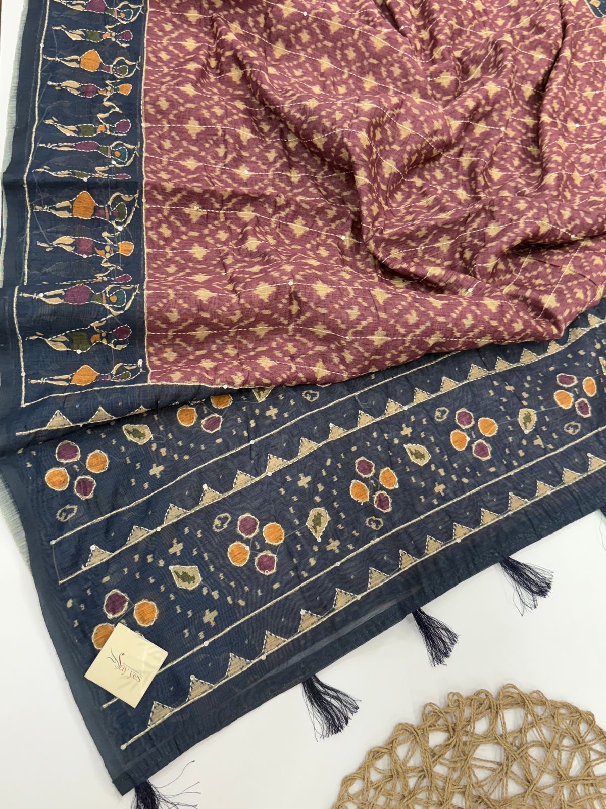 A timeless blend of craftsmanship and grace — this Chanderi hand Kantha stitch saree is a masterpiece of heritage artistry. Handcrafted on a blue base, it features intricate Kantha embroidery in warm tones of rust, gold, and ivory, telling tales of tradition through every stitch. The floral and paisley motifs come alive with delicate threadwork and tiny sequins that add just the right touch of shimmer.