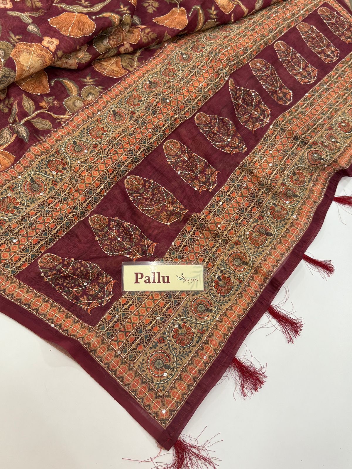 A timeless blend of craftsmanship and grace — this Chanderi hand Kantha stitch saree is a masterpiece of heritage artistry. Handcrafted on a deep navy base, it features intricate Kantha embroidery in warm tones of rust, gold, and ivory, telling tales of tradition through every stitch. The floral and paisley motifs come alive with delicate threadwork and tiny sequins that add just the right touch of shimmer.