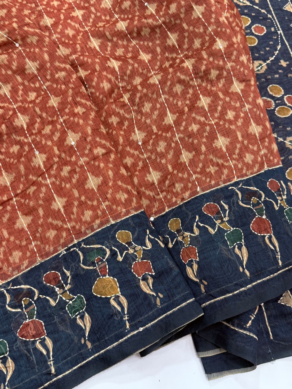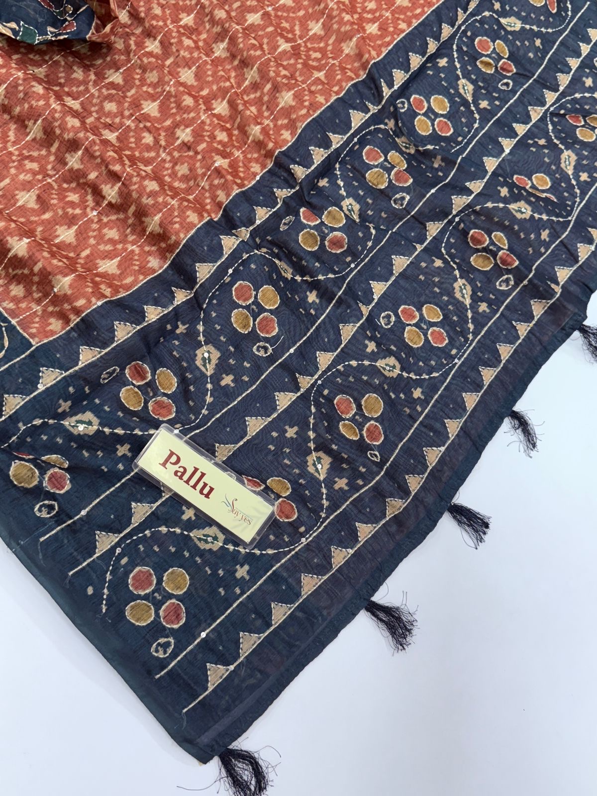 A timeless blend of craftsmanship and grace — this Chanderi hand Kantha stitch saree is a masterpiece of heritage artistry. Handcrafted on a blue base, it features intricate Kantha embroidery in warm tones of rust, gold, and ivory, telling tales of tradition through every stitch. The floral and paisley motifs come alive with delicate threadwork and tiny sequins that add just the right touch of shimmer.
