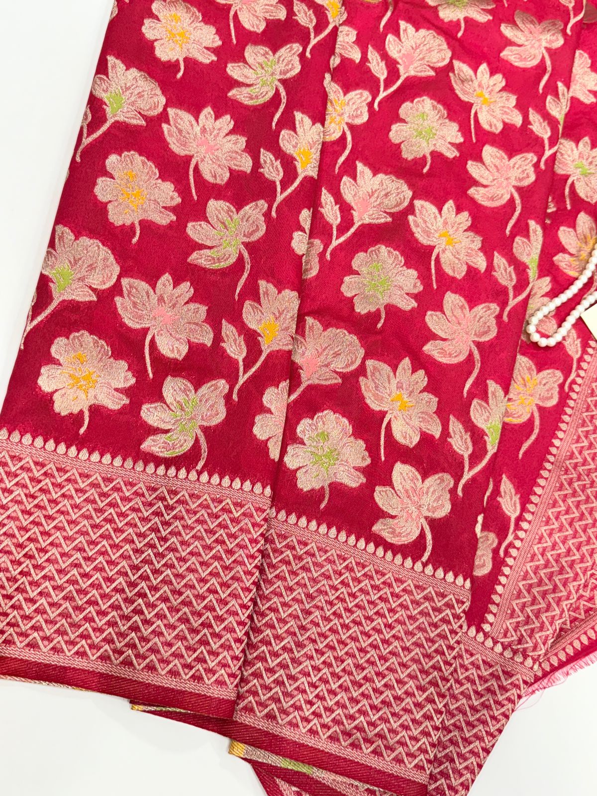 A mesmerizing magenta semi-silk saree adorned with delicate floral zari motifs that shimmer with every move. The intricate weave on the borders and pallu adds a touch of traditional finesse, while the soft semi-silk drape ensures effortless comfort. Elegant, lightweight, and full of grace — this saree beautifully bridges heritage and modern sophistication.