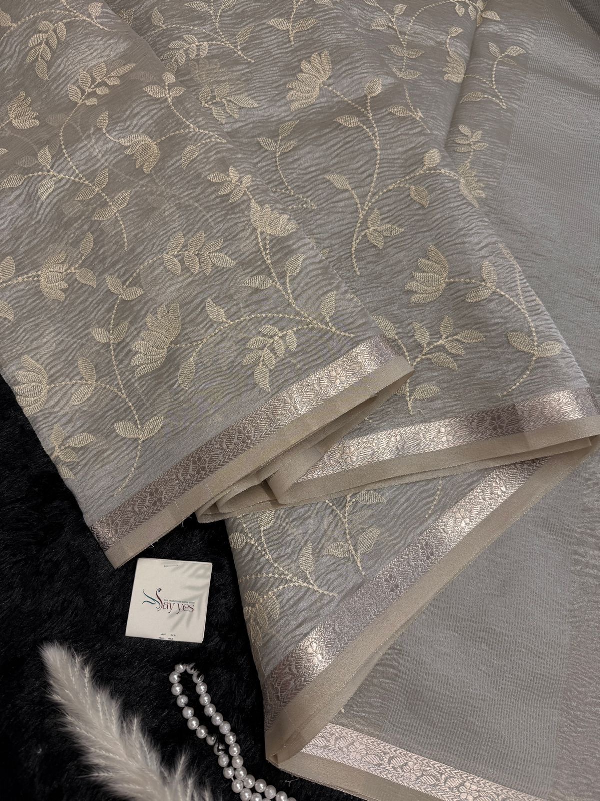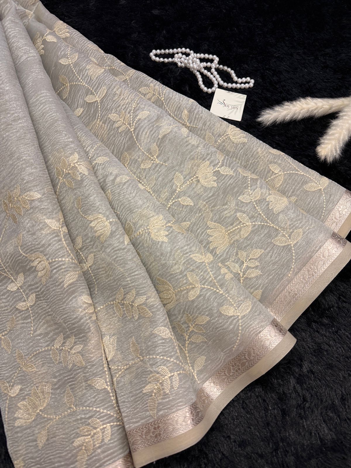 Accented with a minimal crochet edge, this saree blends old-world grace with modern subtlety — perfect for soirées, festive brunches, or those quiet power moments when your elegance does all the talking.
