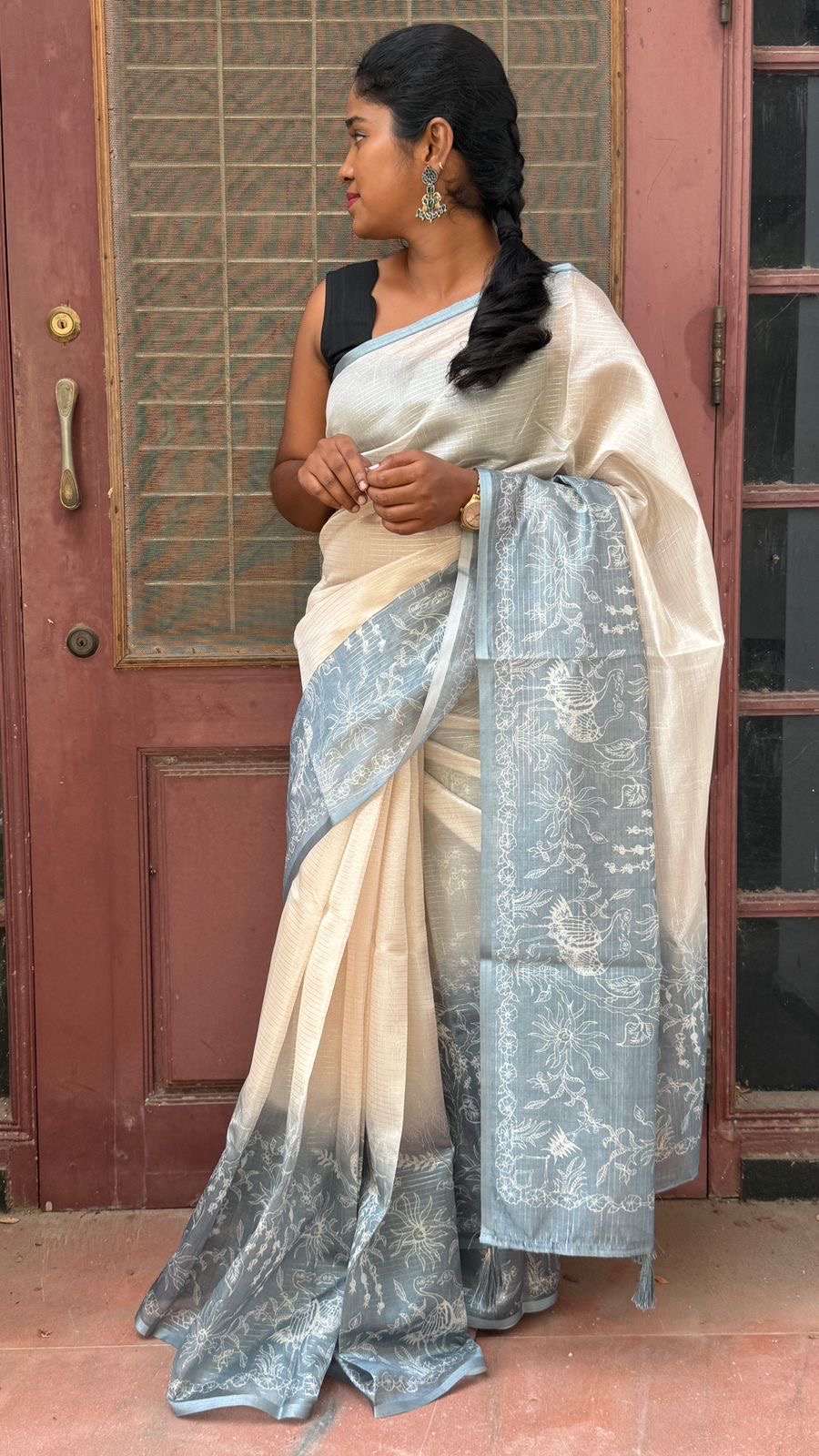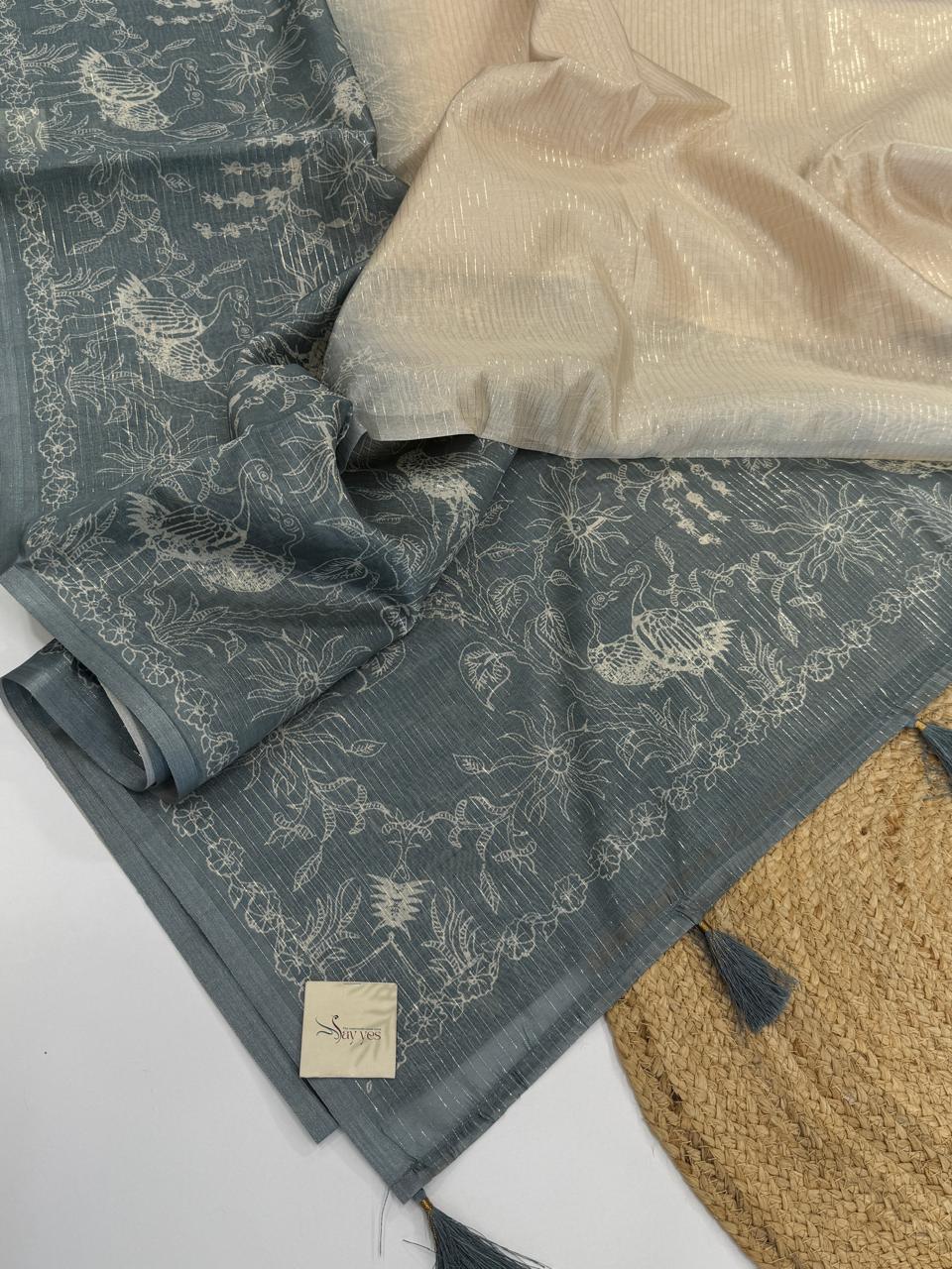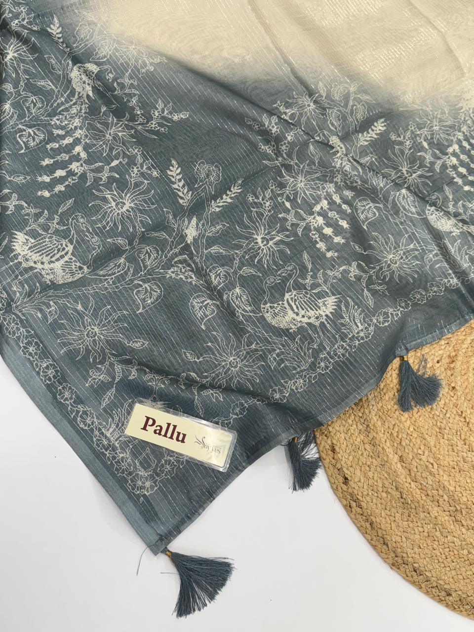 Weave Detail: Features subtle gold zari or metallic thread stripes running across the fabric, adding a touch of understated shimmer.