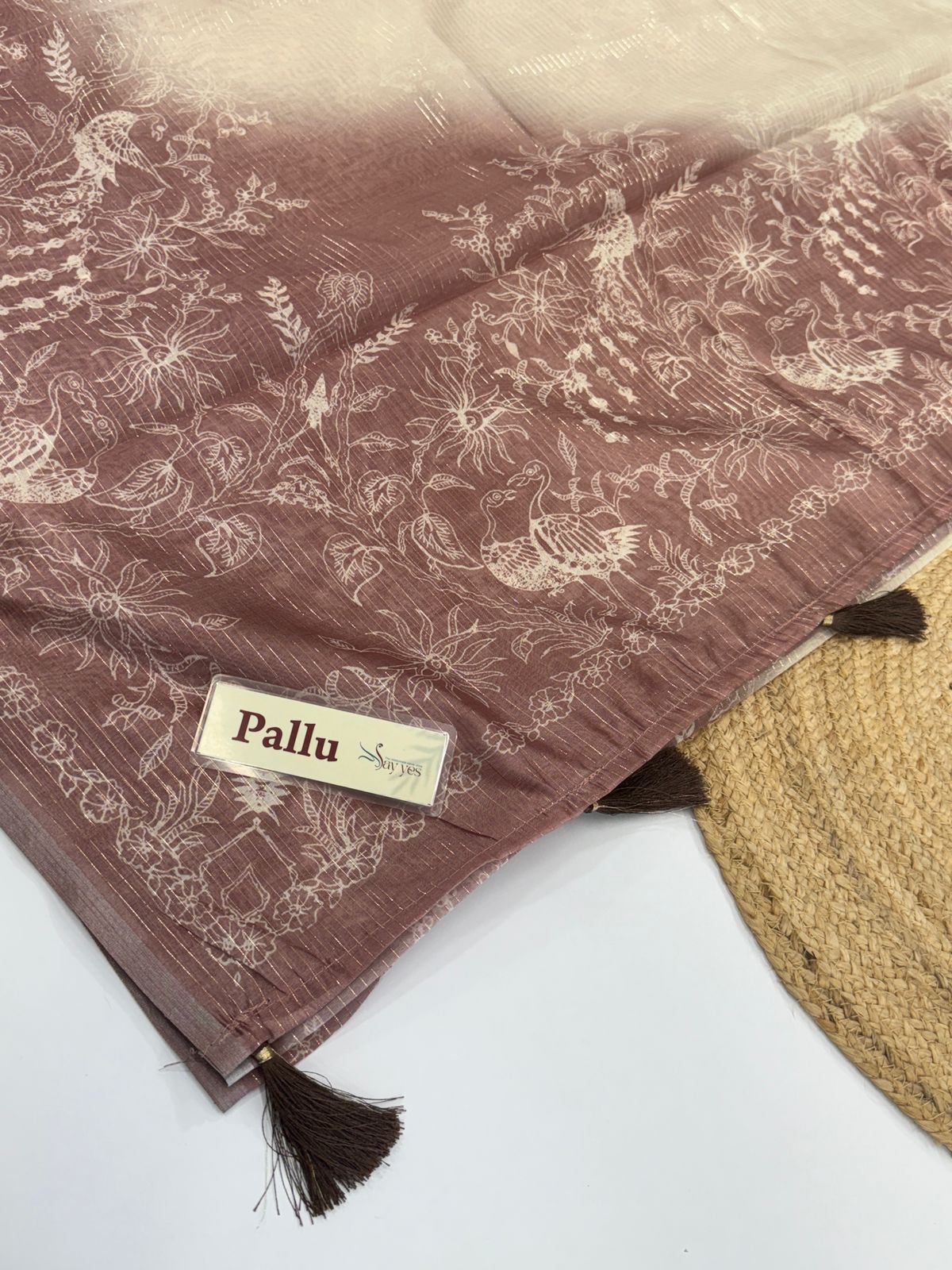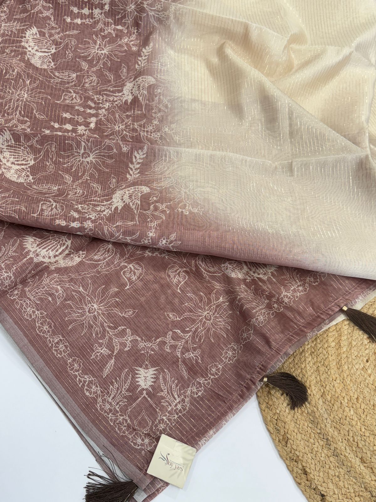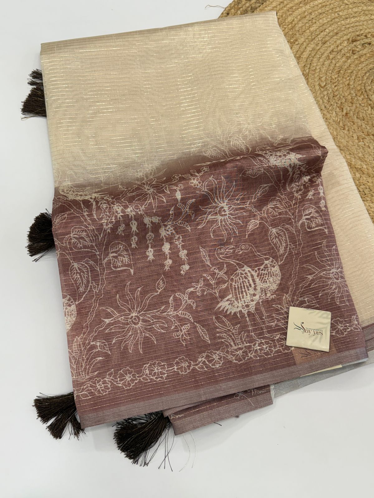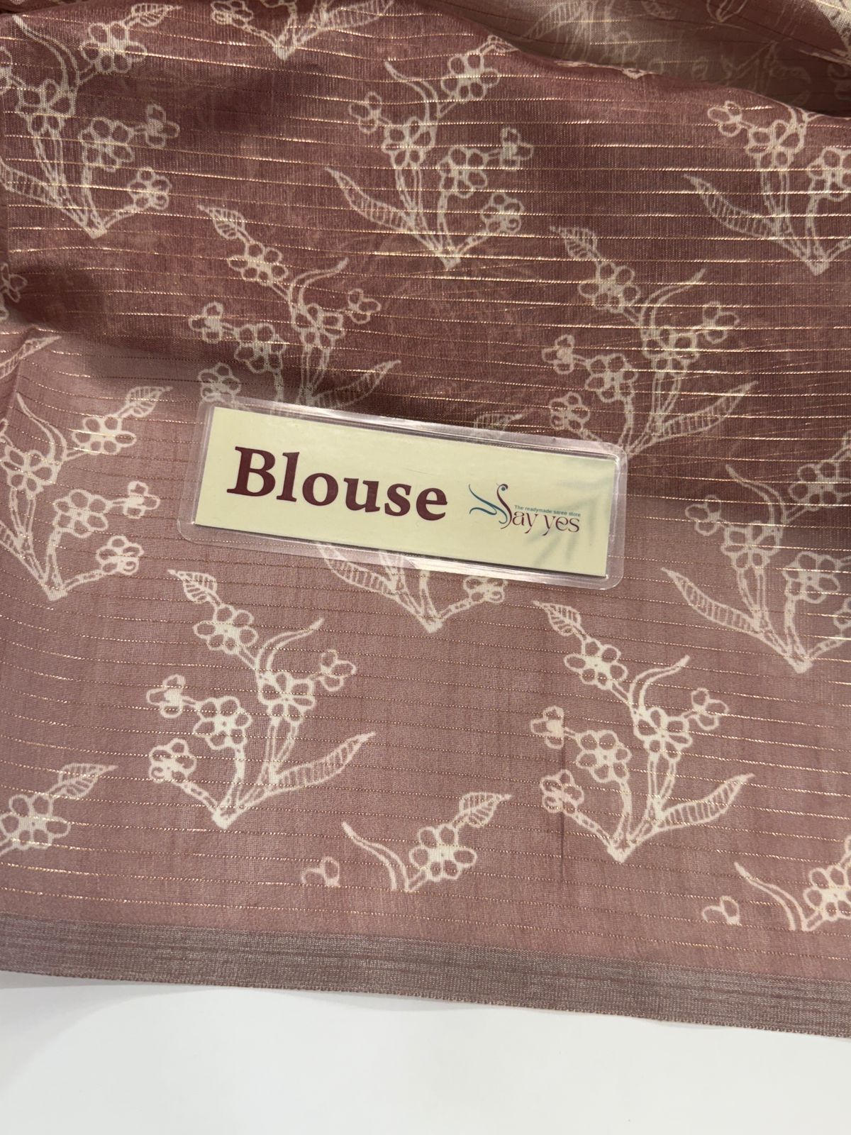 Weave Detail: Features subtle gold zari or metallic thread stripes running across the fabric, adding a touch of understated shimmer.