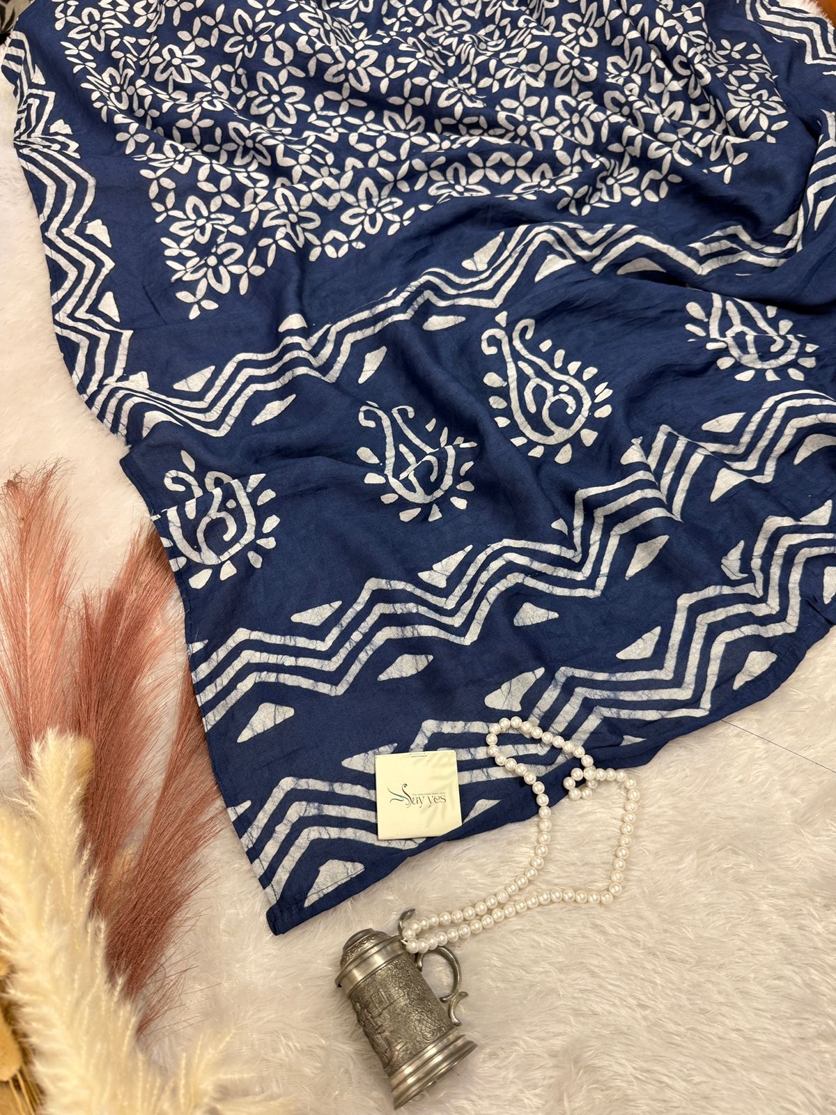 A breathable, buttery-soft Mulberry silk saree in deep indigo blue, hand-block printed with abstract and tribal-inspired white patterns. The fabric is light as air, cool against the skin, and flows effortlessly — perfect for all-day wear in tropical climates. The geometric dot and circle patterns lend a modern boho flair, while the organic texture of mul silk keeps it rooted in tradition. A versatile piece for both travel-ready minimalism and relaxed ethnic styling.