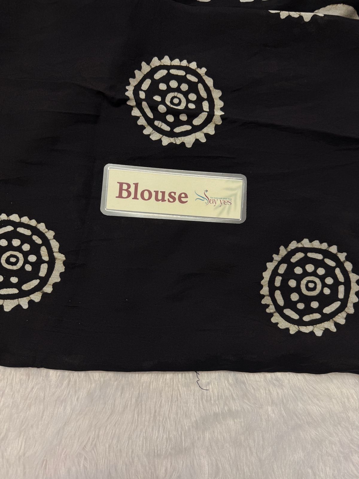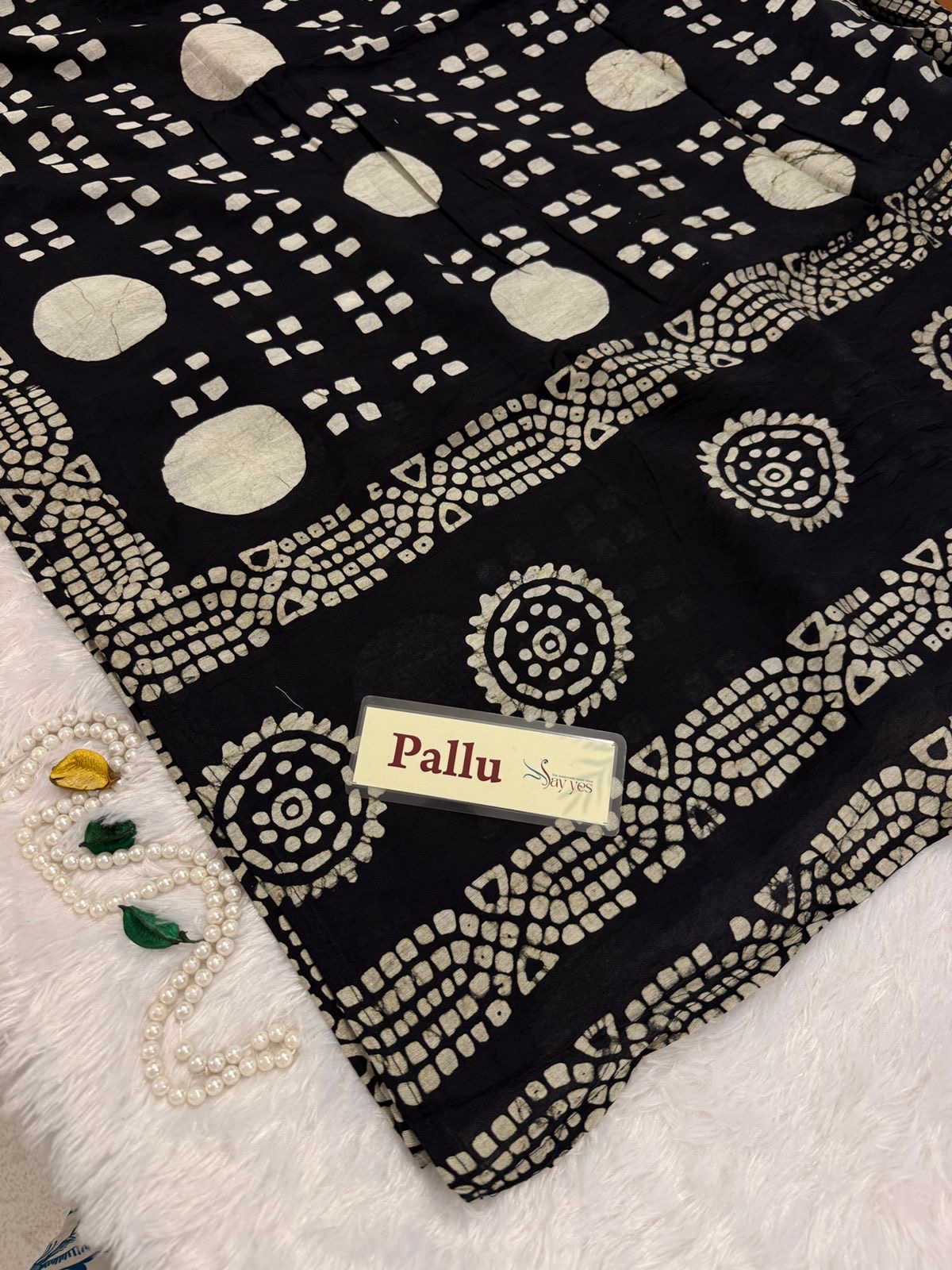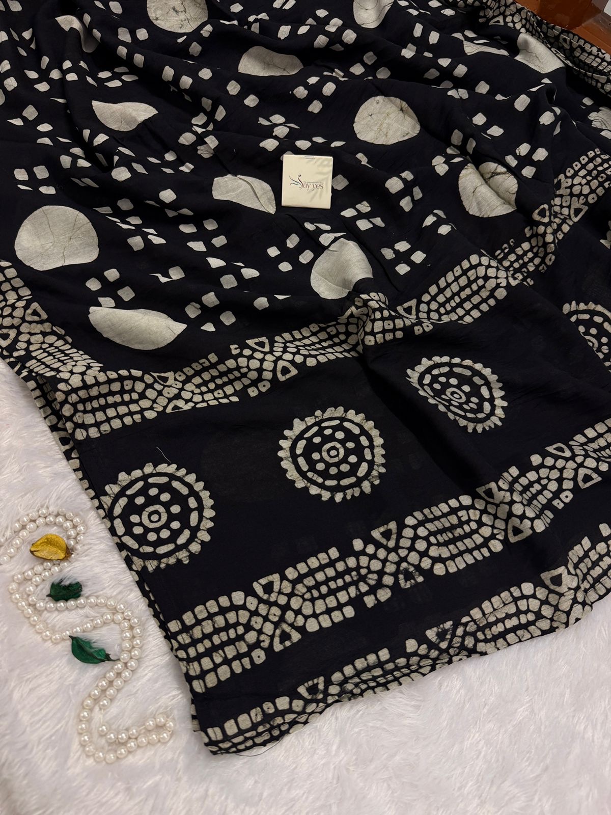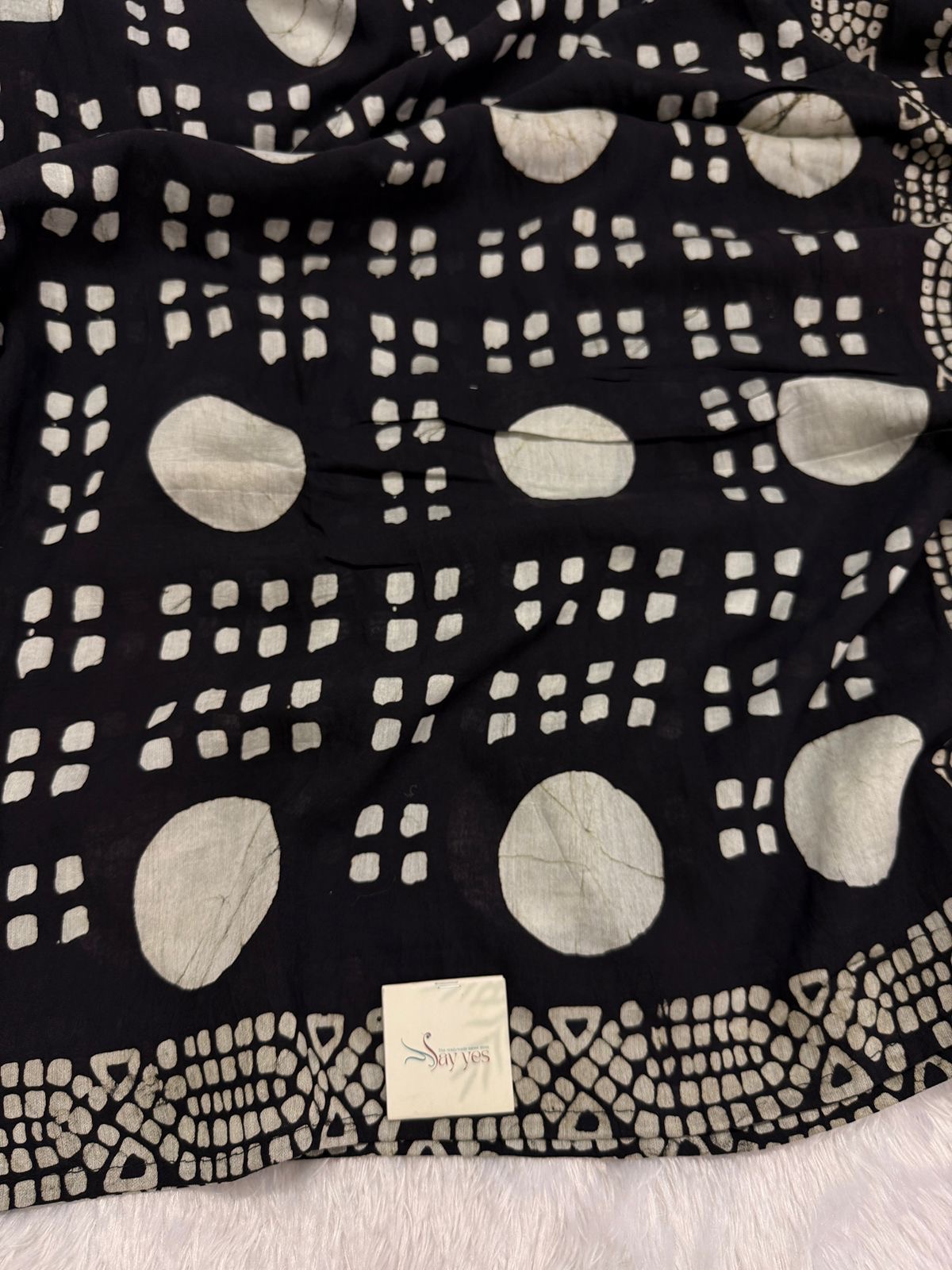 A breathable, buttery-soft Mulberry silk saree in deep indigo blue, hand-block printed with abstract and tribal-inspired white patterns. The fabric is light as air, cool against the skin, and flows effortlessly — perfect for all-day wear in tropical climates. The geometric dot and circle patterns lend a modern boho flair, while the organic texture of mul silk keeps it rooted in tradition. A versatile piece for both travel-ready minimalism and relaxed ethnic styling.