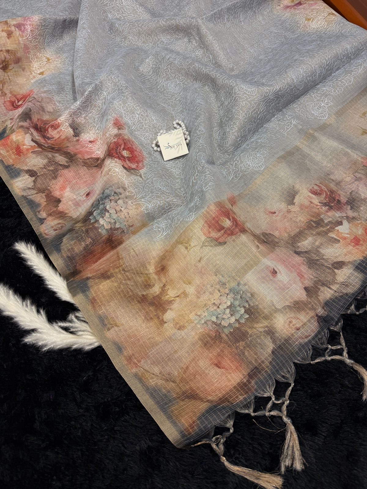 Accented with a minimal crochet edge, this saree blends old-world grace with modern subtlety — perfect for soirées, festive brunches, or those quiet power moments when your elegance does all the talking.