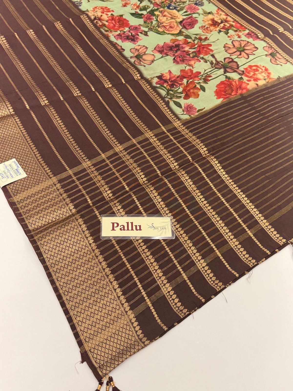 Border: Traditional zari border in antique gold, with alternating geometric and leaf motifs