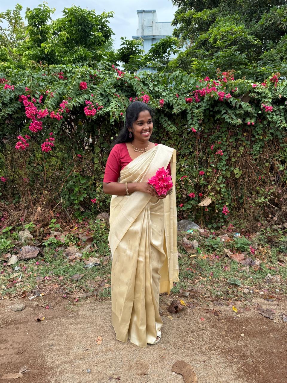 This tissue silk saree offers comfort, ease of walking and sitting, simplicity and effortless maintenance.