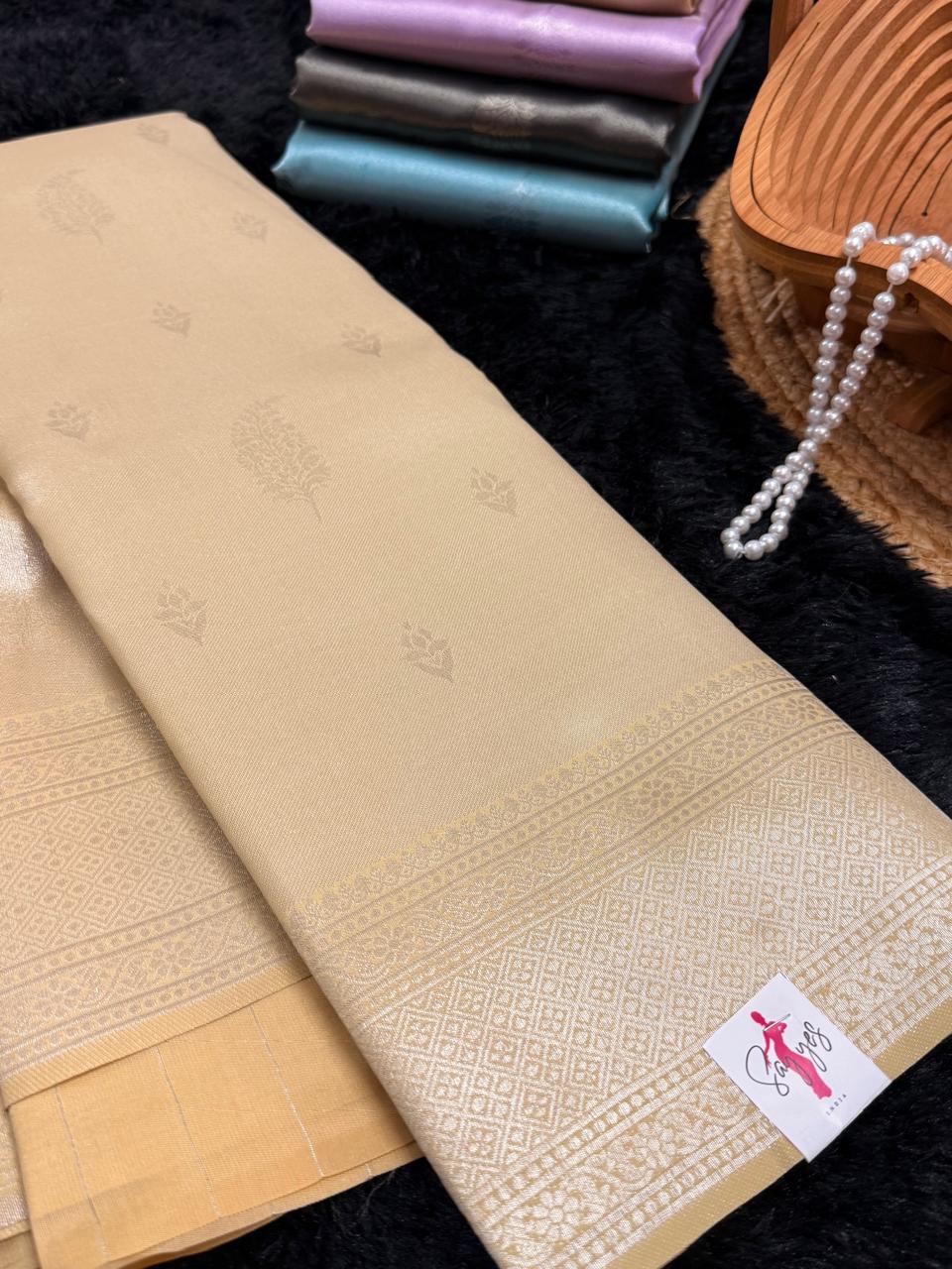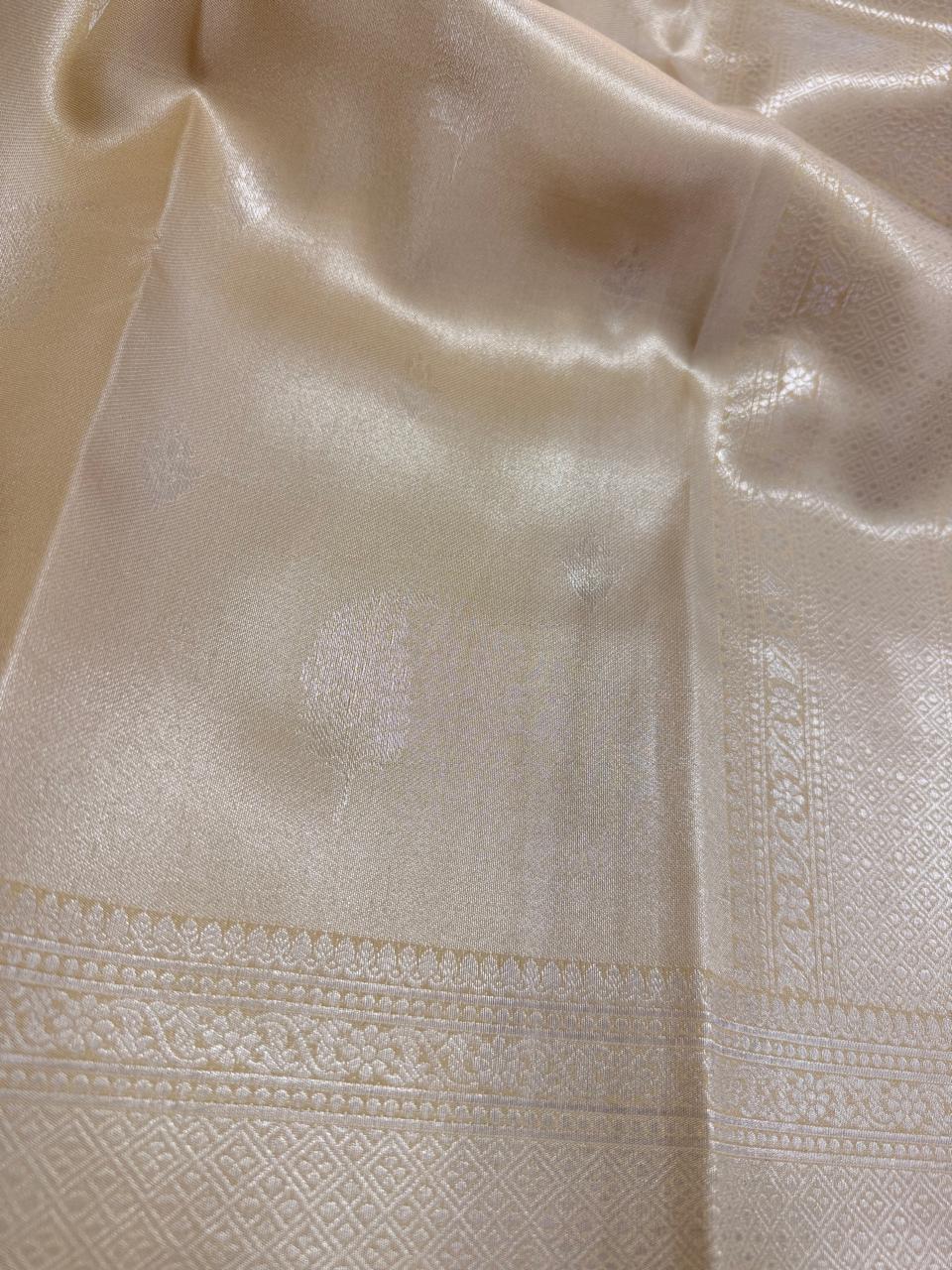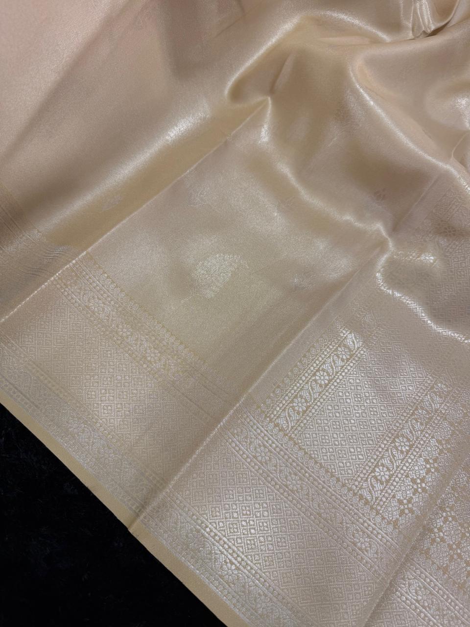This elegant saree is a masterpiece of intricate weaving, featuring delicate motifs and a rich, textured border. The subtle sheen of the fabric enhances its regal appeal, making it a perfect choice for occasions that call for understated luxury. The finely woven patterns reflect timeless craftsmanship, ensuring a graceful and sophisticated look.