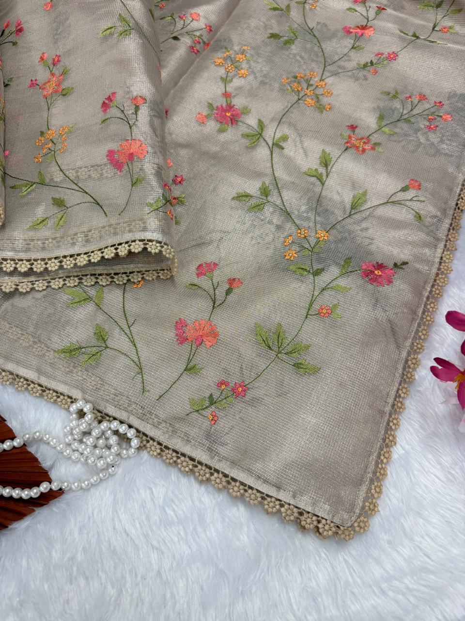 Experience sheer elegance with this exquisite Tissue Silk Saree, a perfect fusion of luxury and grace. Crafted from delicate tissue silk, this saree boasts a lightweight, airy texture that drapes beautifully, making it ideal for both festive and formal occasions. The subtle sheen of the fabric enhances its regal appeal, while the intricately embroidered floral motifs add a touch of timeless sophistication. The finely detailed border further elevates its charm, making it a must-have for those who appreciate refined craftsmanship.
