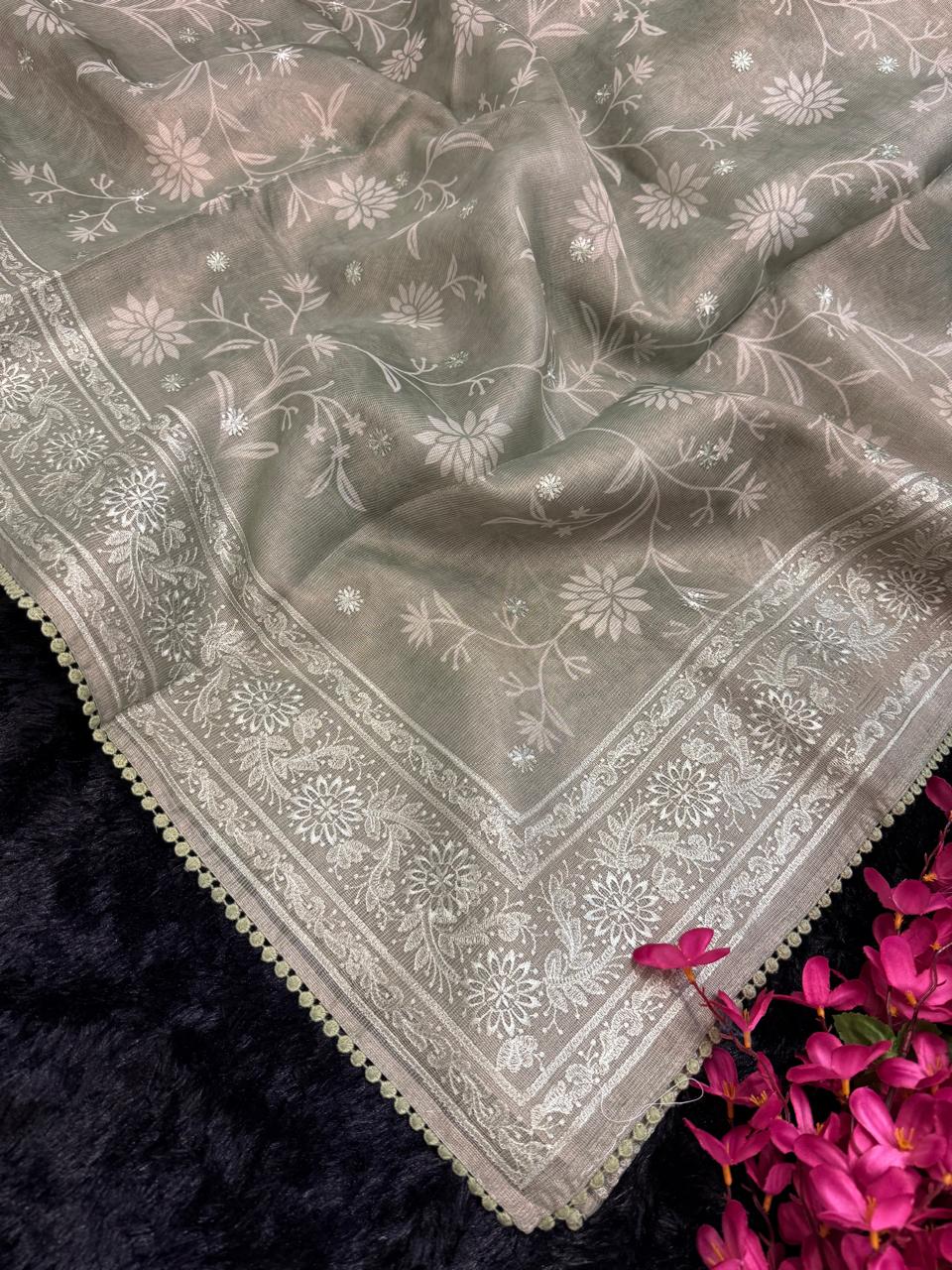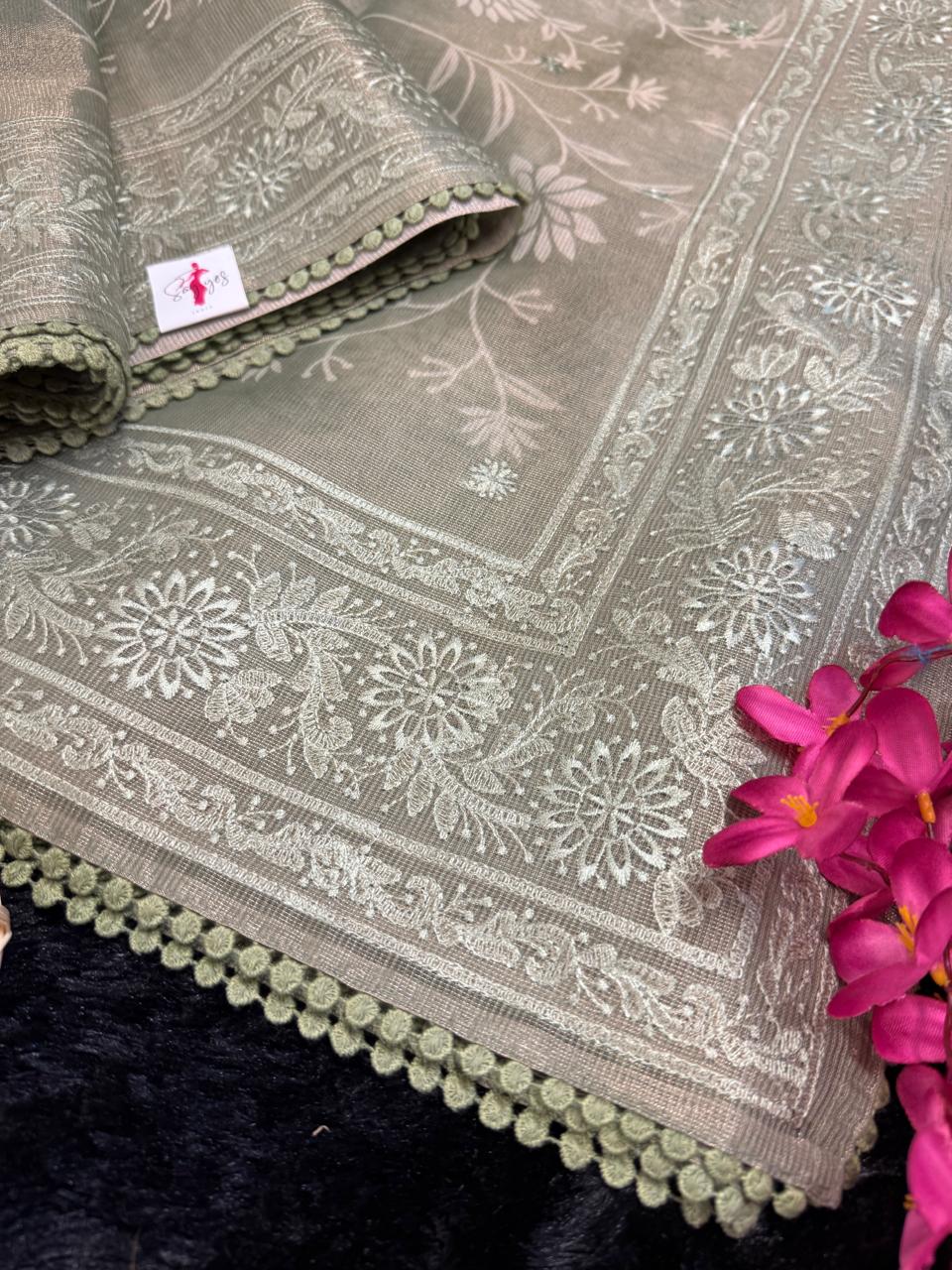 Experience sheer elegance with this exquisite Kota cotton Saree, a perfect fusion of luxury and grace. Crafted from delicate tissue silk, this saree boasts a lightweight, airy texture that drapes beautifully, making it ideal for both festive and formal occasions. The subtle sheen of the fabric enhances its regal appeal, while the intricately embroidered floral motifs add a touch of timeless sophistication. The finely detailed border further elevates its charm, making it a must-have for those who appreciate refined craftsmanship.