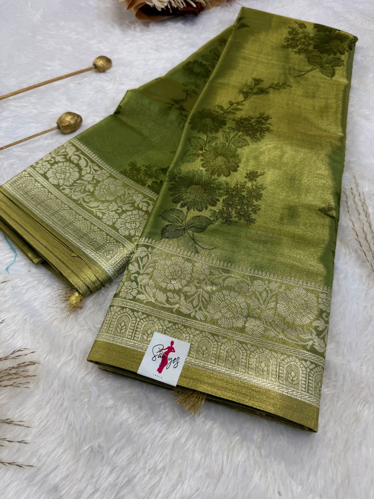 Grace meets grandeur in this opulent Kancheevaram tissue silk saree, drenched in a radiant golden hue. The body is adorned with delicate floral zari motifs, lending a regal charm to its smooth, shimmering surface. The rich tissue weave enhances its sheen, creating an almost liquid-gold effect as it drapes. The intricately woven zari border features traditional floral and temple patterns, offering a classic contrast to the soft floral motifs.