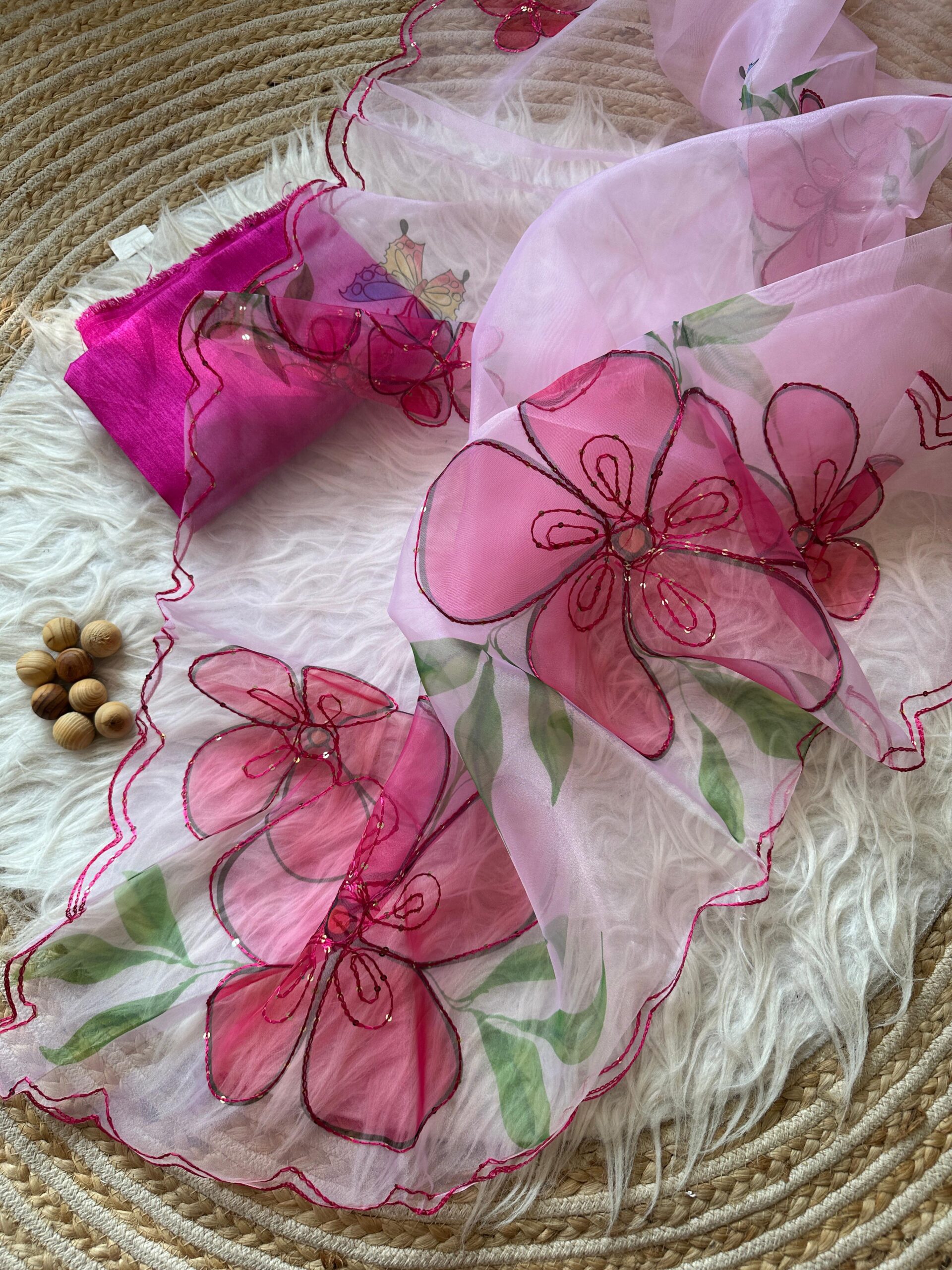 Our super light and soft Organza designer sarees are designed to give you a dazzling yet elegant look . This free falling extremely soft fabric with Floral printed all through the saree with Resham border and the body of the saree is hand embroidered with glass pearls. Perfect for your Soirees!!!