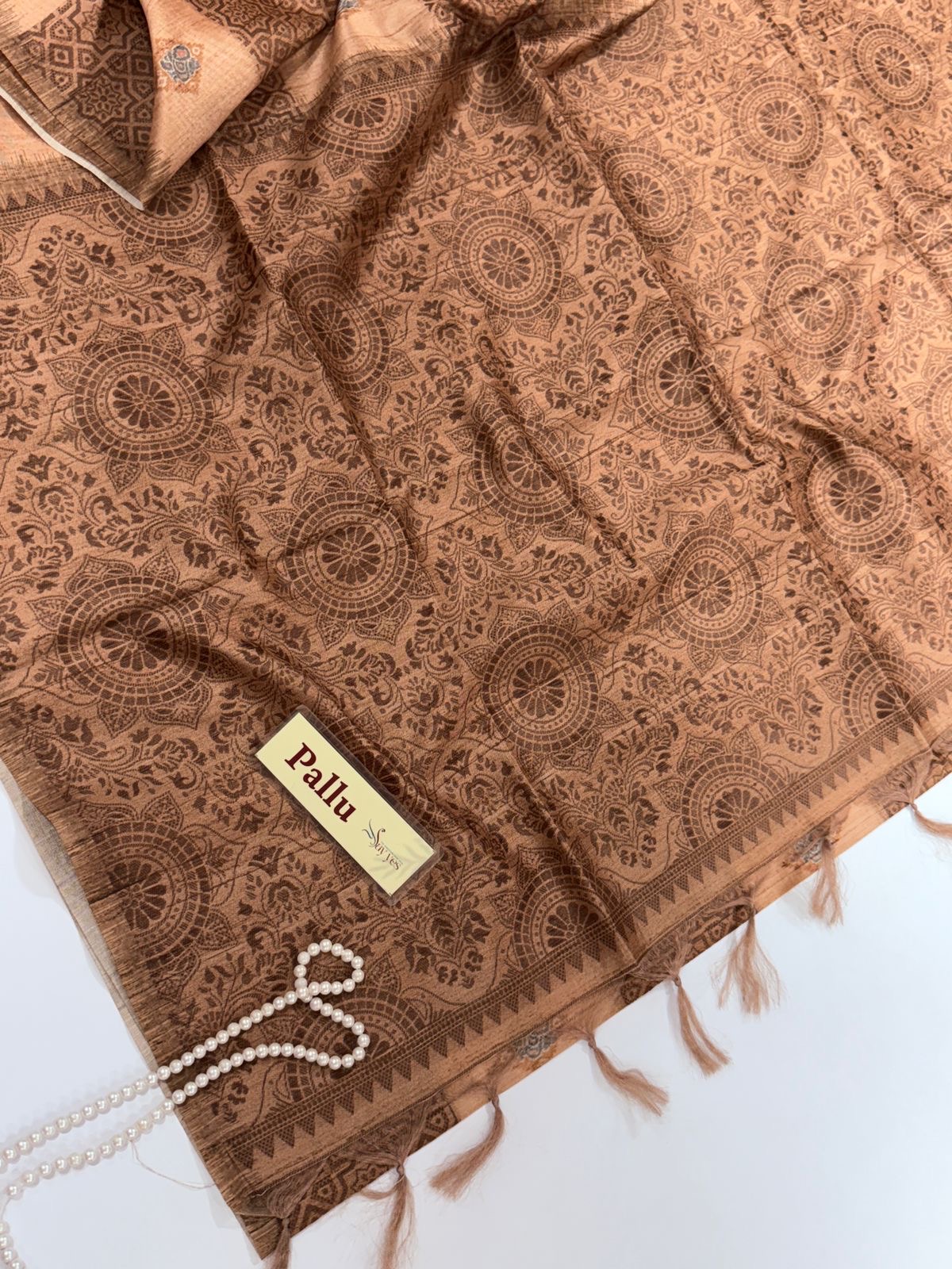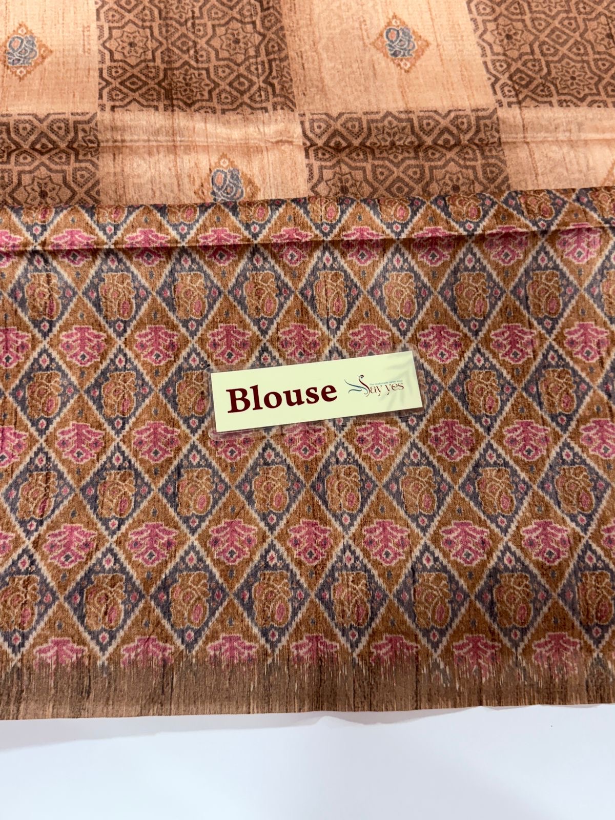 A masterpiece of earthy elegance, this jute silk saree features a checkered body woven with intricate geometric motifs in antique bronze and soft rose buttas that bloom gently across the fabric. The subtle sheen of jute silk lends a rustic yet refined charm, balancing structure with fluidity in its drape.