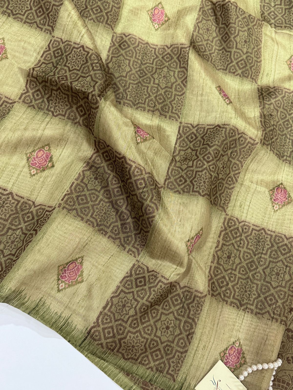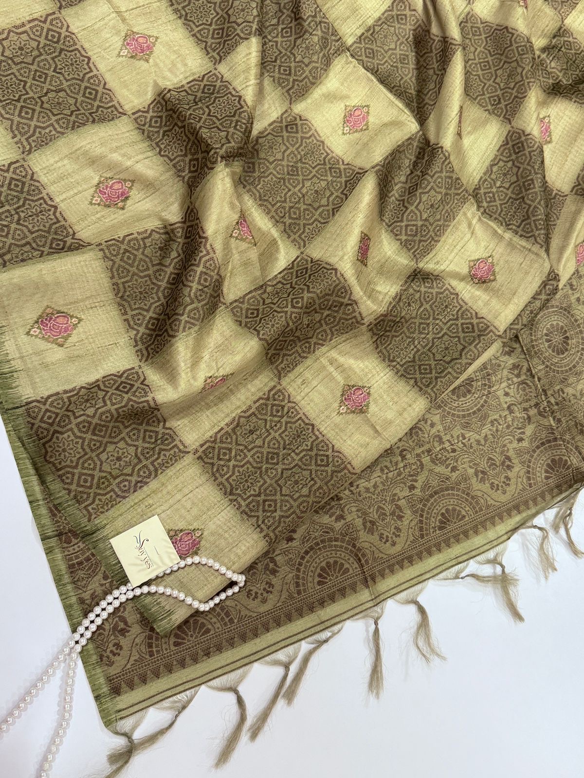 A masterpiece of earthy elegance, this jute silk saree features a checkered body woven with intricate geometric motifs in antique bronze and soft rose buttas that bloom gently across the fabric. The subtle sheen of jute silk lends a rustic yet refined charm, balancing structure with fluidity in its drape.