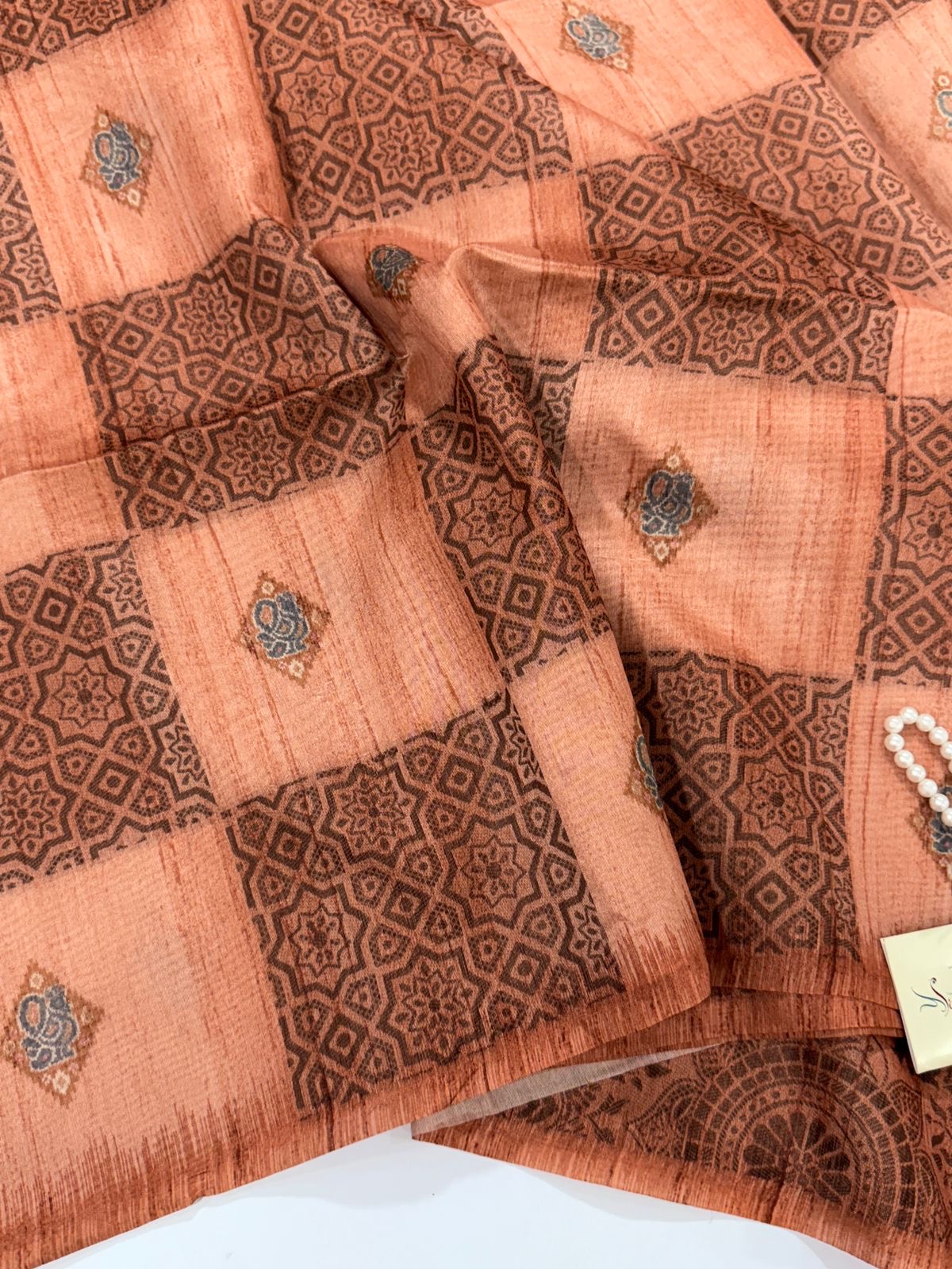 A masterpiece of earthy elegance, this jute silk saree features a checkered body woven with intricate geometric motifs in antique bronze and soft rose buttas that bloom gently across the fabric. The subtle sheen of jute silk lends a rustic yet refined charm, balancing structure with fluidity in its drape.