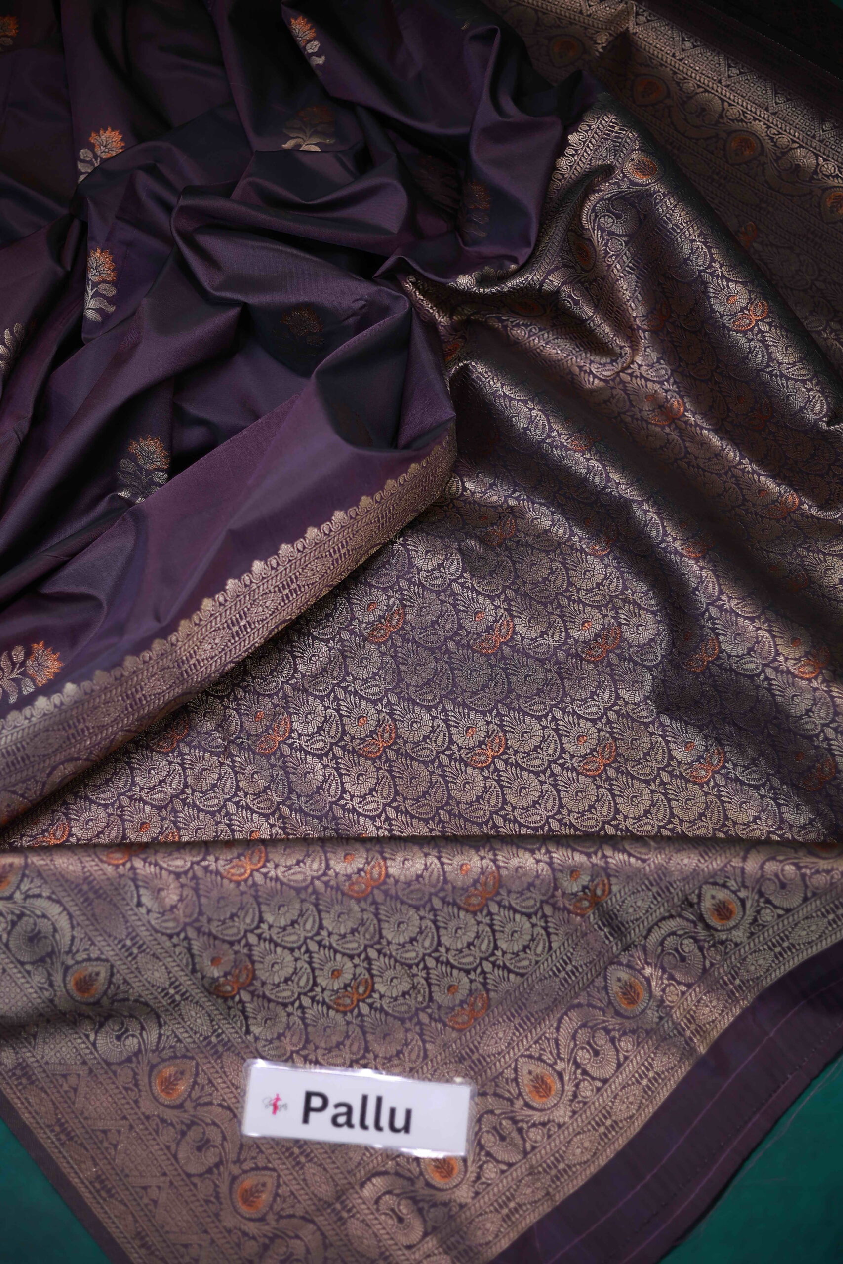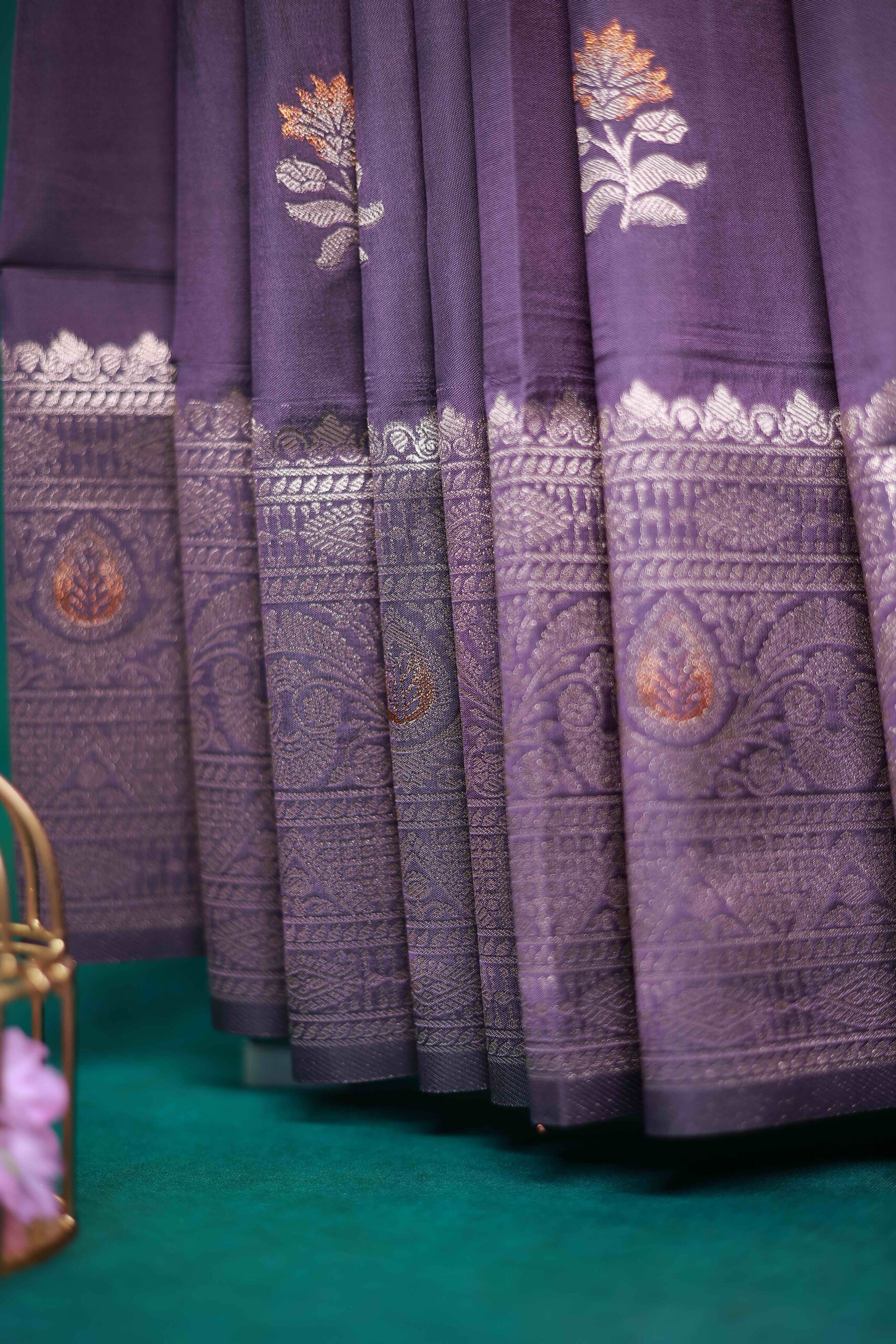 Padmavati is a sophisticated and regal saree, featuring a Royal Amethyst to convey its deep, luxurious purple hue with a regal touch. adorned with intricate golden zari work. The exquisite floral and paisley motifs along the border and pallu exude timeless charm, while the delicate embroidery on the body adds a touch of grace. This saree is perfect for grand occasions, reflecting opulence and tradition in every fold. Draping yourself in this masterpiece will make you feel like royalty, capturing the essence of luxury and cultural heritage.