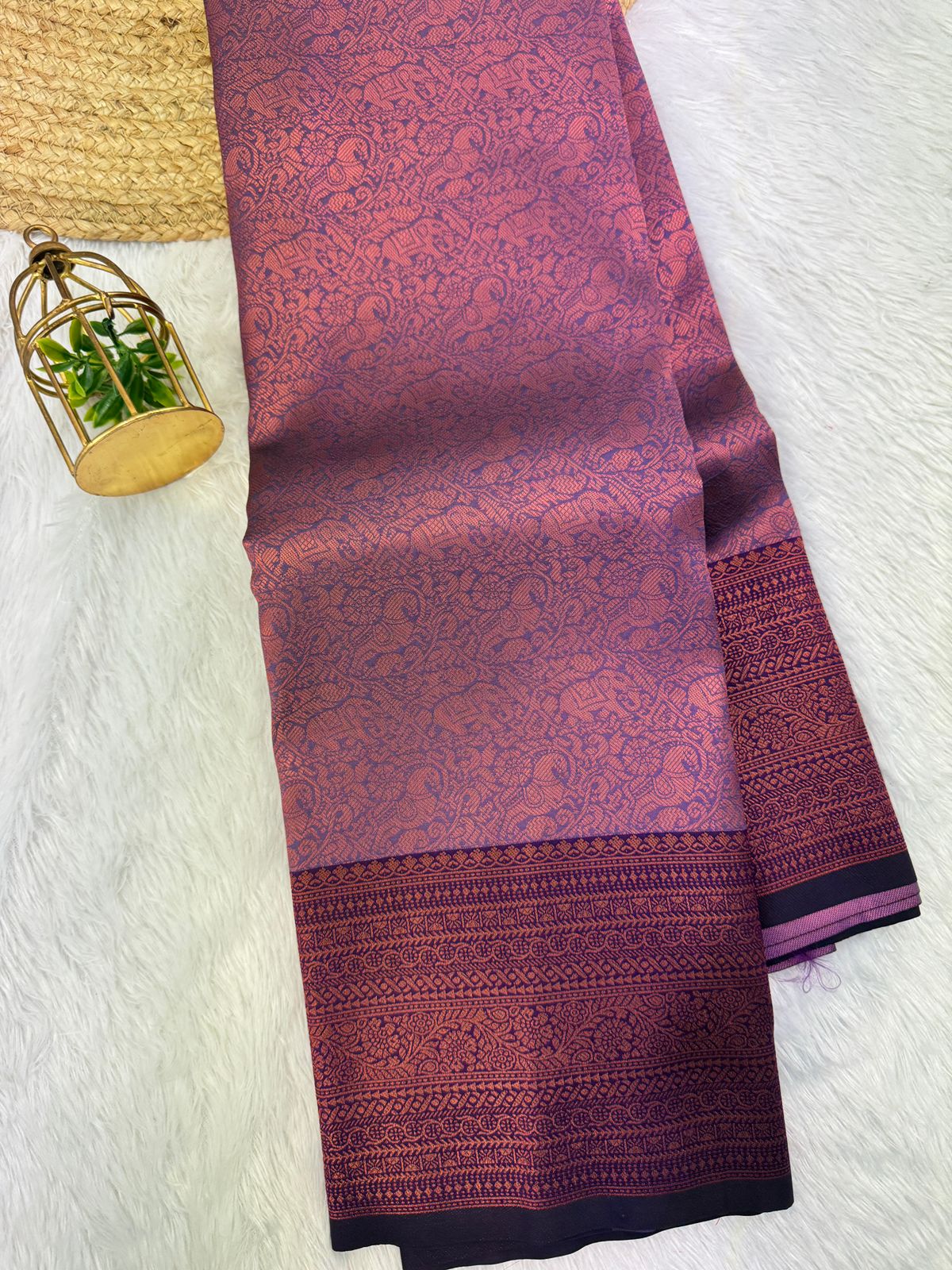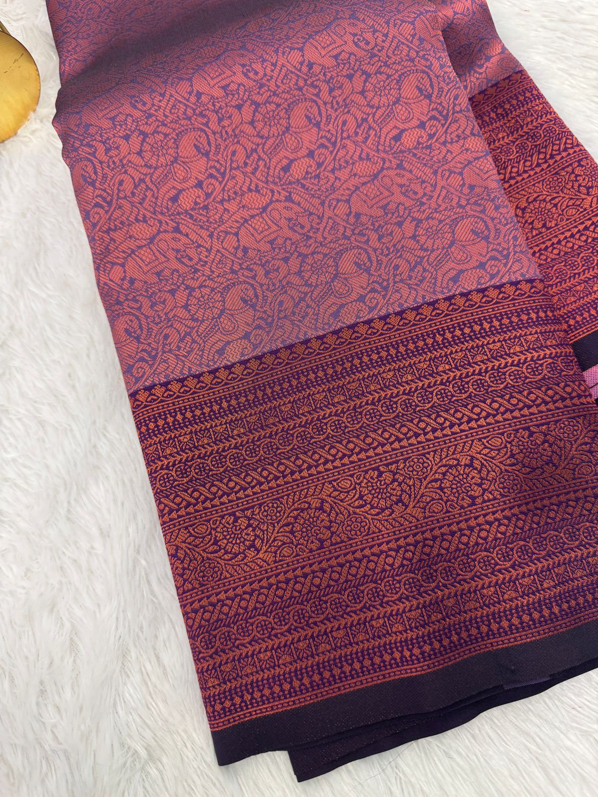 We have ingeniously chosen this piece of soft semi silk which is a perfect confluence of traditional anime zari thread woven on the body and a rich pallu in contrast elegantly to suit every Indian Occasion. Perfect to wear for Weddings and auspicious days.