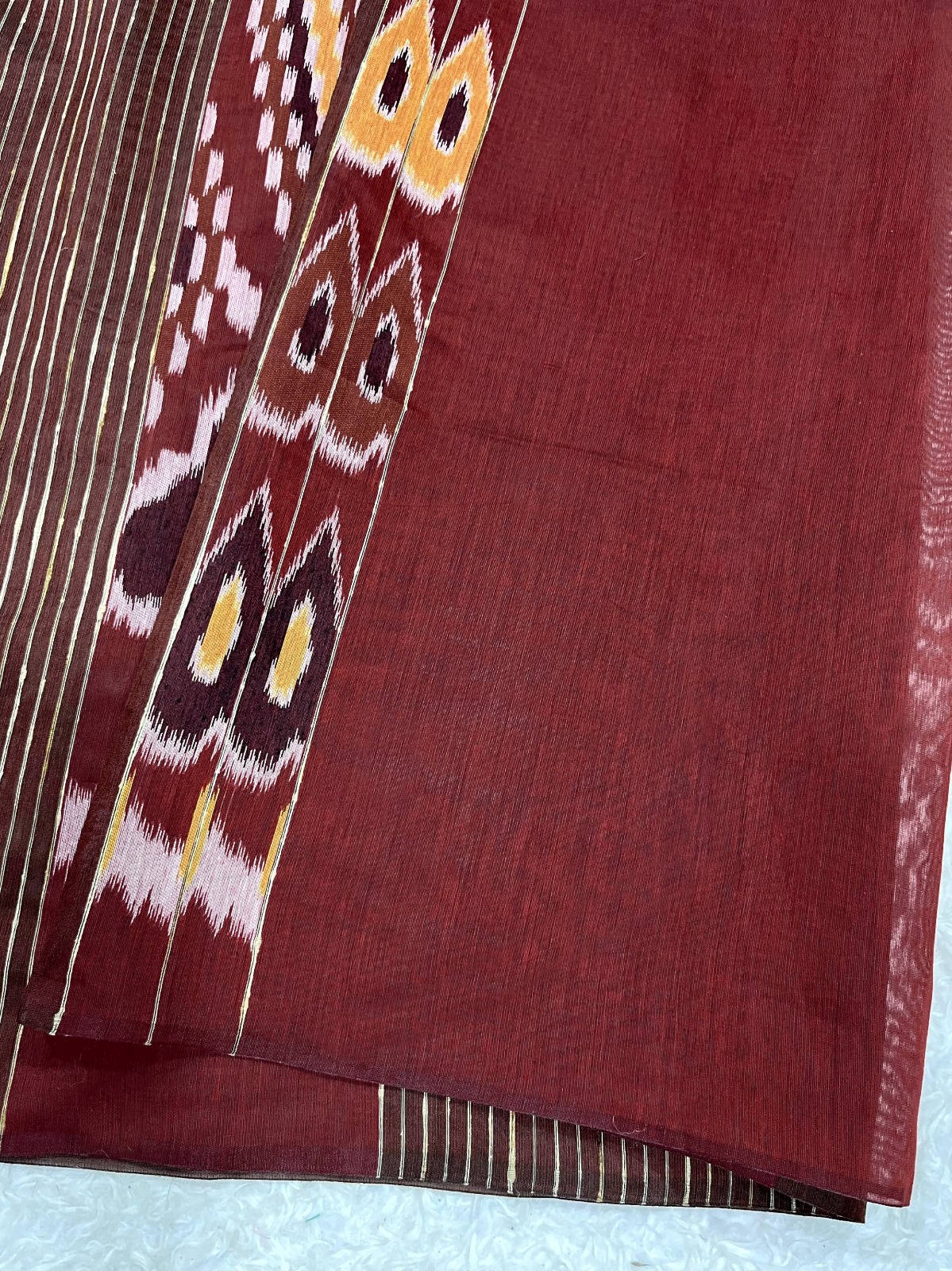 This exquisite handwoven Ikat saree showcases a stunning blend of traditional craftsmanship and vibrant colors. The saree features a rich, deep purple base adorned with intricate Ikat patterns in green, yellow, and white, creating a captivating contrast. The patterns include a mix of geometric and floral designs, adding a touch of elegance and sophistication.