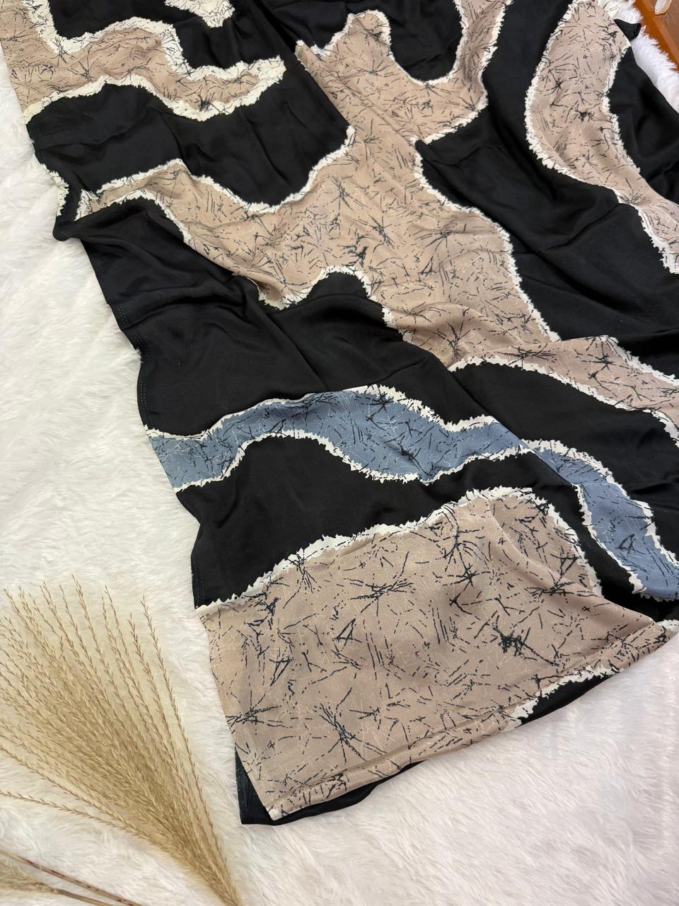 This exquisite modal silk saree is a masterpiece of elegance and tradition. The fluid drape of modal silk enhances the luxurious feel, making it effortlessly graceful. Featuring a mesmerizing Ajrakh-inspired block print, the intricate motifs in earthy hues blend heritage with contemporary aesthetics. The pleats are adorned with striking multicolored stripes, adding a bold contrast to the intricately detailed pallu. The soft yet rich texture ensures comfort while exuding timeless sophistication, perfect for festive occasions, cultural gatherings, or an elegant evening affair.