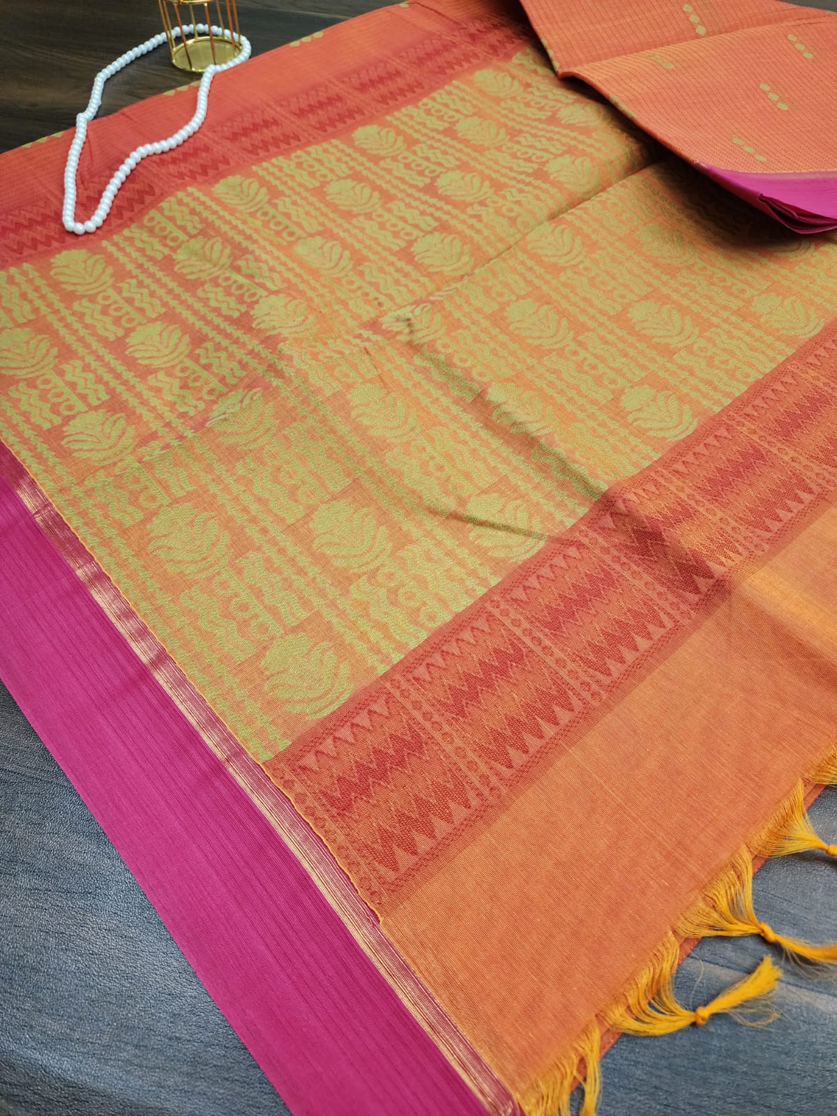 Introducing our exquisite handloom cotton saree, a fusion of tradition and modern elegance.