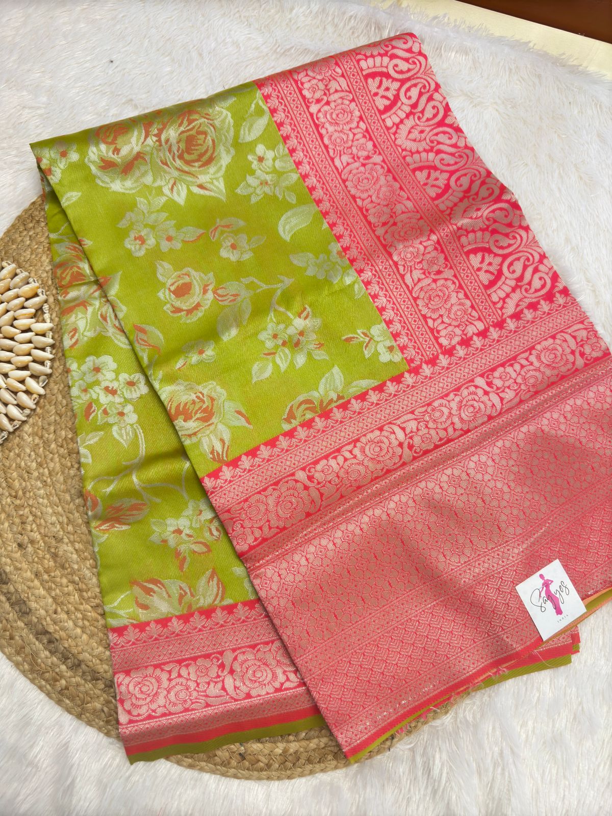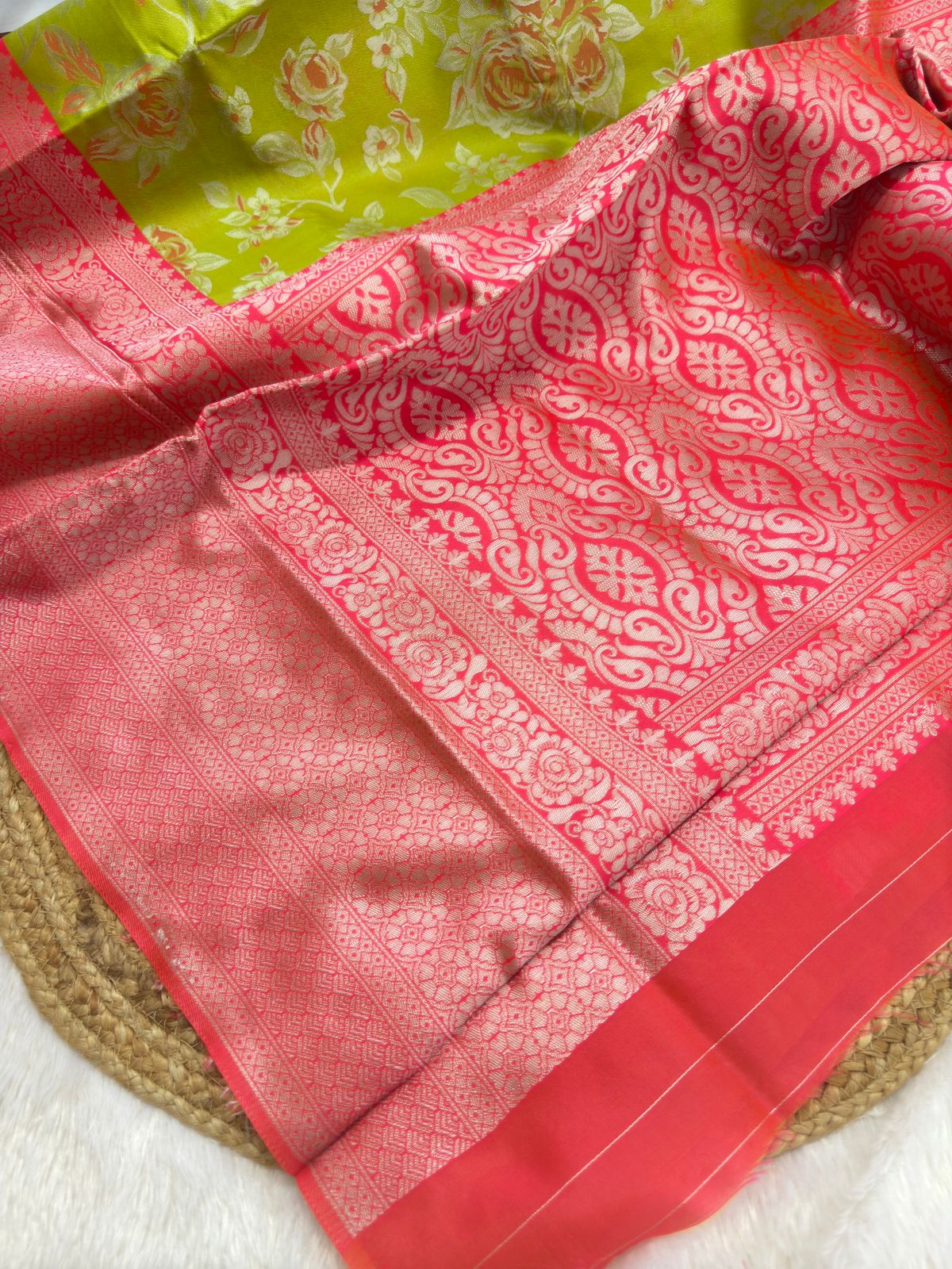 This vibrant saree is a celebration of elegance and grace. The lime-green body is adorned with subtle floral motifs, exuding a fresh and radiant charm. Paired with a striking pink zari border featuring intricate floral patterns, this saree brings a delightful contrast that is both bold and beautiful. The pallu extends the pink zari detailing, adding a touch of opulence to the design.