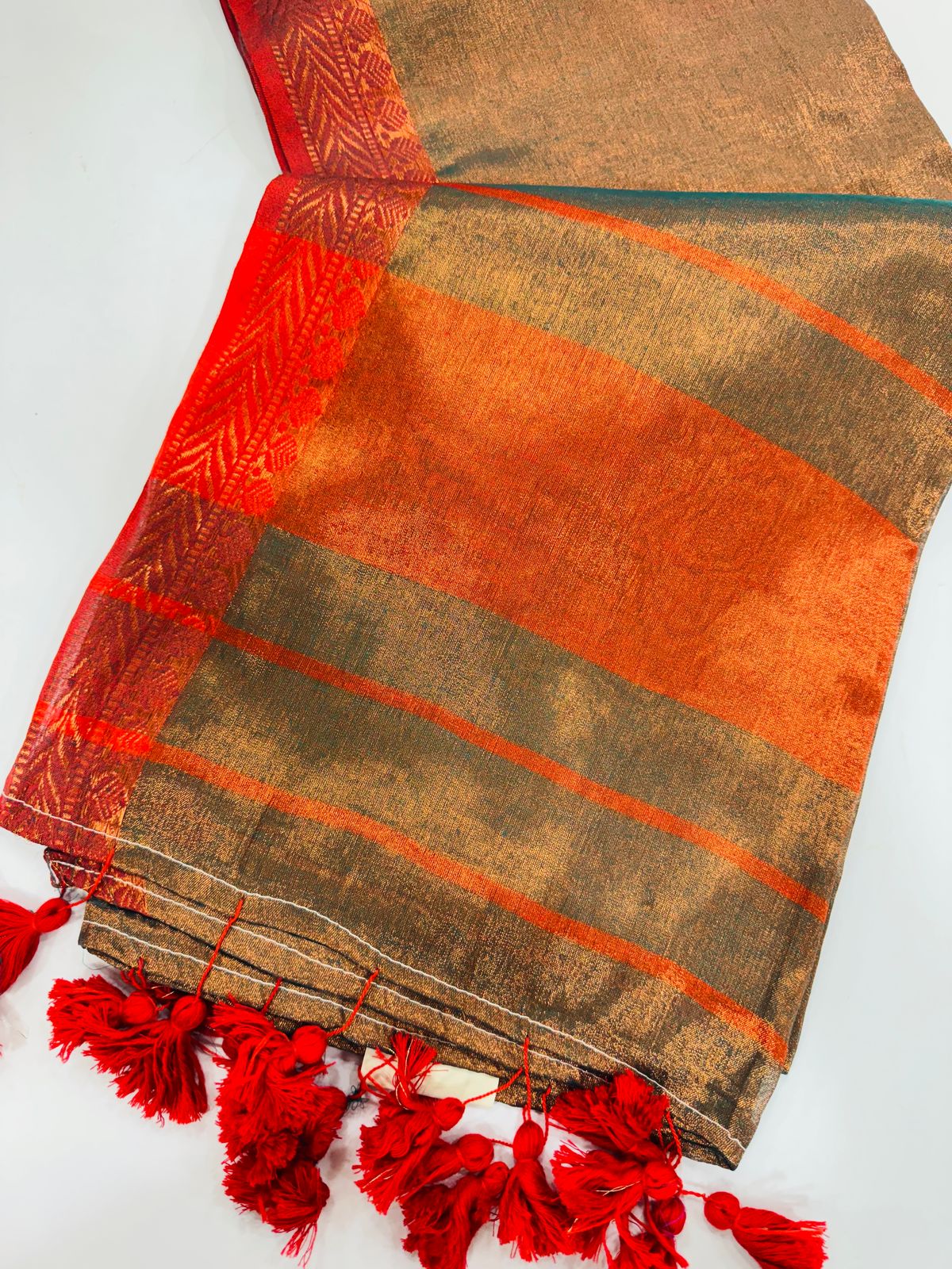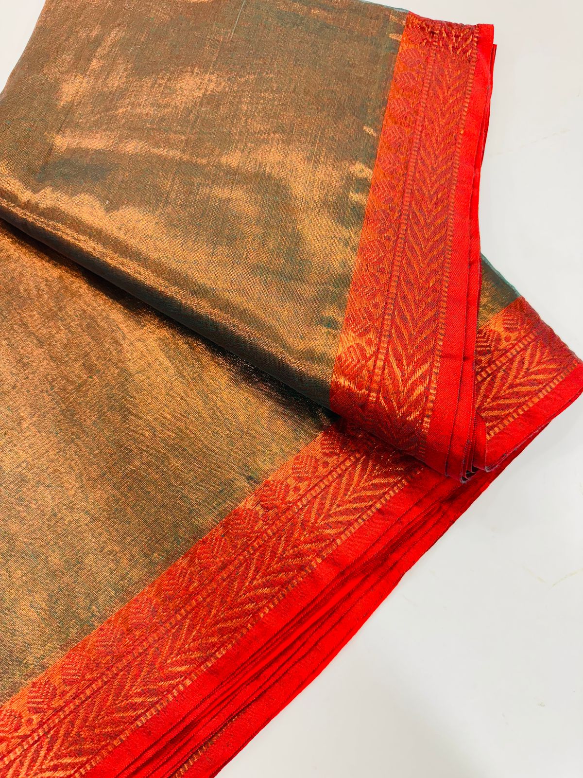 This exquisite handloom tissue Mul cotton saree, aptly named Raaga, for the way it flows captivating blend of two tones that shimmer elegantly under light. Woven with care, the tissue Mul cotton fabric offers a lightweight and breathable feel, making it perfect for both festive occasions and casual elegance. The saree’s delicate fringed edges add a touch of tradition, while its luxurious texture and iridescent finish bring a modern sophistication to the ensemble. A true masterpiece of artisanal craftsmanship, this saree is as comfortable as it is stunning, embodying the timeless grace of handloom artistry.